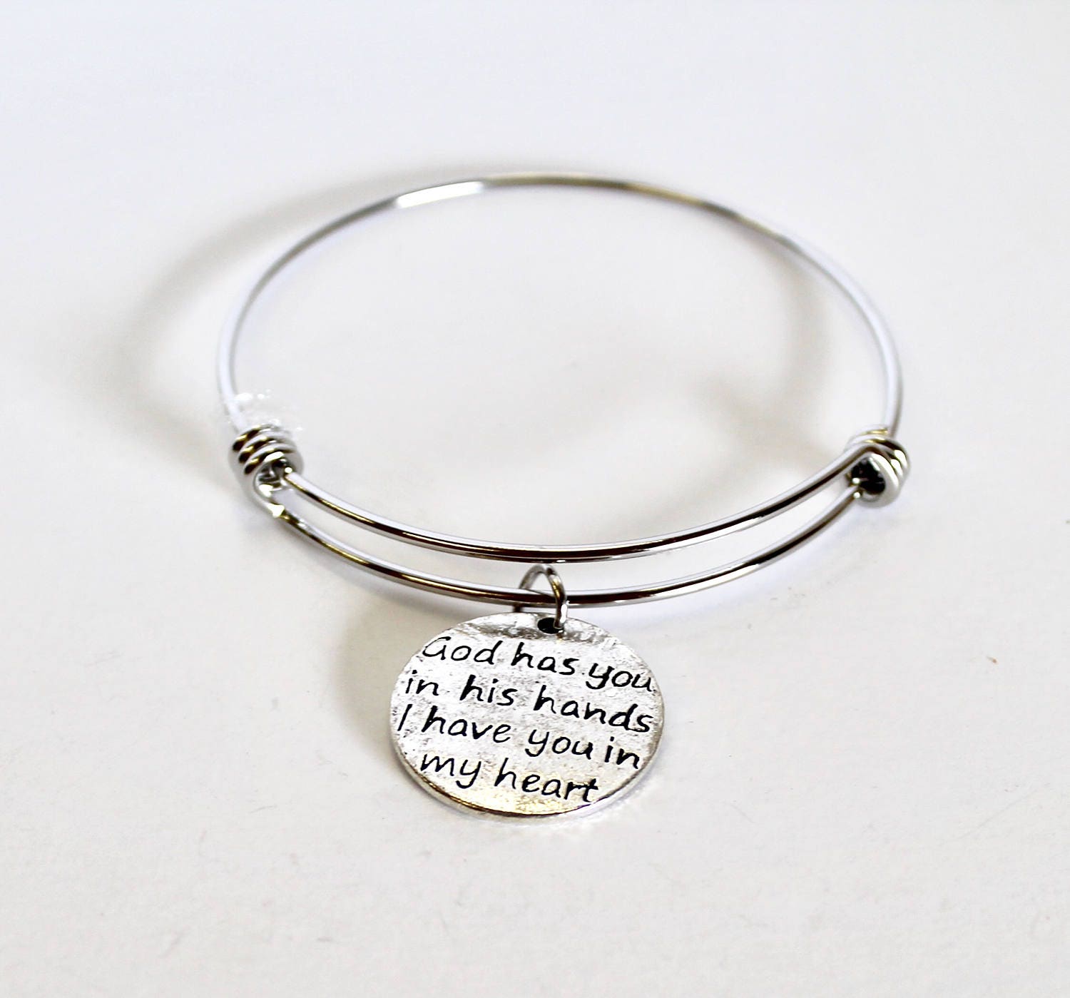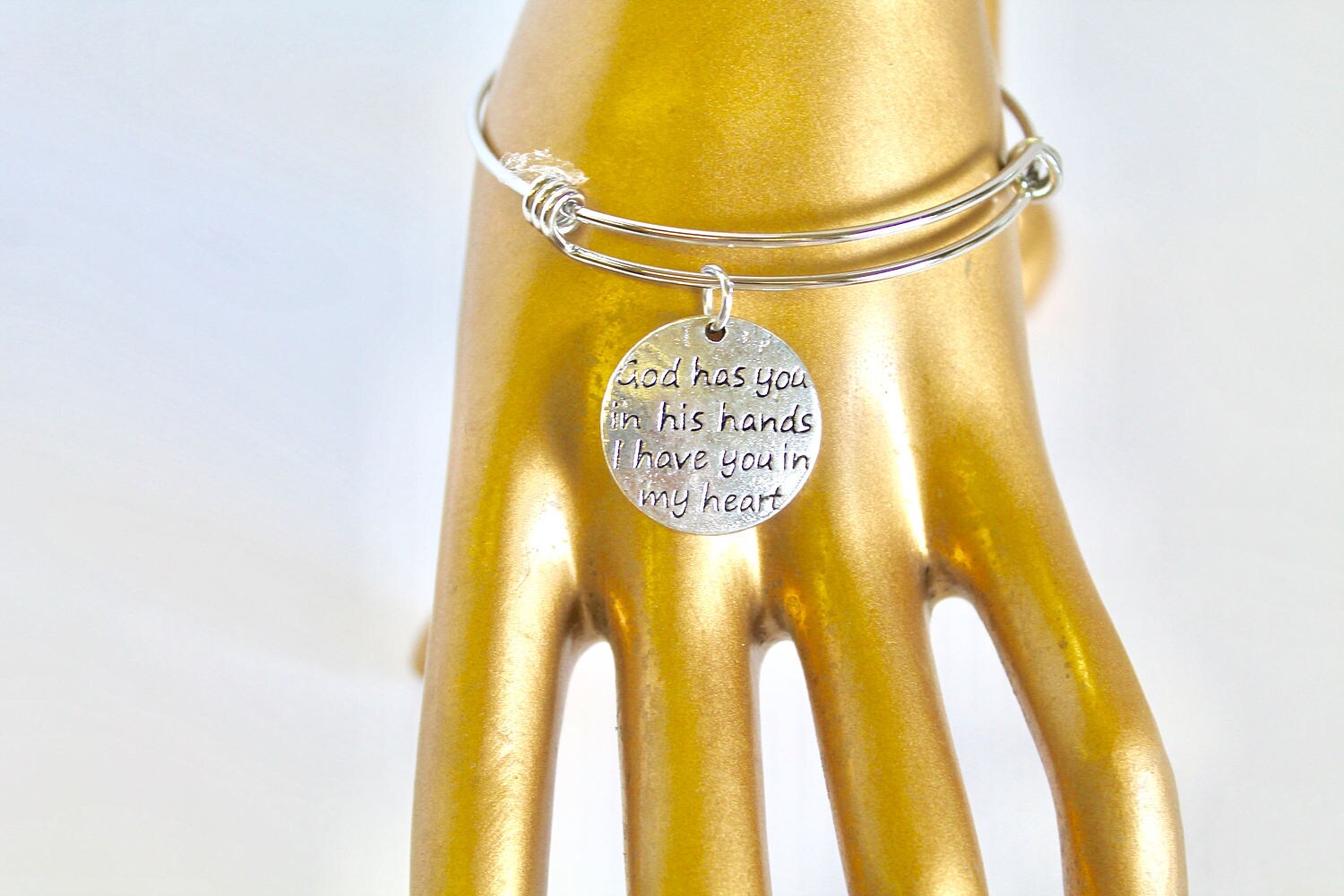 This is a great inspirational expanding bangle charm bracelet with a silver tone charm that says "God Has You In His Hands I Have You In My Heart". Additional charms can also be added through the "Add A Charm" listing in my shop or through a custom order request. This bracelet is made of stainless steel to withstand regular wear without tarnishing or changing colors.