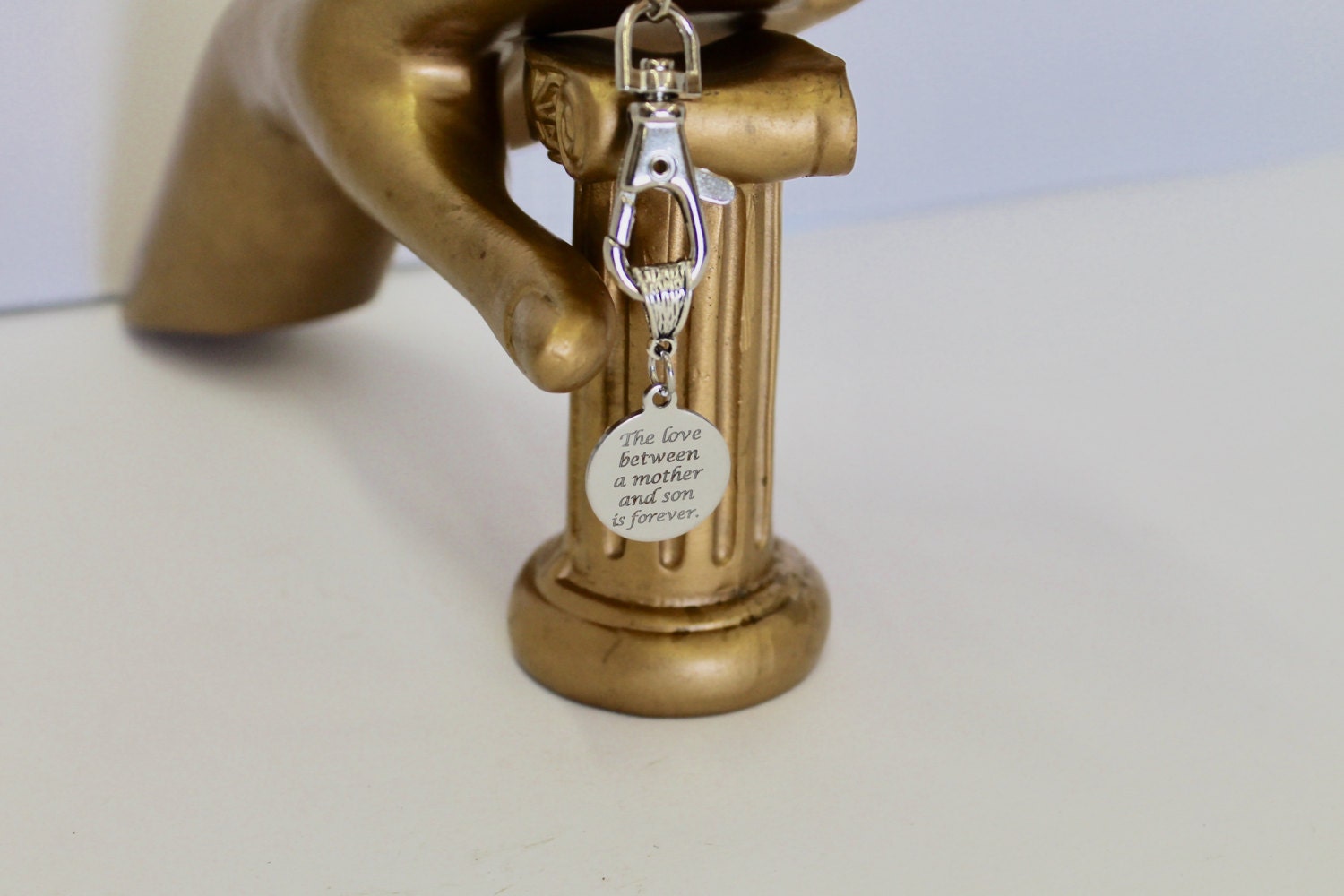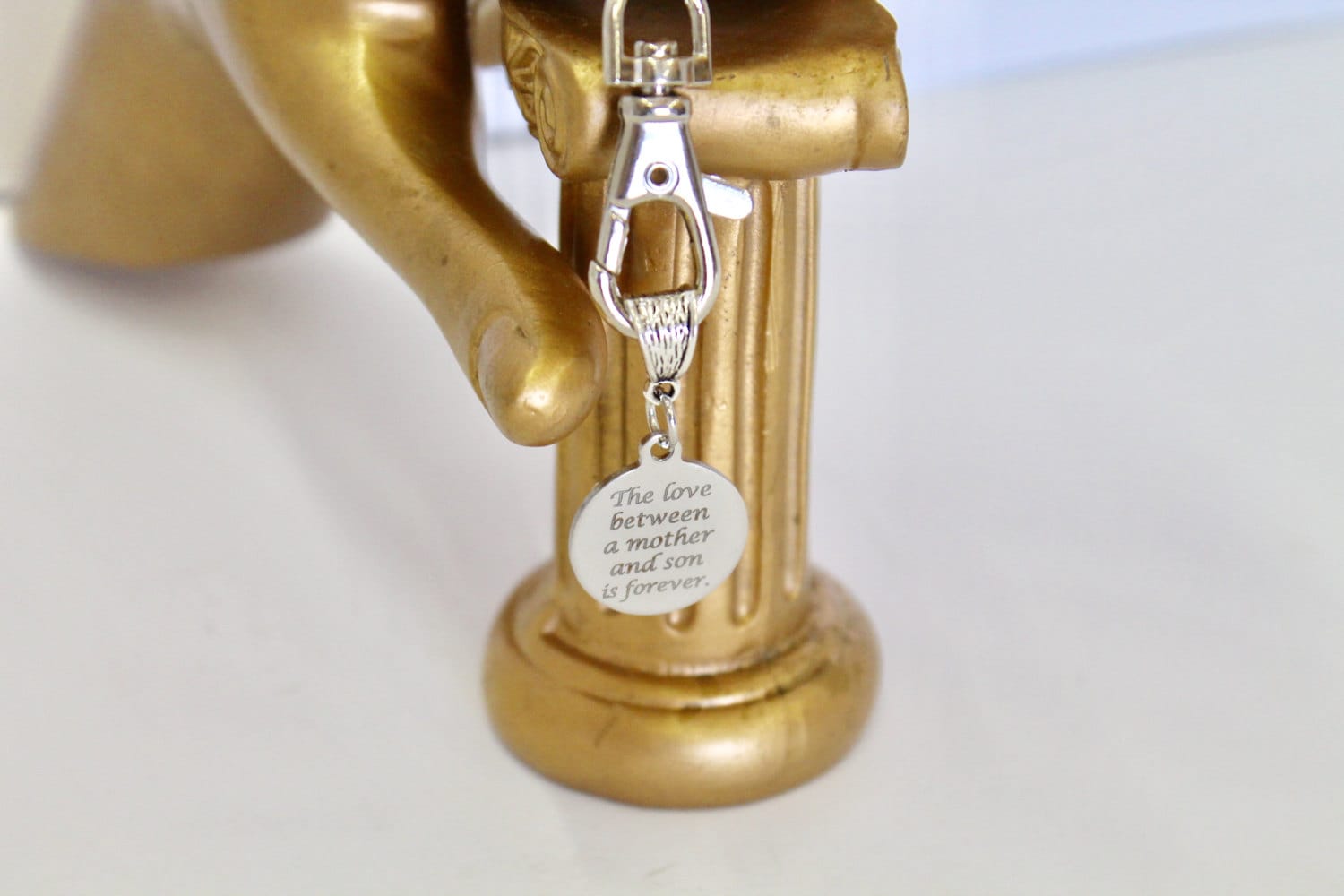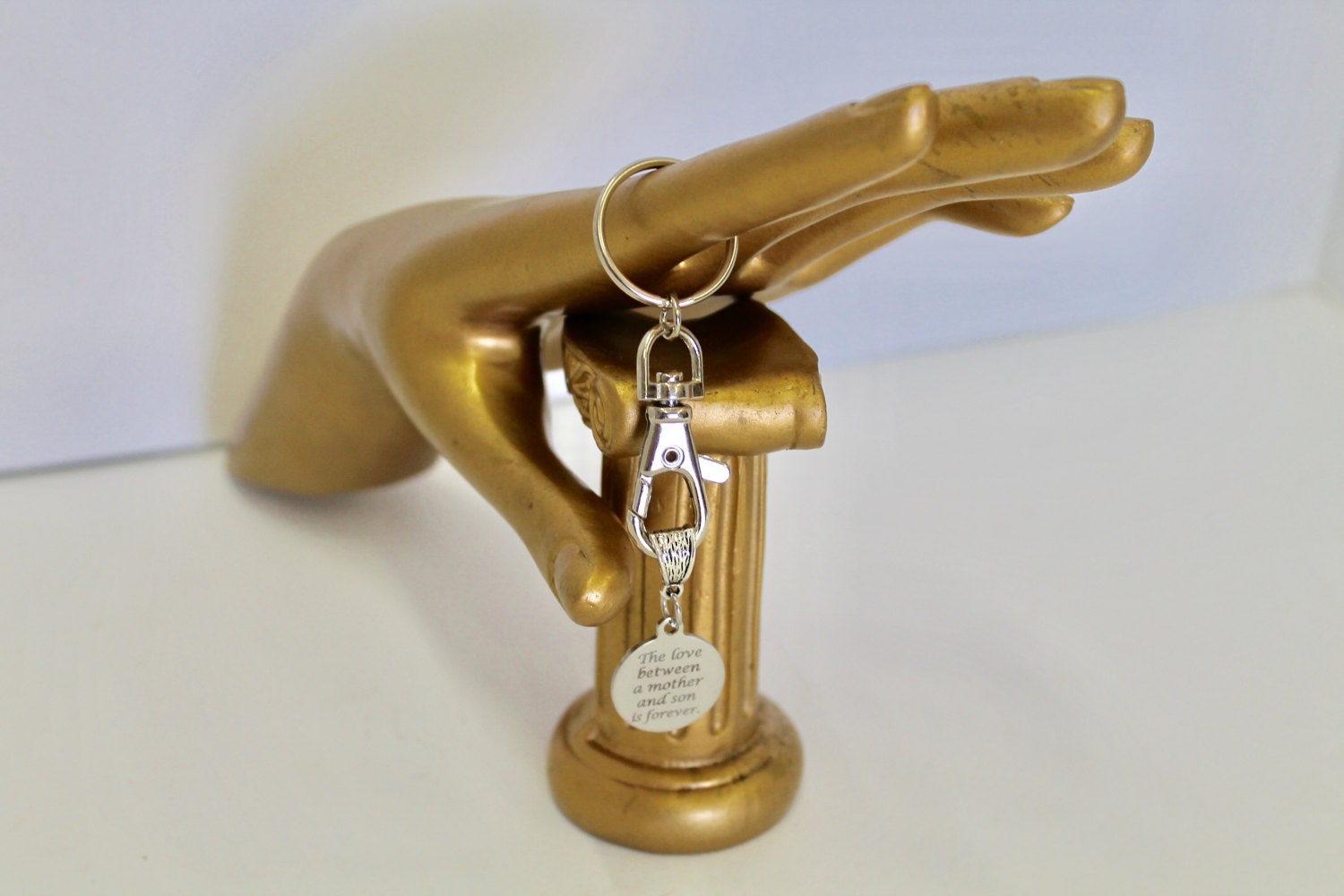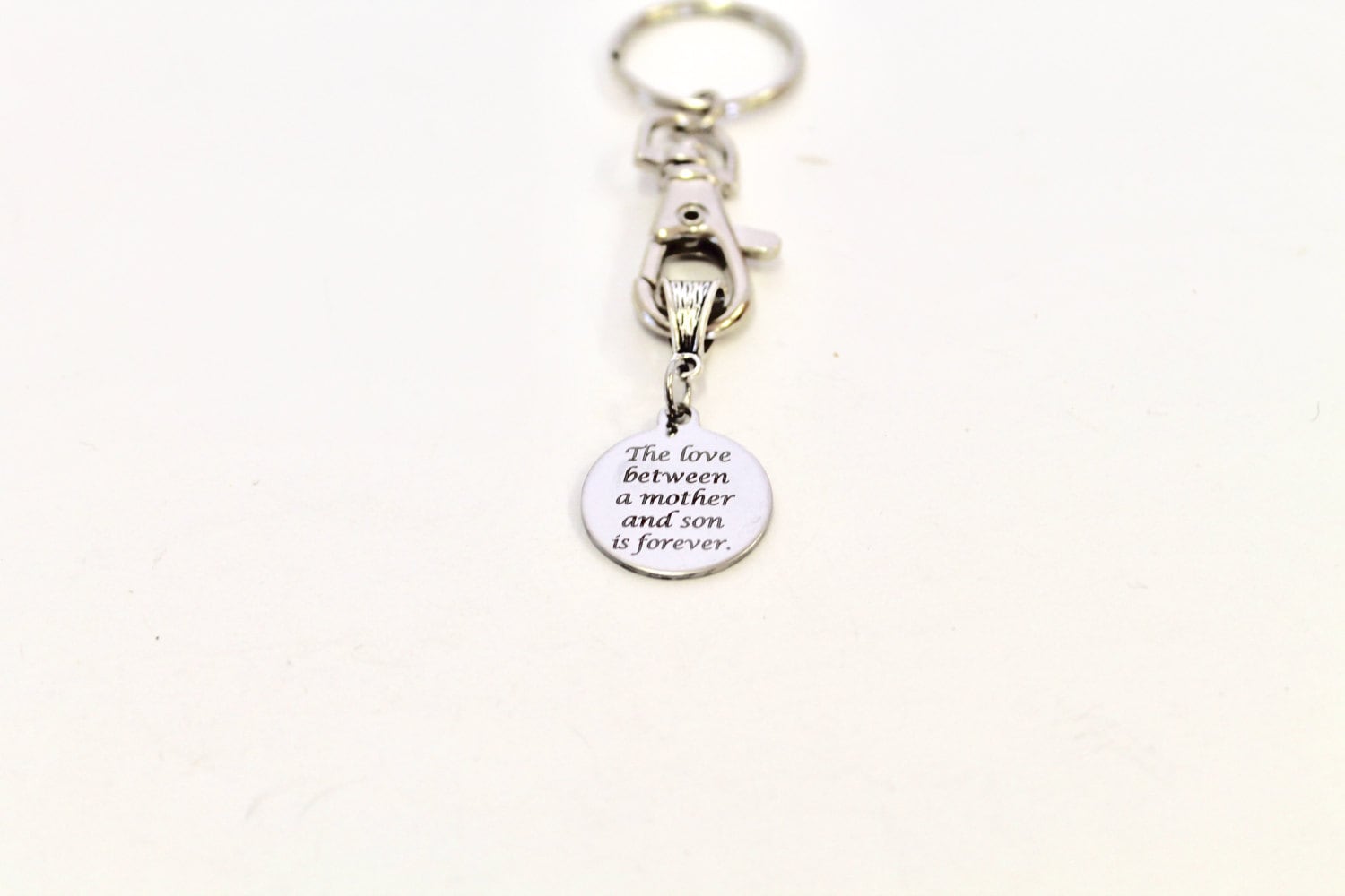This keyring has a laser engraved stainless steel charm that says "The love between a mother and son is forever."