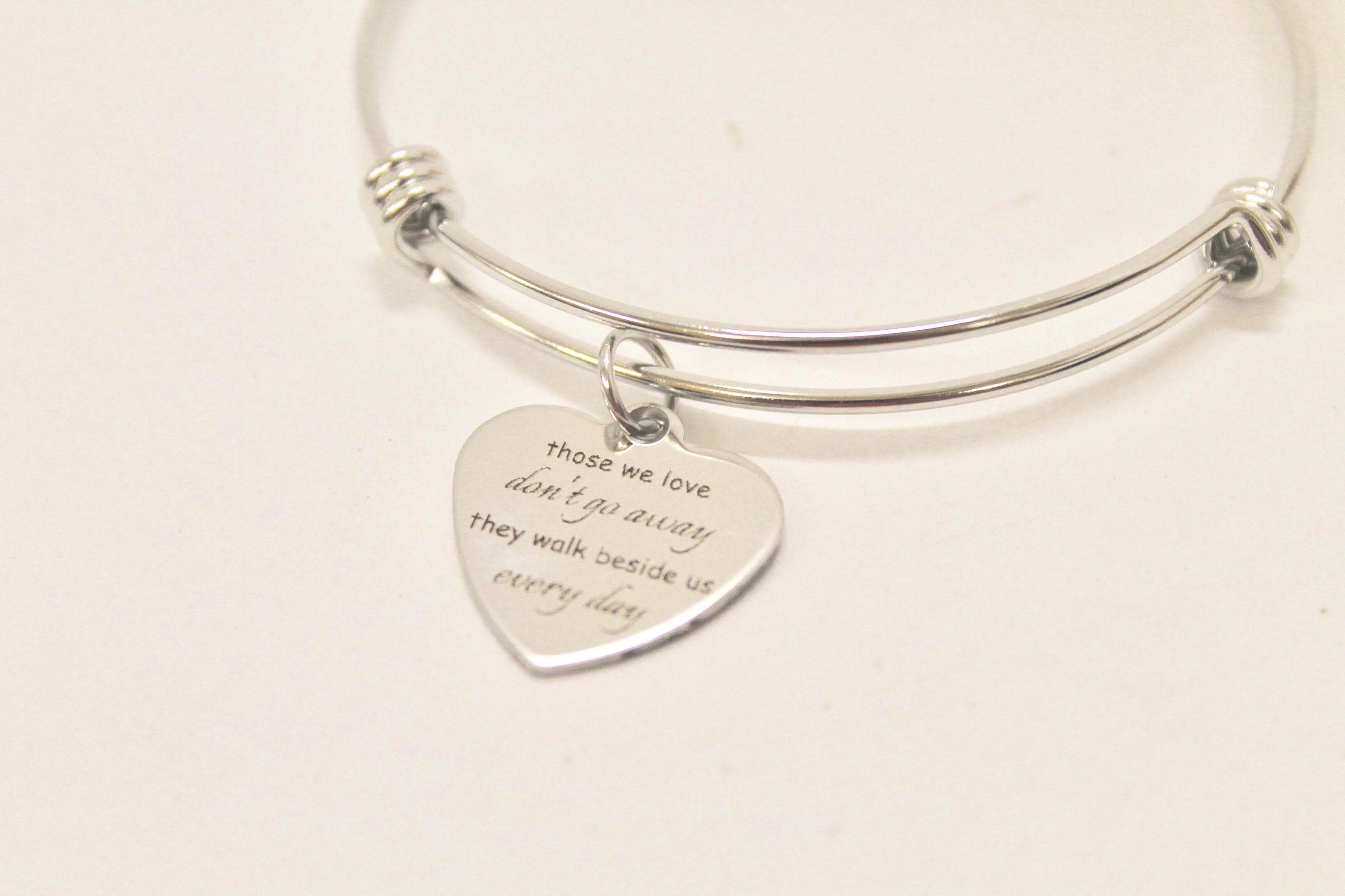 This is a beautiful bangle bracelet with a laser engraved stainless steel charm that has the saying "Those We Love Don't Go Away They Walk Beside Us Every Day" on it. This Is a simple but beautiful way to remember someone who is no longer with you. It would also be a great sympathy gift. The bracelet is made of stainless steel to withstand regular wear without tarnishing. It expands easily to fit on any wrist size.