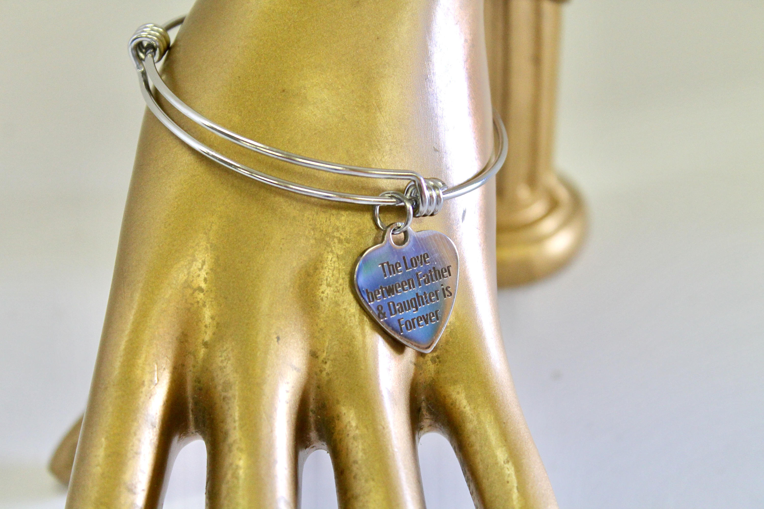 This bracelet has a stainless steel laser engraved charm that says "The love between Father & Daughter is Forever". This would be a great gift to your daughter on her wedding day or any day you want to reminder her that your love for her is forever.