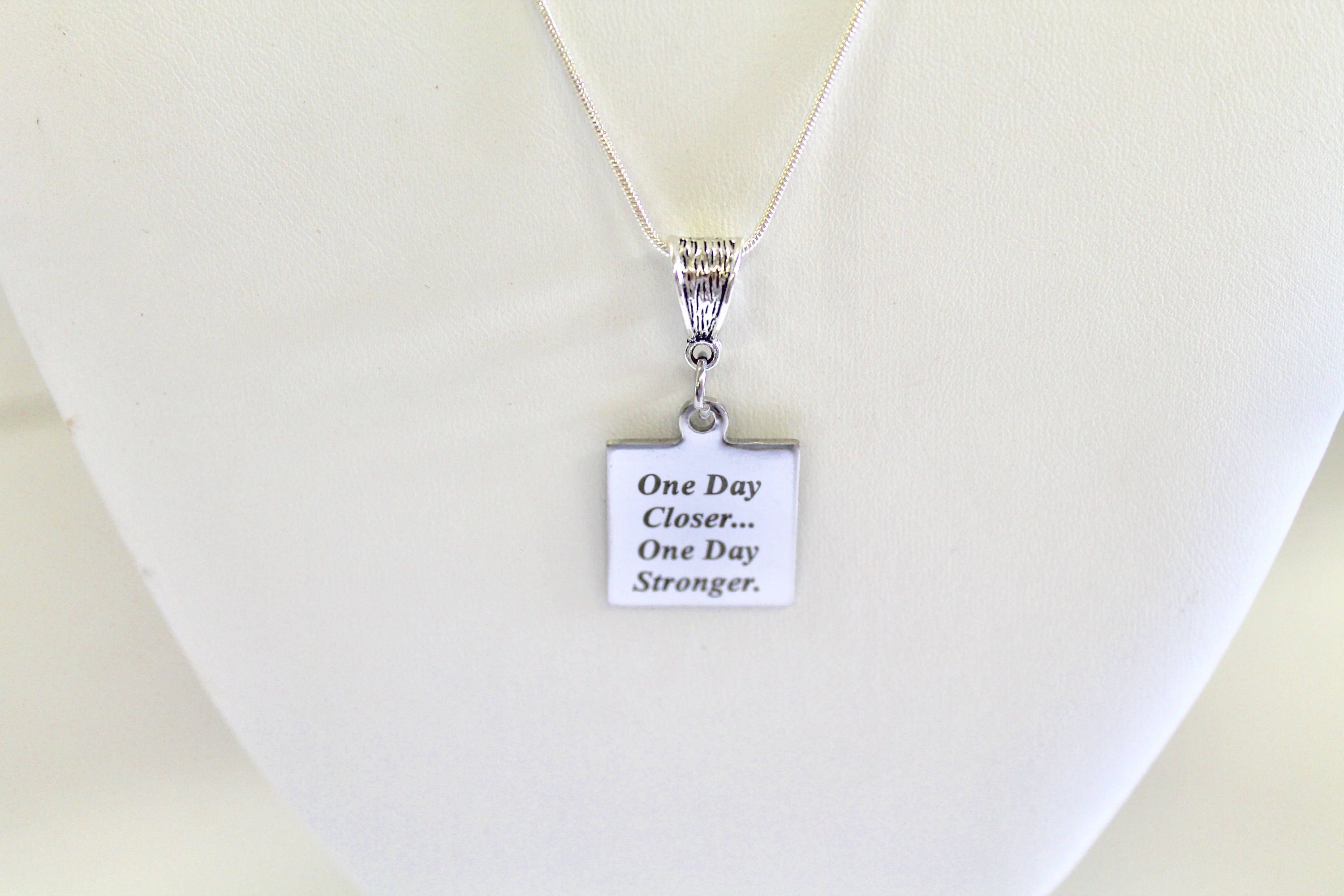 This beautiful necklace has a laser engraved stainless steel heart pendant on a sterling silver plated snake chain. The pendant has "One day closer one day stronger" on it. This would be a great encouragement gift to give someone that is working toward a major goal!