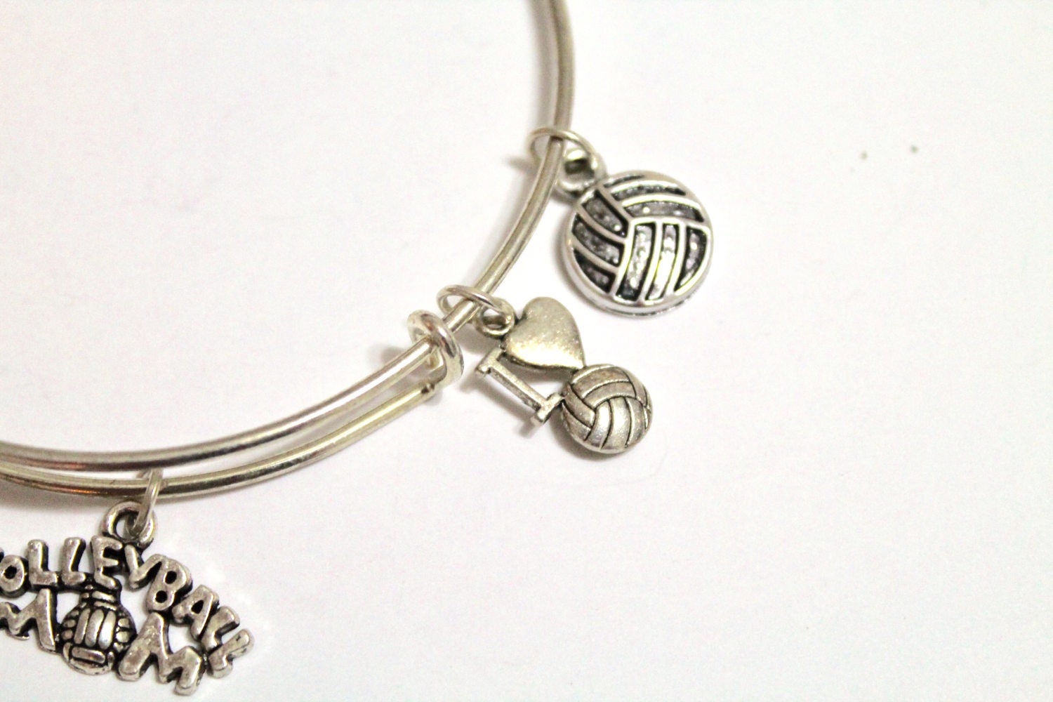 Show your love for your favorite volleyball player with this expanding volleyball mom bangle charm bracelet. This bracelet has silvertone charms and is made of stainless steel to withstand regular wear without tarnishing or changing colors. The bracelet can be customized to be worn by any family member or the volleyball player herself!
