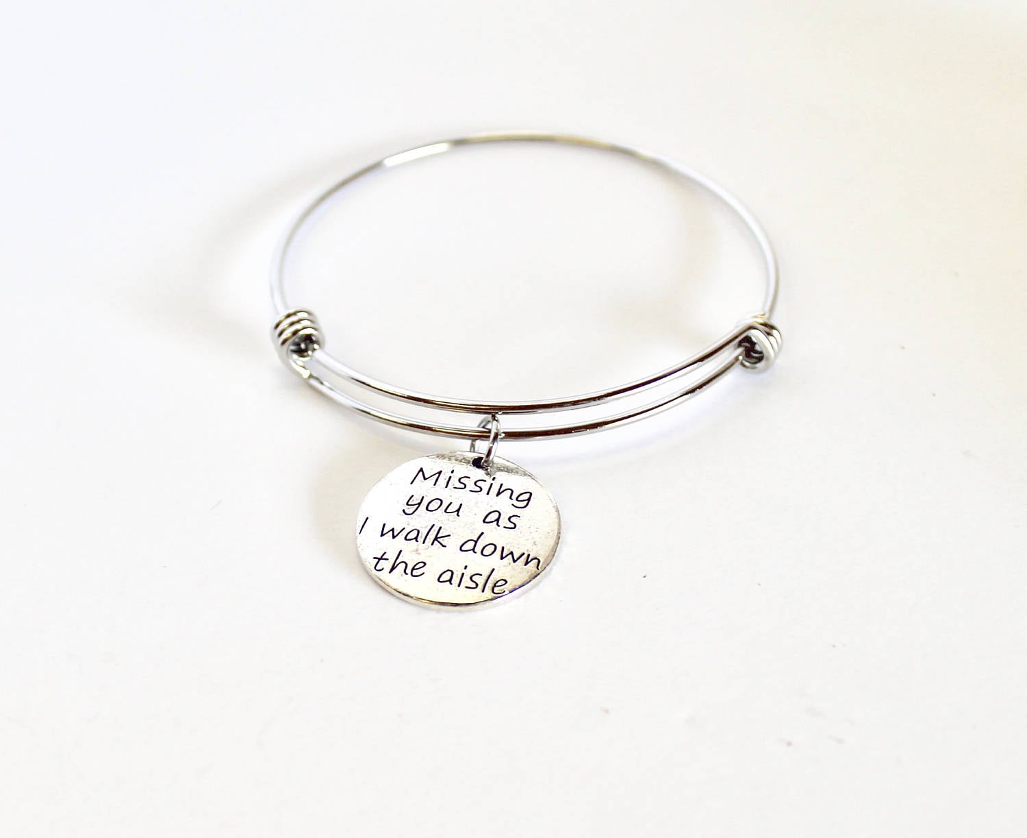 This is a beautiful bangle bracelet with a silver tone charm that says "Missing You As I Walk Down The Aisle". This would be a great bracelet to wear on your wedding day in rememberance of your mom or dad. It is available in your choice of either silver tone metal or stainless steel (shown) and expands to easily fit on any wrist size.