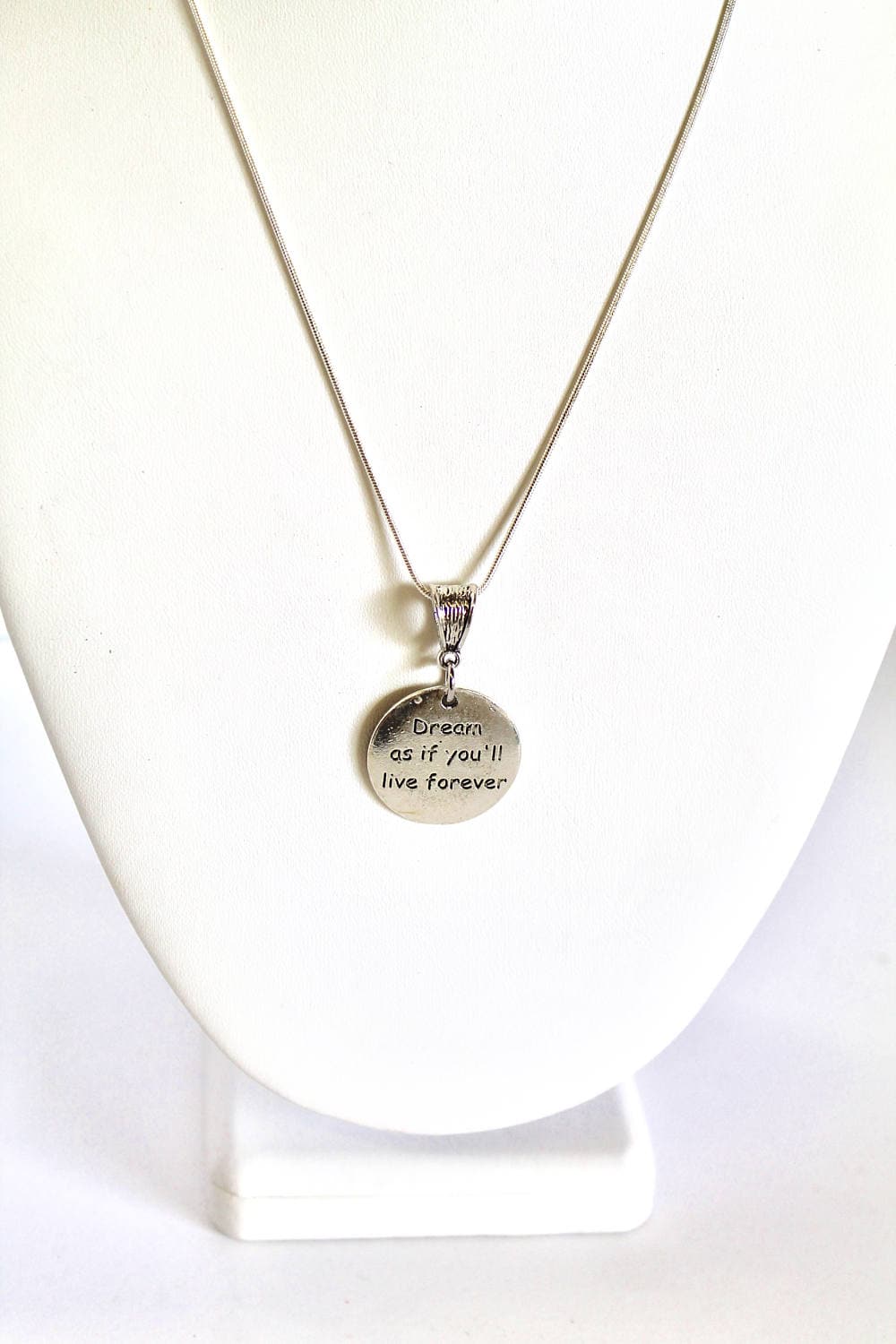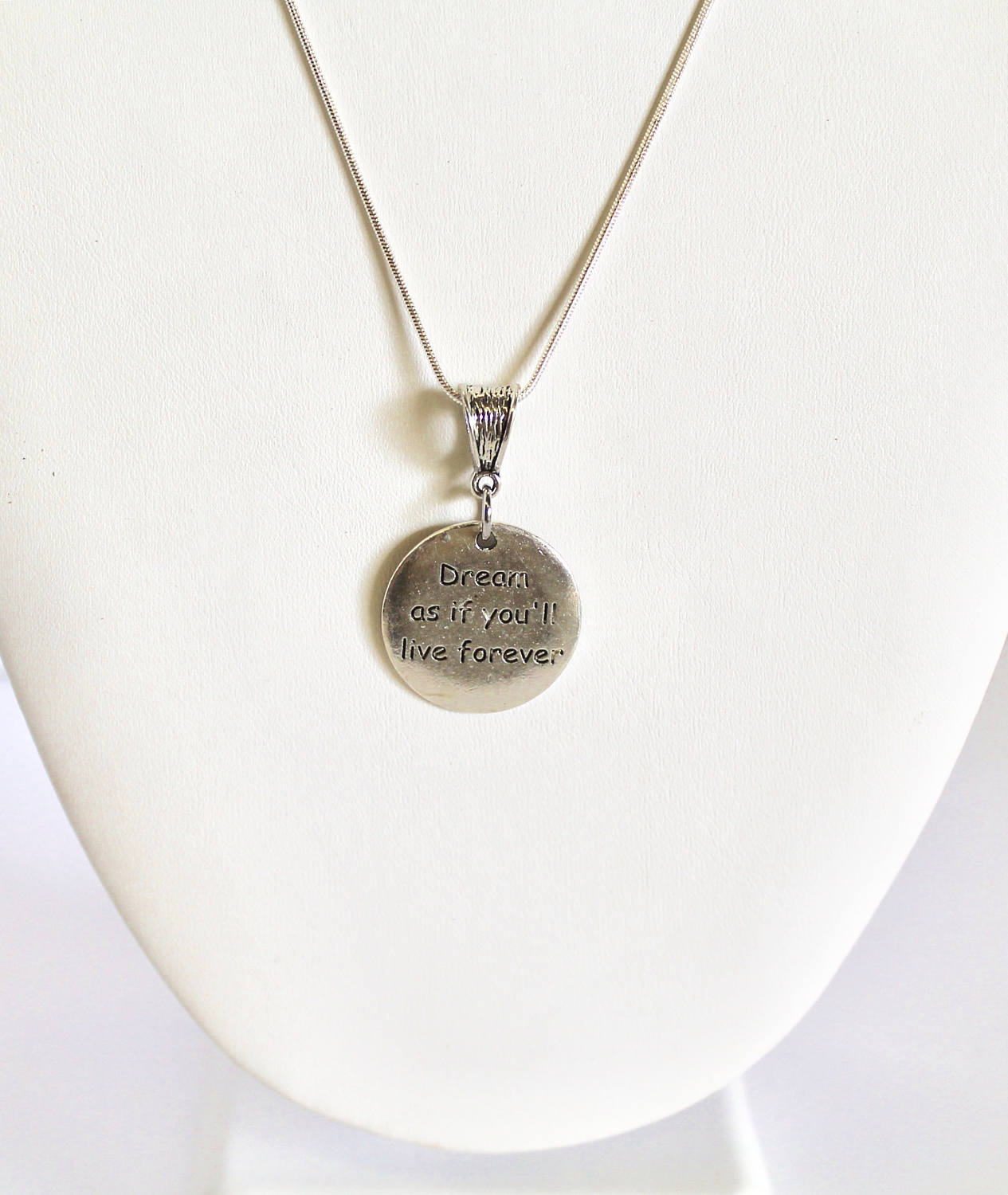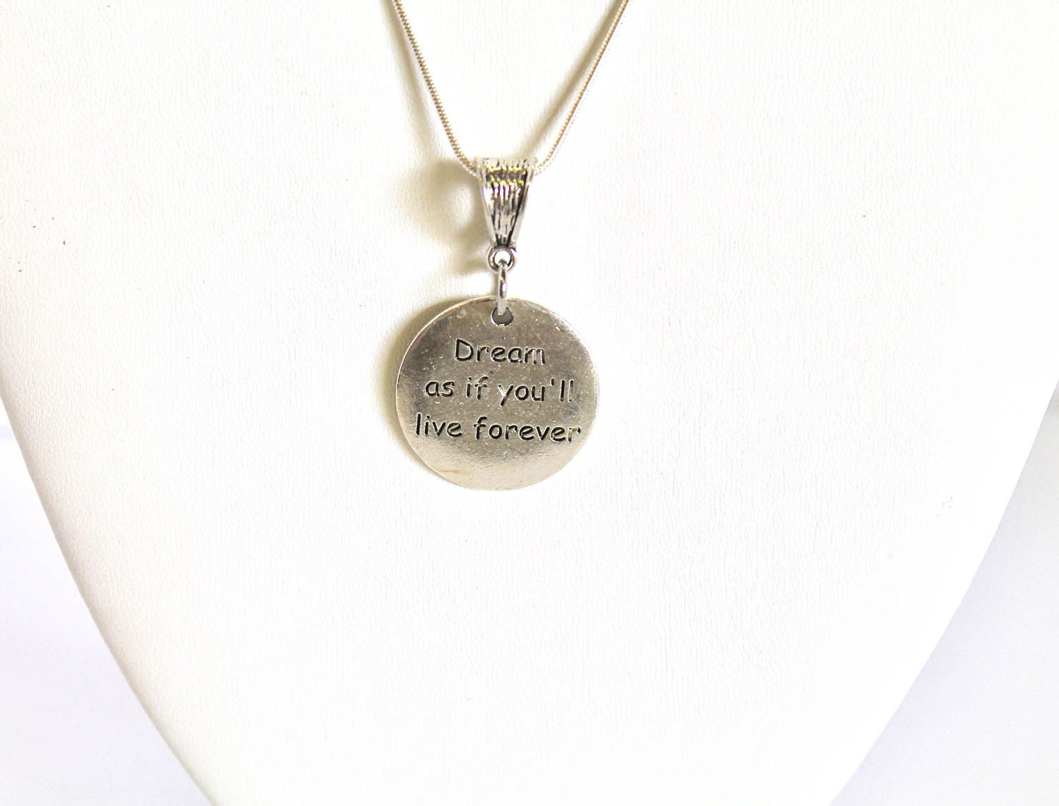 This is a beautiful silver tone pendant with the saying "Dream As If You'll Live Forever" on a sterling silver plated snake chain. This would make a great motivational and inspiring jewelry gift. It would also be a great graduation gift to remind the graduate to Dream Big! This pendant is available on your choice of 16, 18, 20, 22, 24, 26, 28 or 30 inch chain.