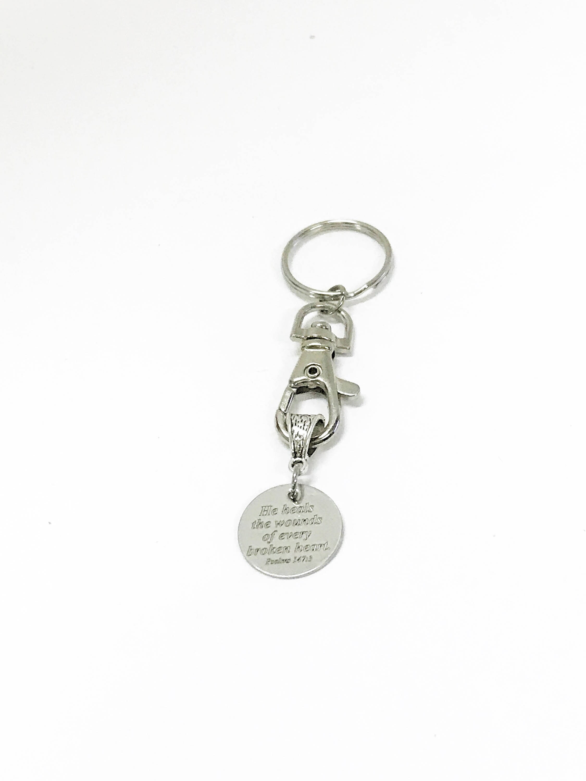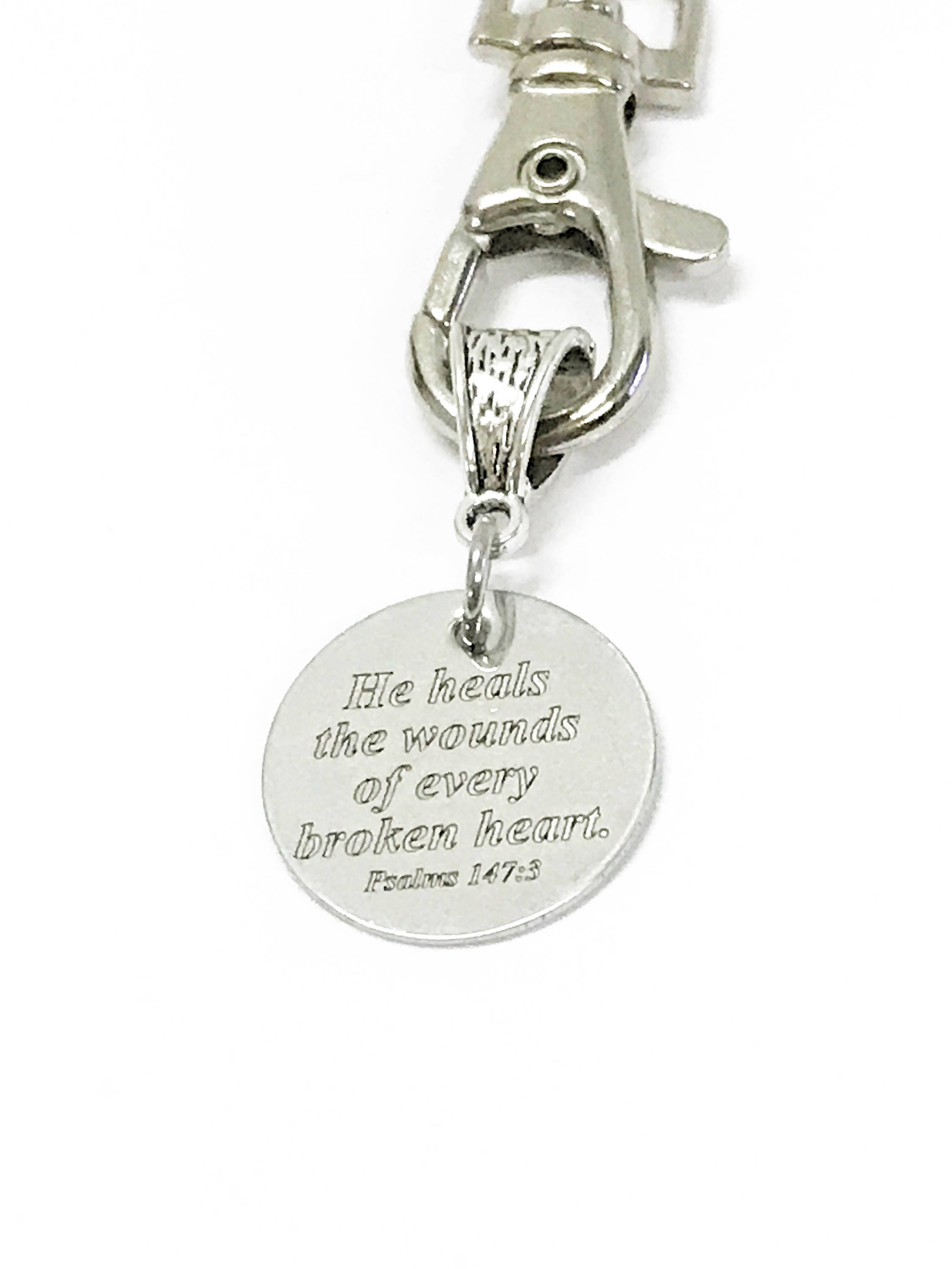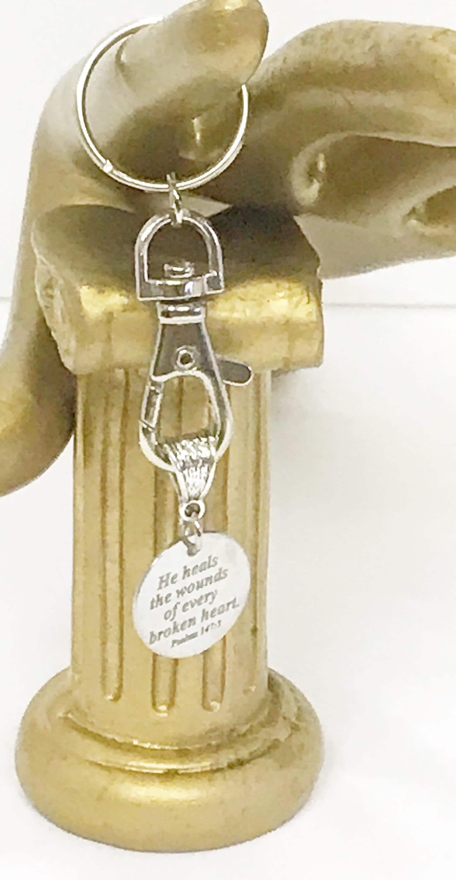 This is a beautiful stainless steel laser engraved keychain with "He heals the wounds of every broken heart" on it from the Bible verse of Psalm 147:3. This keychain would be a wonderful way to express sympathy or remind yourself that God is the healer of all broken hearts.