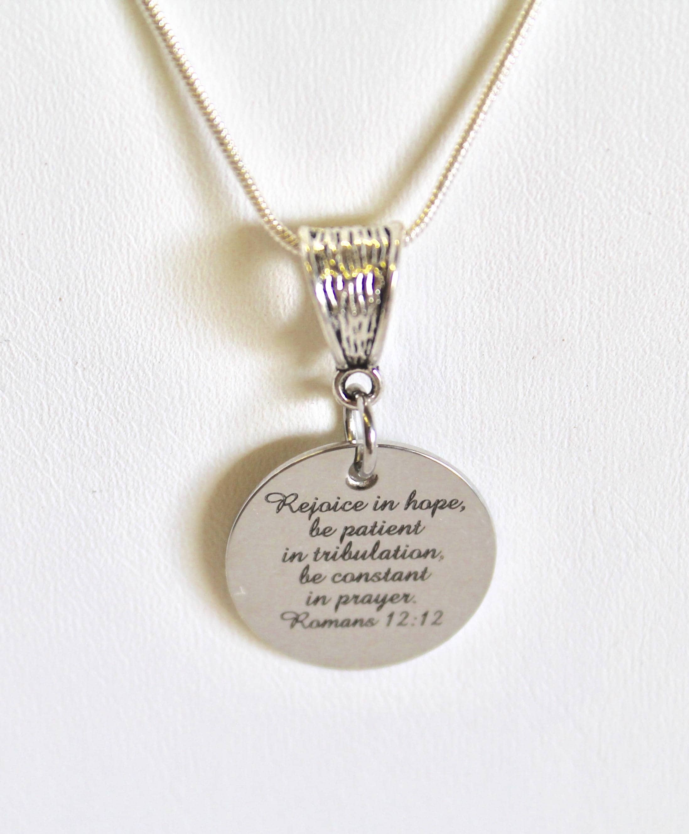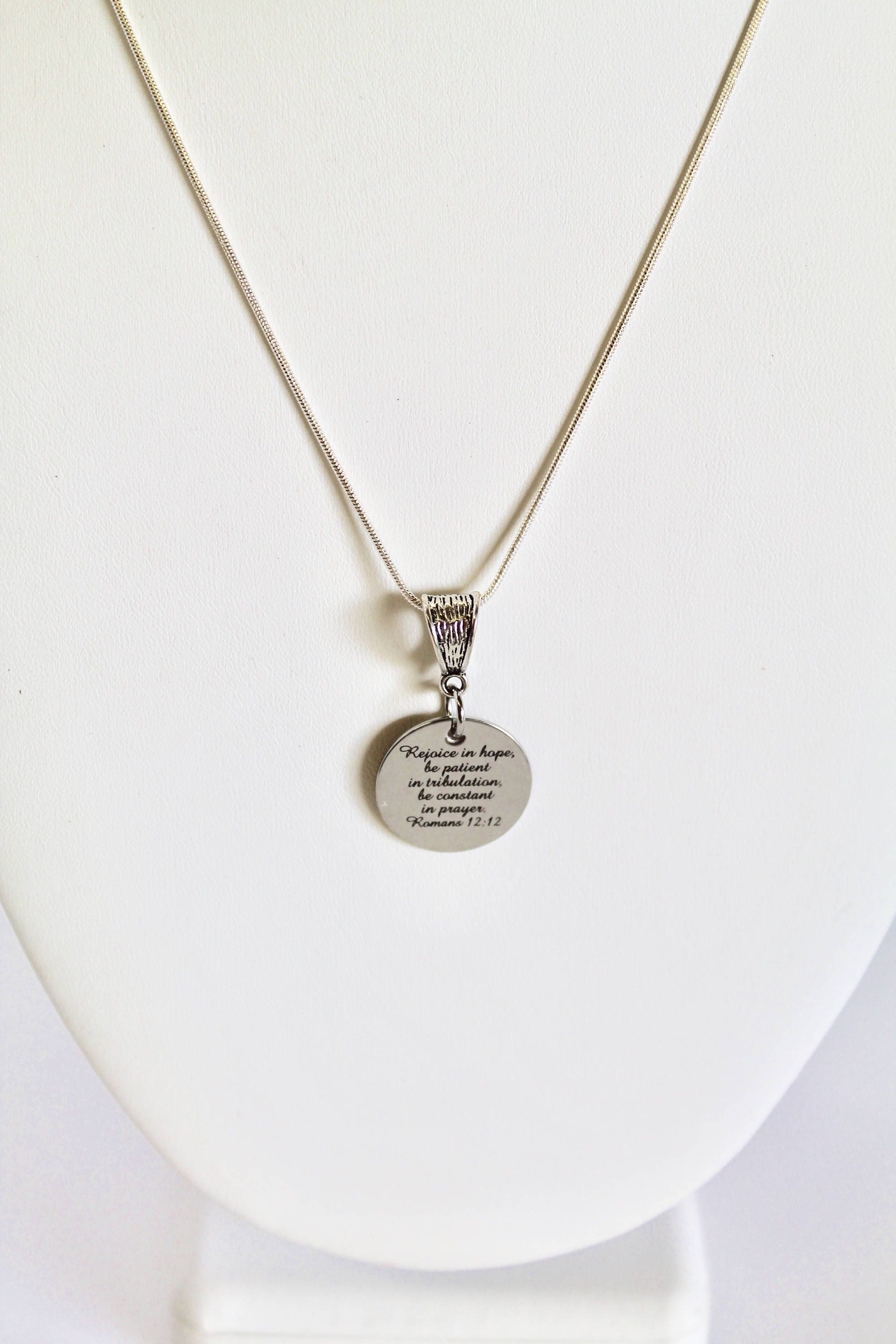 This is a stainless steel laser engraved pendant on a sterling silver plated snake chain. The pendant has the bible verse Romans 12:12 on it that says "Rejoice in hope, be patient in tribulation, be constant in prayer." This pendant is available on your choice of 16, 18, 20, 22, 24, 26, 28 or 30 inch chain. The pendant is also available for individual purchase if you have another chain on which you would like to wear it. This jewelry piece would be a great sympathy gift for someone that is facing a difficult struggle.