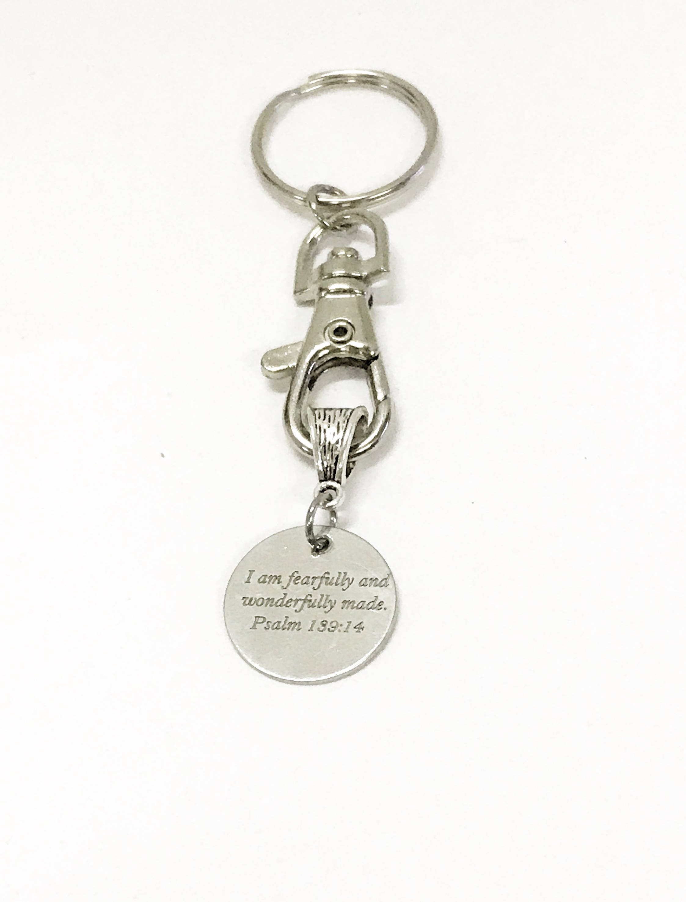 This is a beautiful stainless steel laser engraved bible verse keychain featuring the Psalm 139:14 bible verse of "I am fearfully and wonderfully made". This would be a great gift of encouragement for someone that you love.