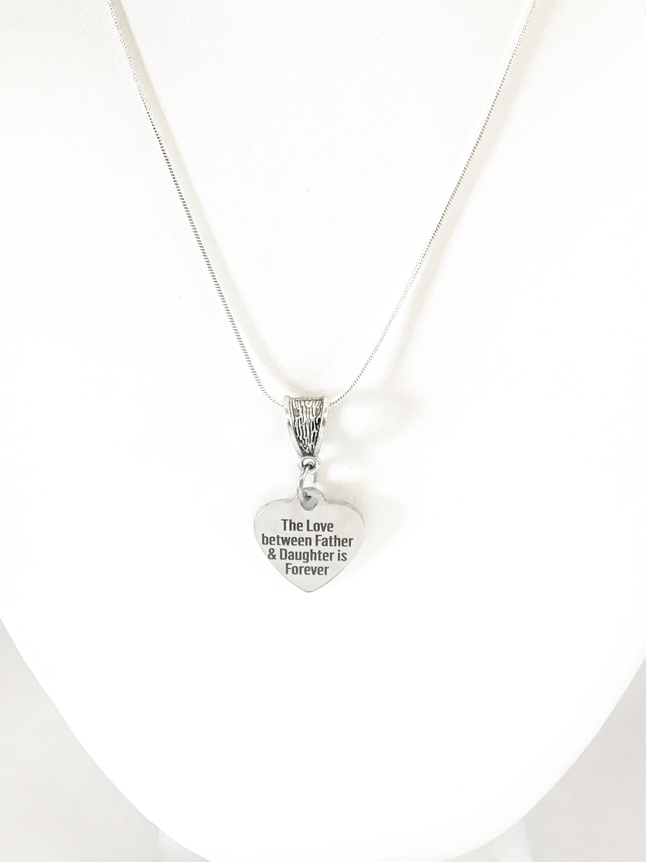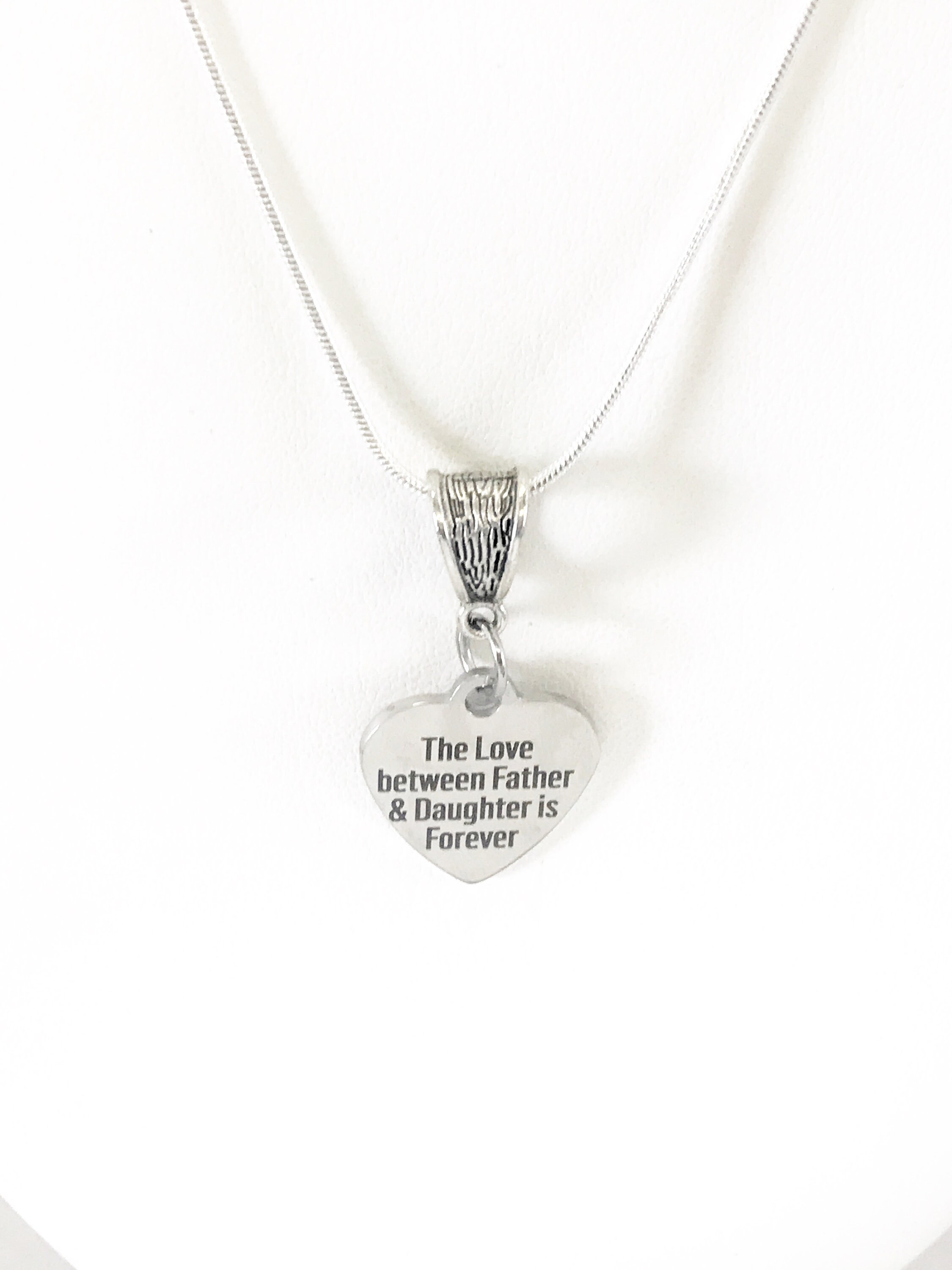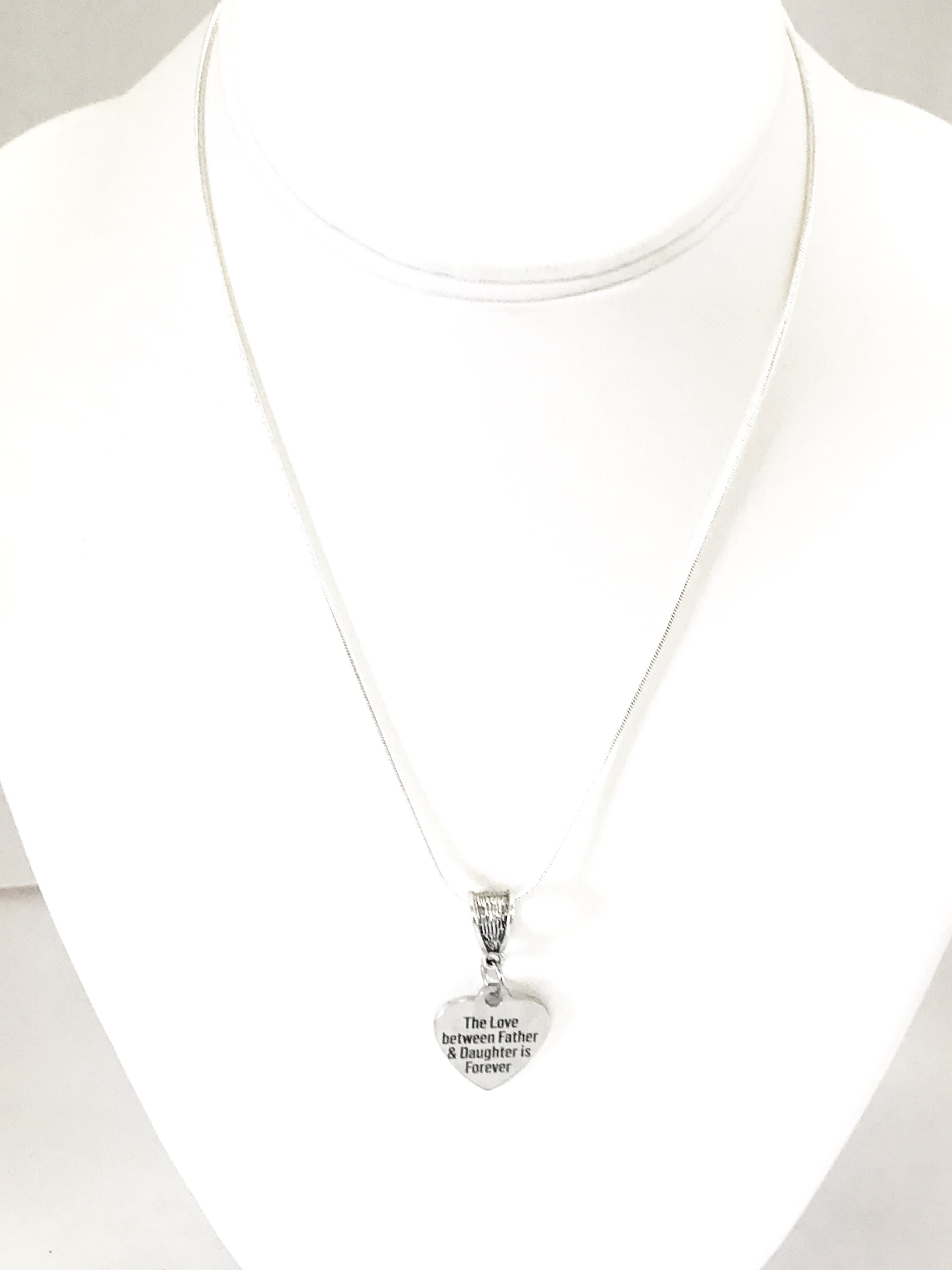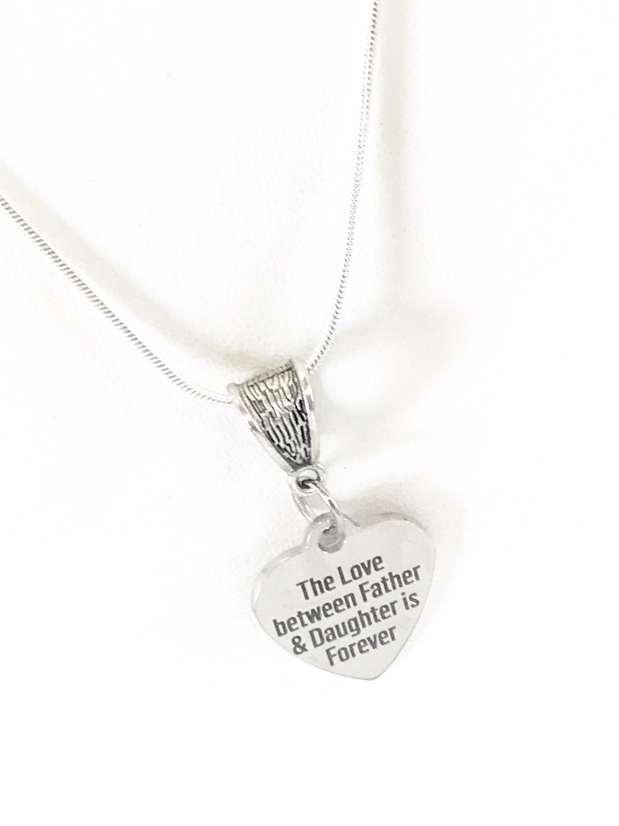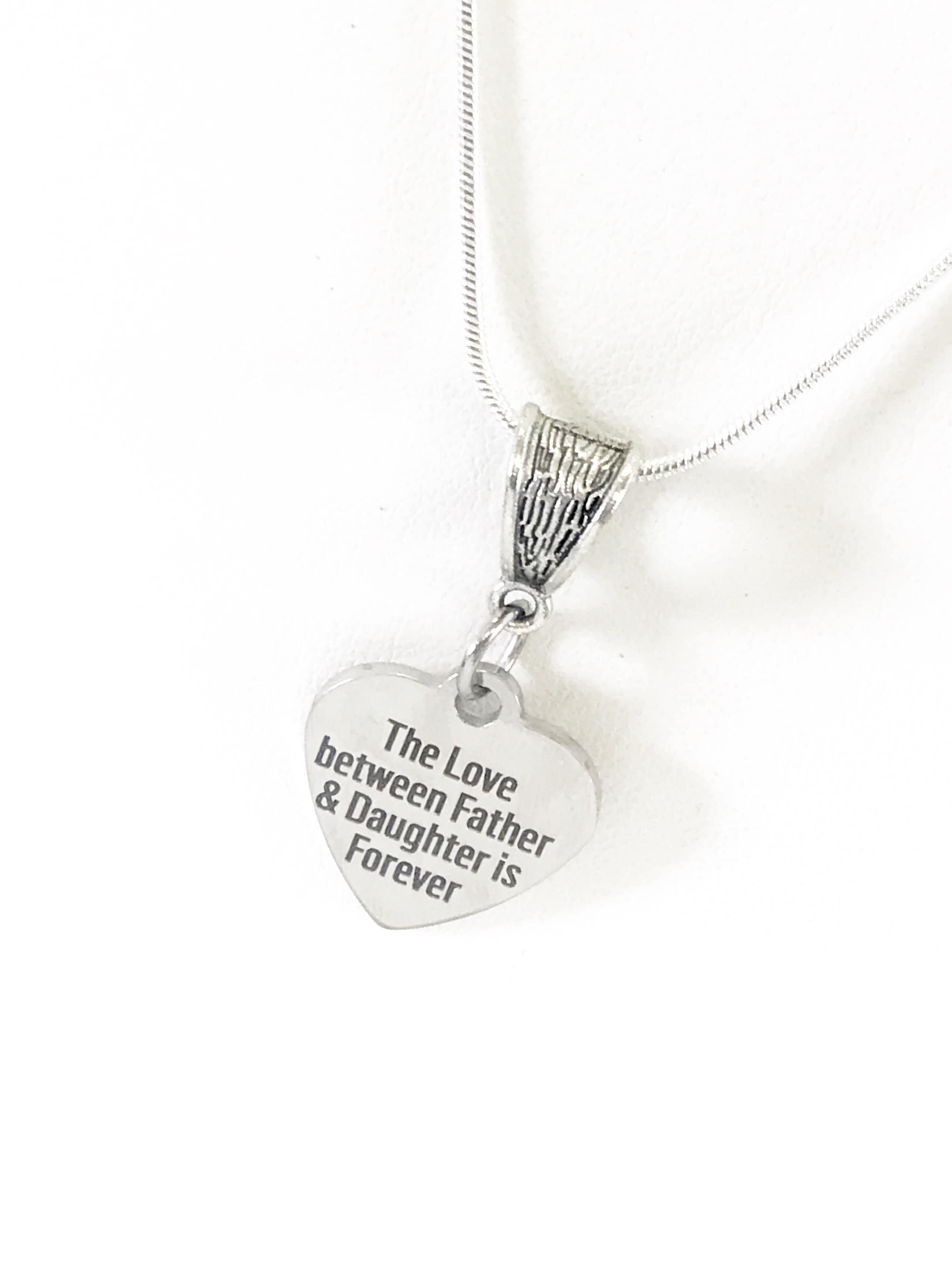 This beautiful necklace has a laser engraved stainless steel heart pendant on a silver plated snake chain. The pendant has "The love between Father and Daughter is Forever". This would be a great gift to give to your daughter on her wedding day, or a great way to remember the lover that you shared with your dad.