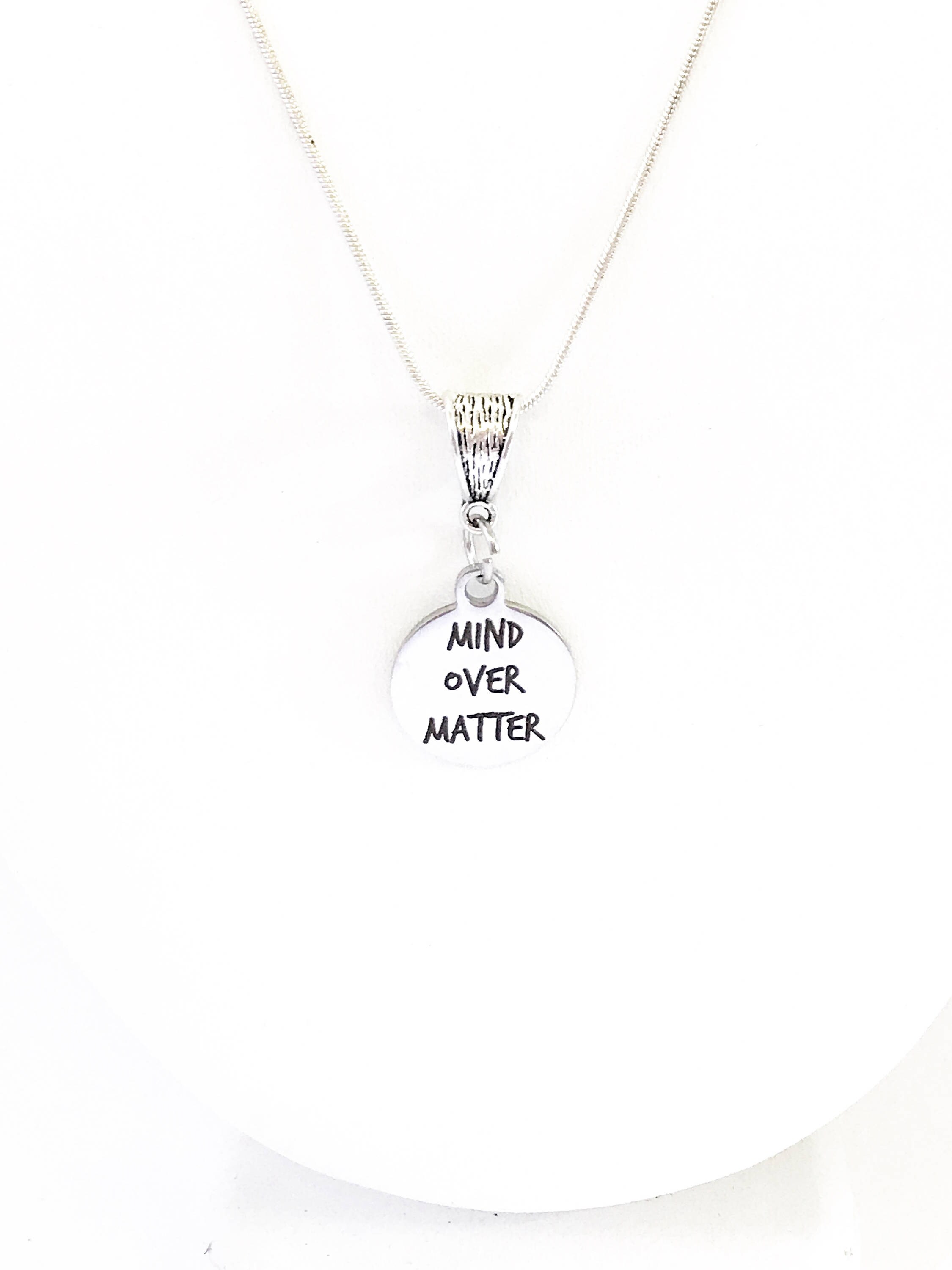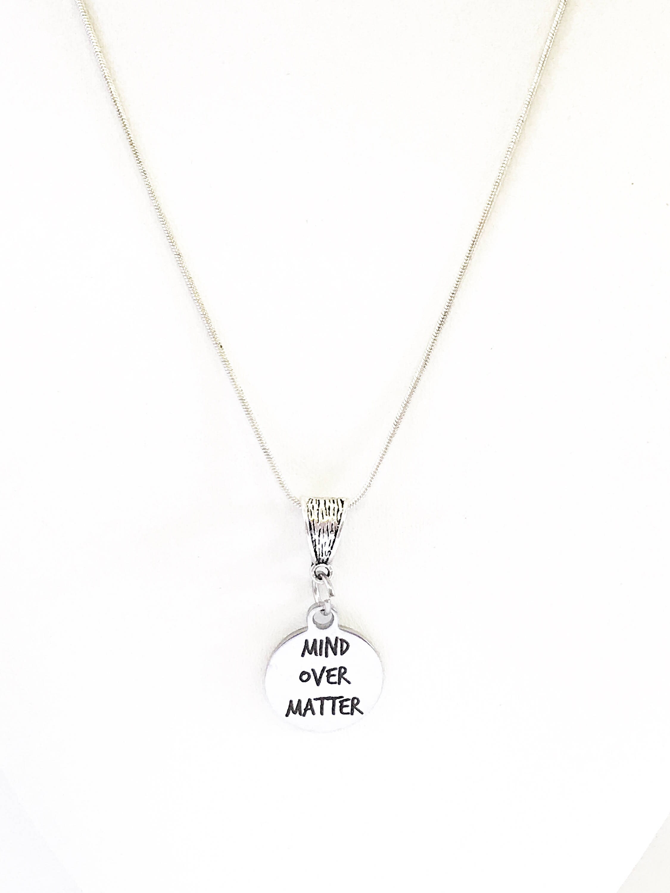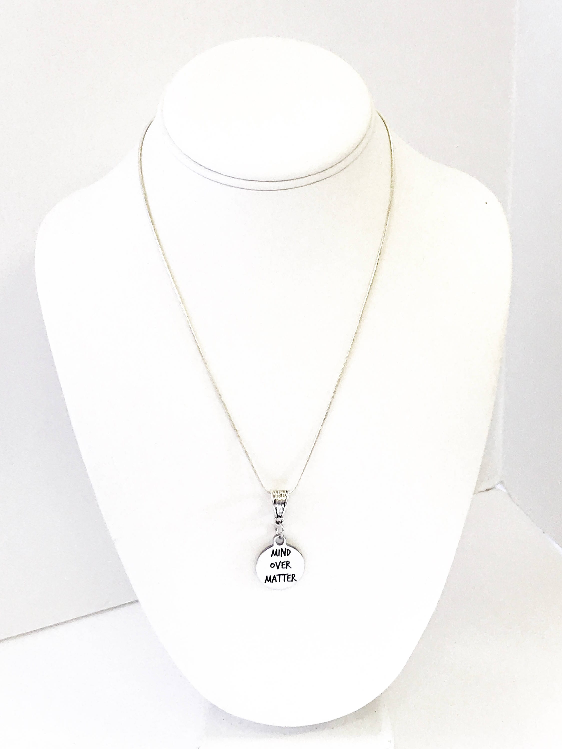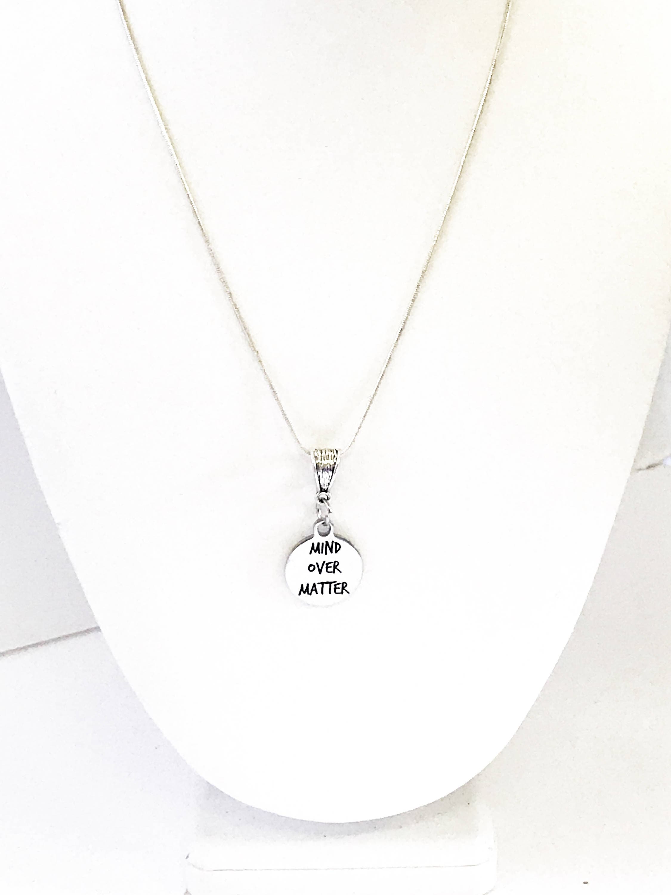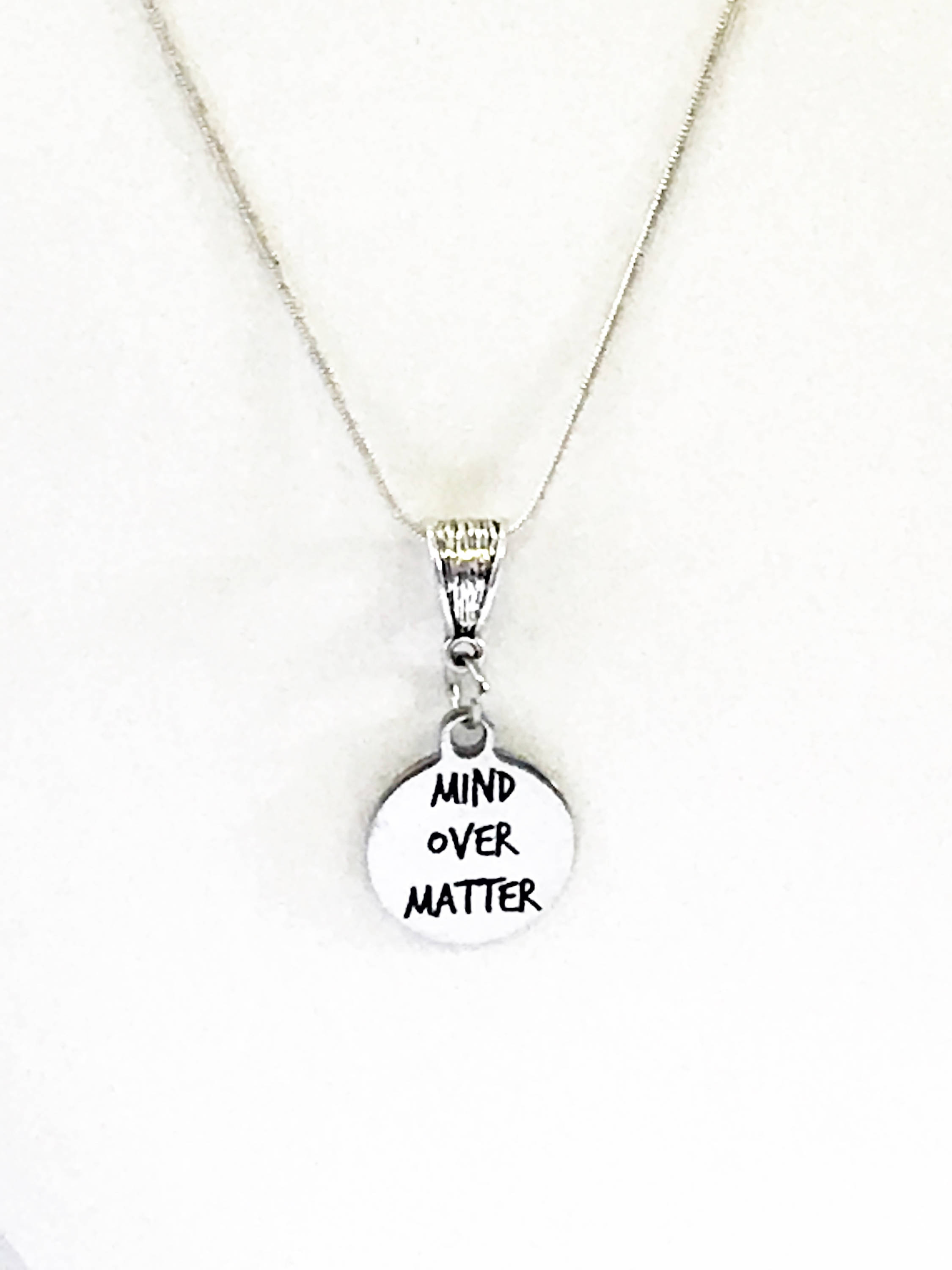 This is a stainlses steel laser engraved pendant on a sterling silver plated chain. The pendant has "Mind Over Matter" on it. This pendant is available on your choice of 16, 18, 20, 22, 24, 26, 28 or 30 inch sterling silver chain. The pendant is also available for individual purchase if you have another chain on which you would like to wear it.