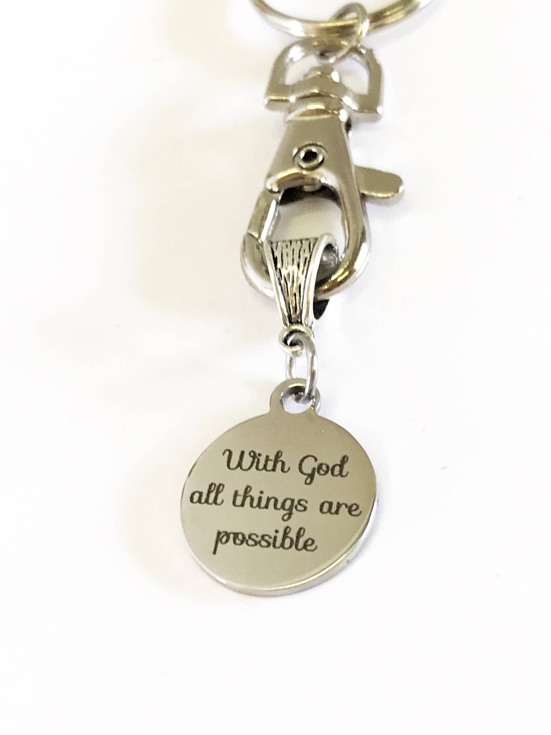 This keychain includes a stainless steel laser engraved charm that has "With God all things are possible" on it. This would be a great gift of encouragement to someone!