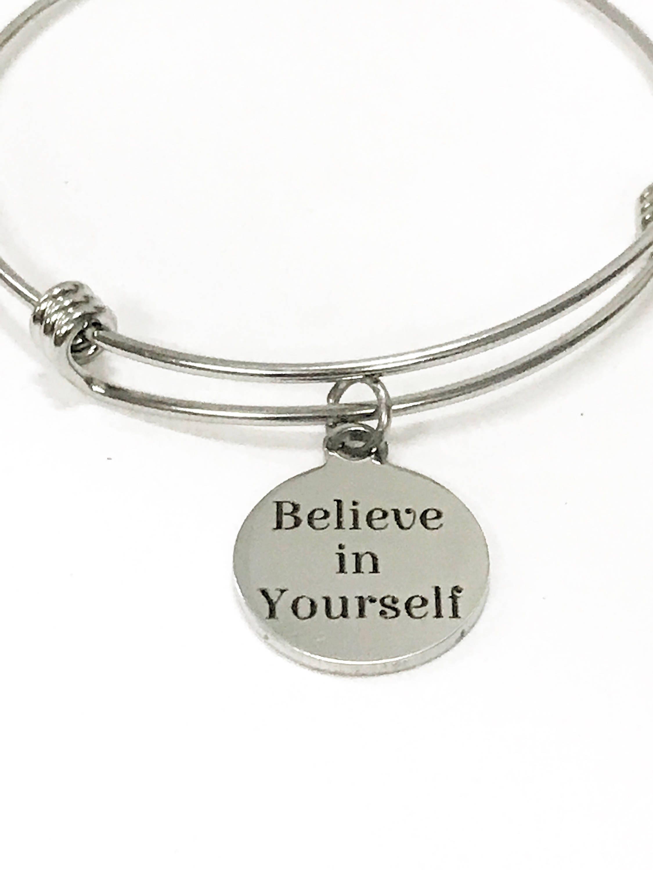 This is a beautiful bangle bracelet with a laser engraved stainless steel charm that has "Believe In Yourself" on it. This bracelet is made of stainless steel to withstand regular wear without tarnishing or changing colors.