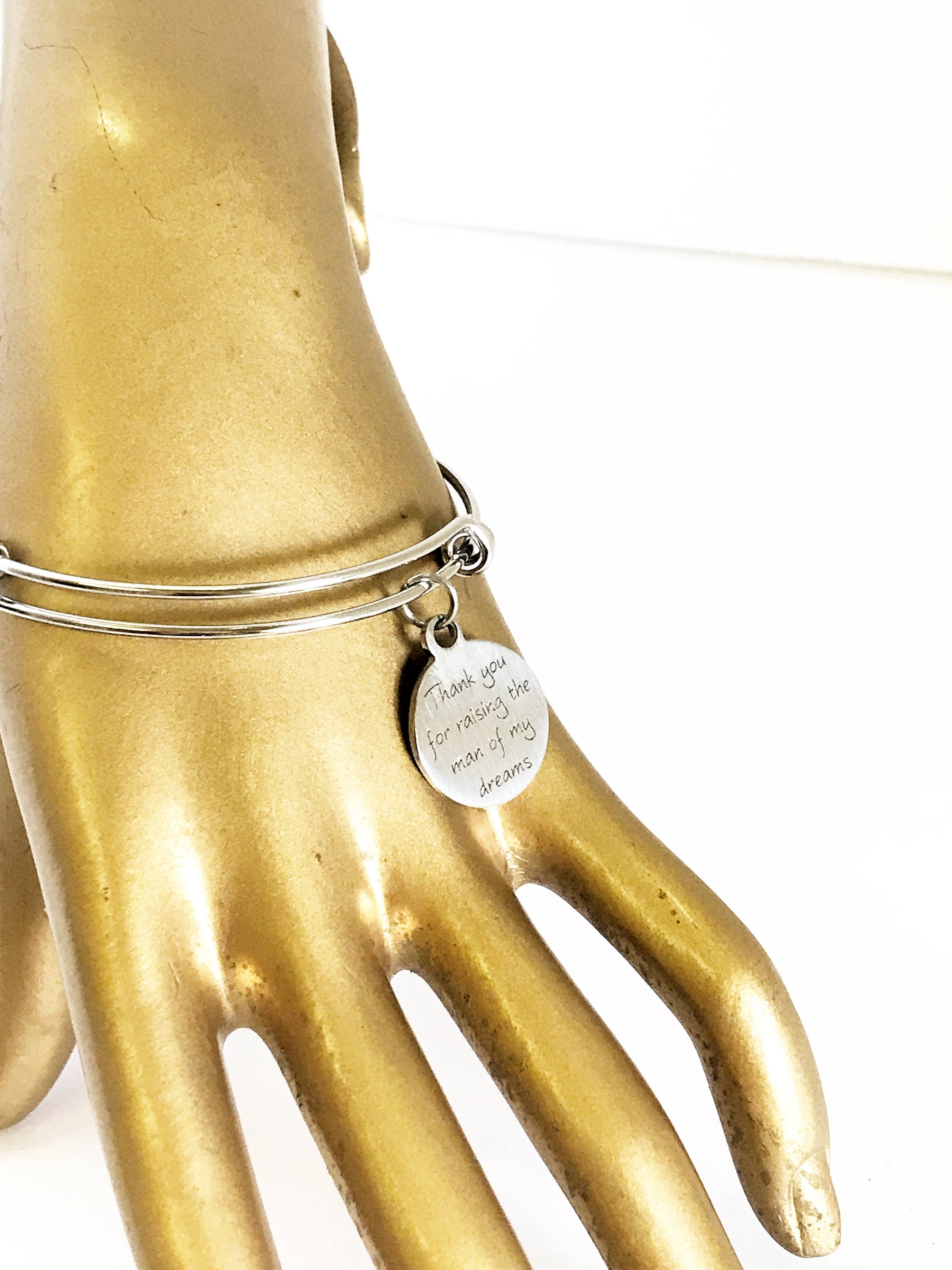 This is a beautiful bangle bracelet with a laser engraved stainless steel charm that has "Thank you for raising the man of my dreams" on it. The bracelet is made of stainless steel to withstand regular wear without tarnishing or changing colors.