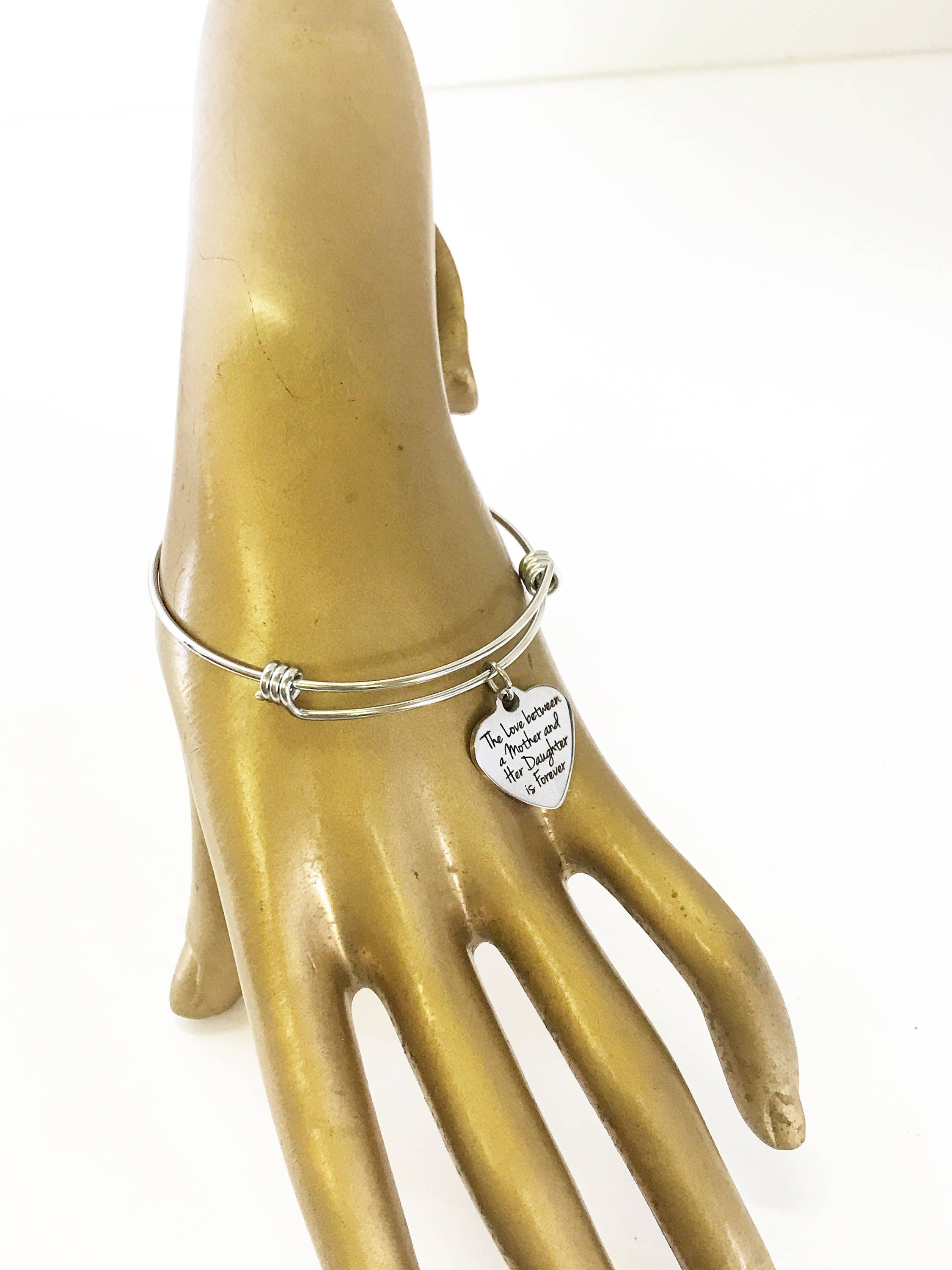 This is a beautiful bangle bracelet with a laser engraved stainless steel charm that has "Mother Of The Groom" on it. All components are made of high quality stainless steel so there is no worry of tarnishing or color loss. The bracelet expands to easily fit on any wrist size.