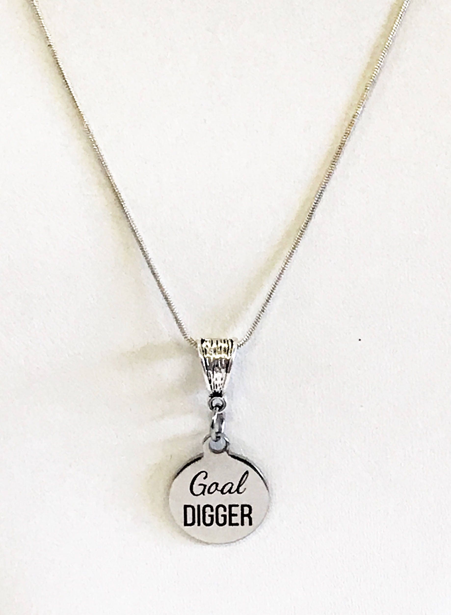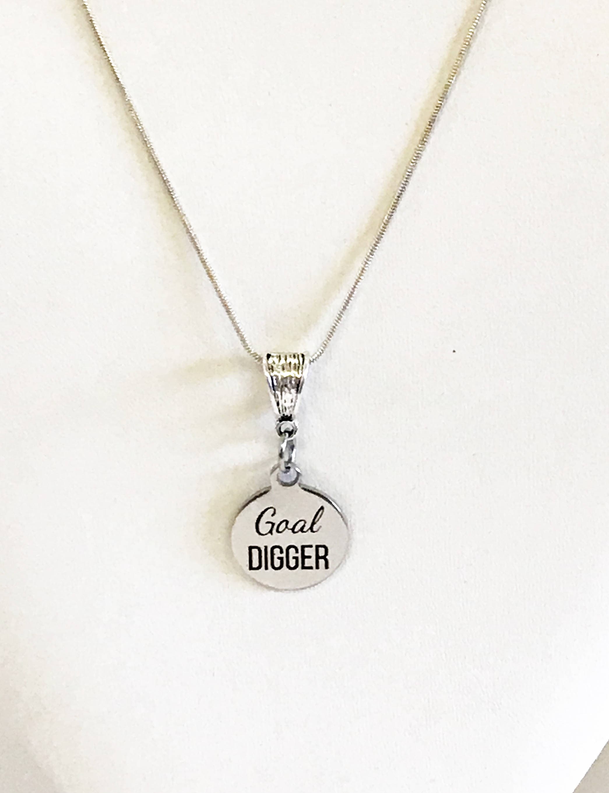 Do you set goals and achieve them? This is a stainless steel laser engraved pendant on a sterling silver plated chain. The pendant has "Goal Digger" on it. This pendant is available on your choice of 16, 18, 20, 22, 24, 26, 28 or 30 inch sterling silver chain. The pendant is also available for individual purchase if you have another chain on which you would like to wear it.