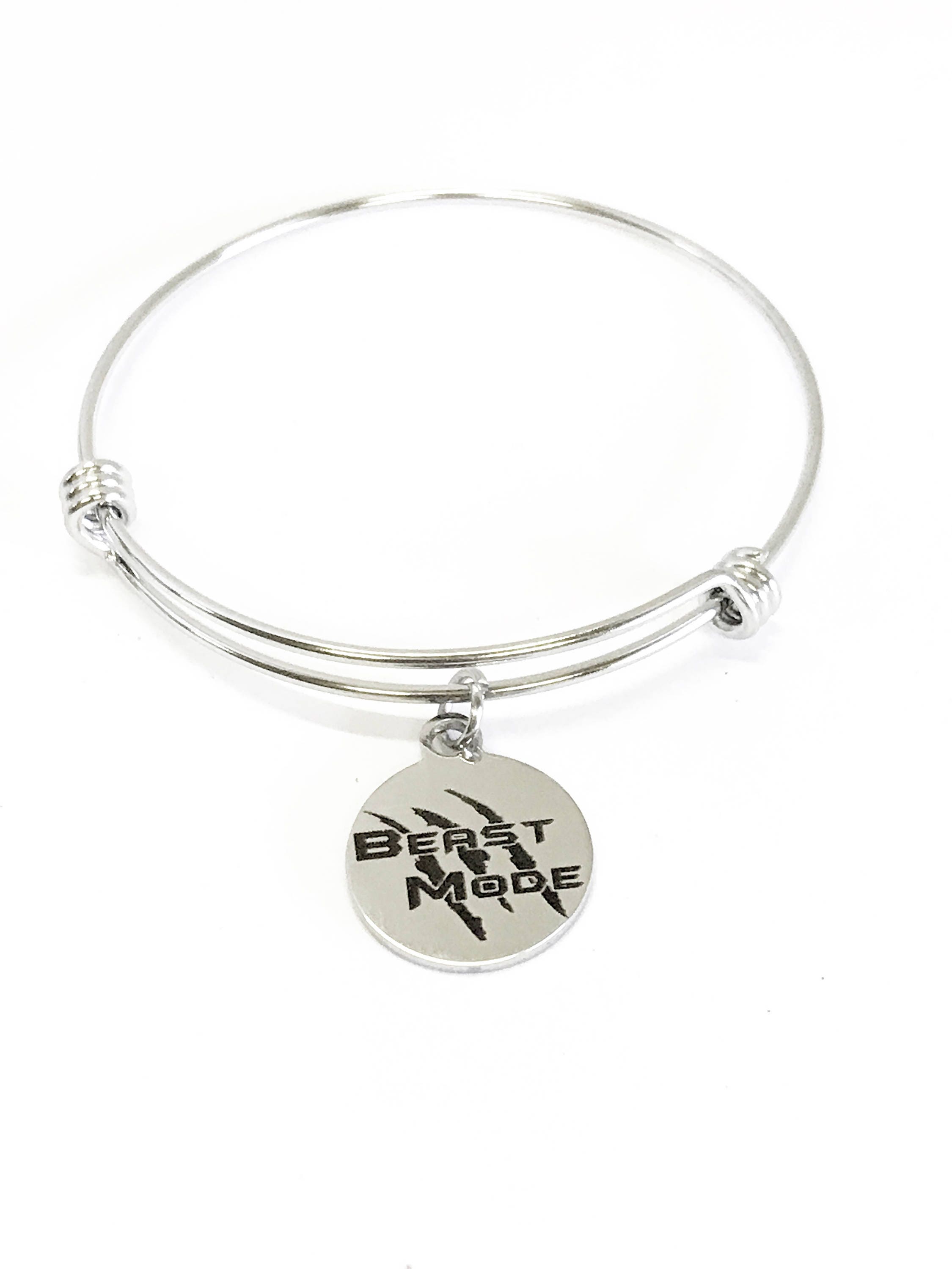 This is a beautiful bangle bracelet with a laser engraved stainless steel charm that has "Beast Mode" on it. This would be a great gift to encourage someone to attack whatever they are facing in "Beast Mode". The bracelet is available in your choice of either silver tone metal or stainless steel (shown) and expands to easily fit on any wrist size.