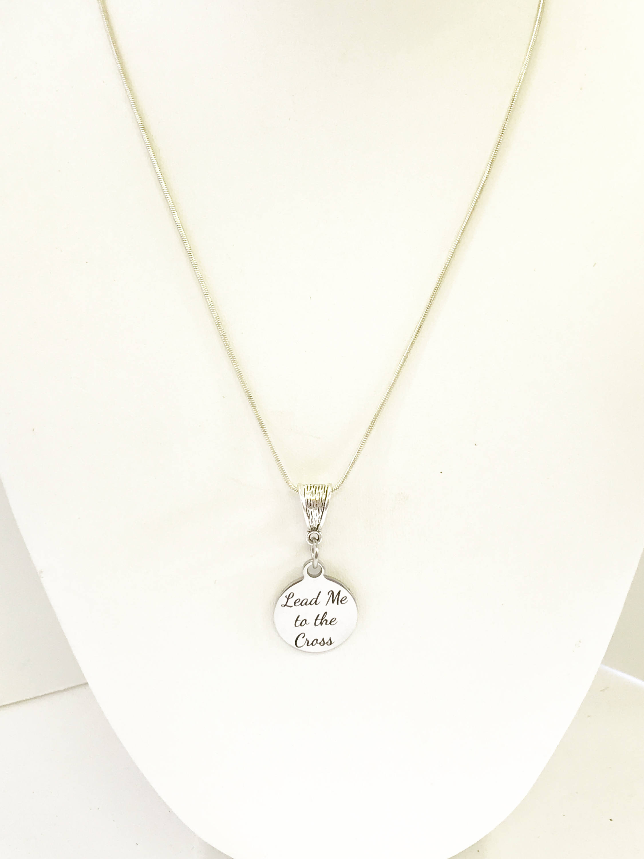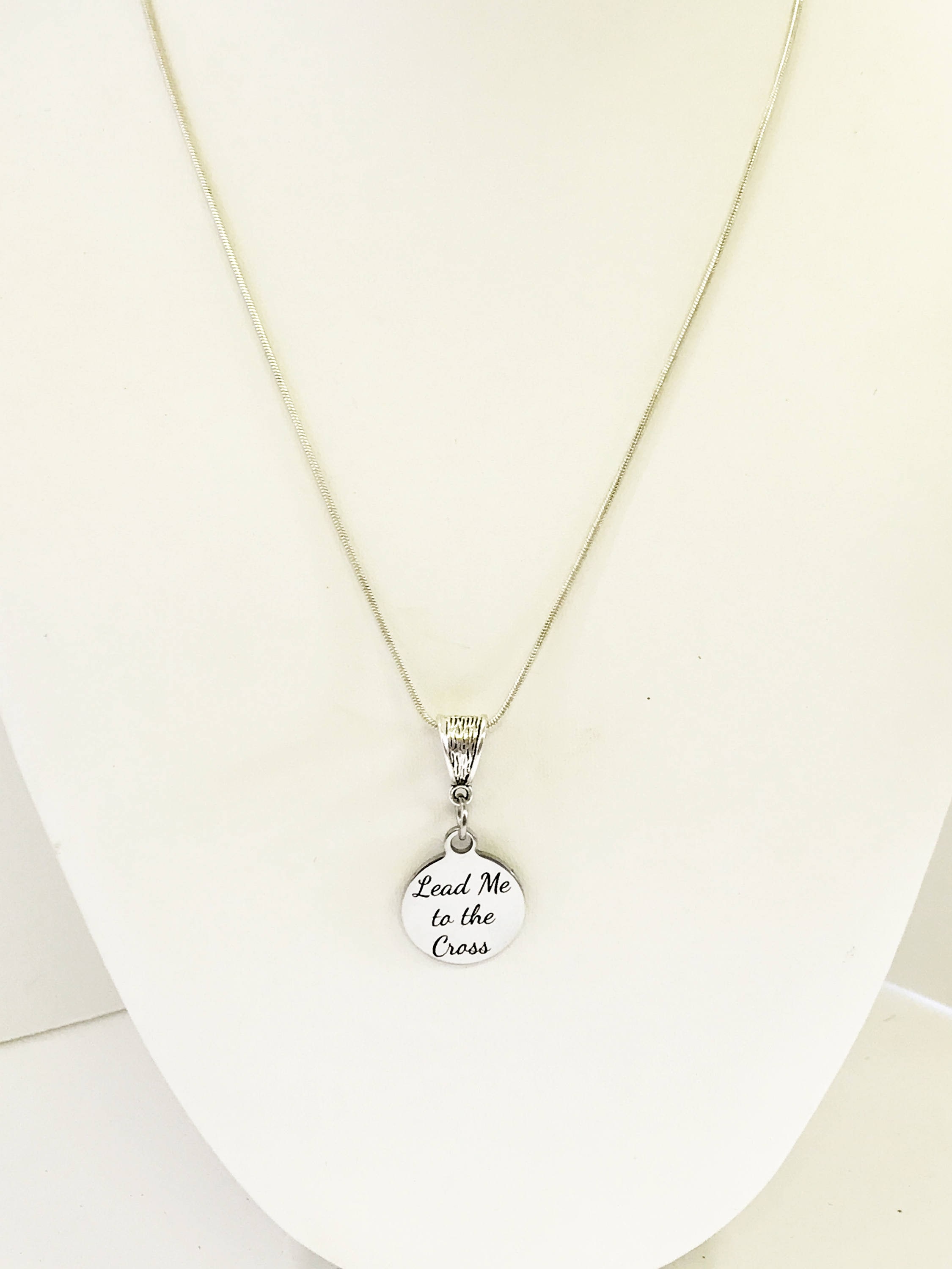 This is a stainless steel laser engraved pendant on a sterling silver plated chain. The pendant has "Lead Me To The Cross" on it. This pendant is available on your choice of 16, 18, 20, 22, 24, 26, 28 or 30 inch chain. The pendant is also available for individual purchase if you have another chain on which you would like to wear it.