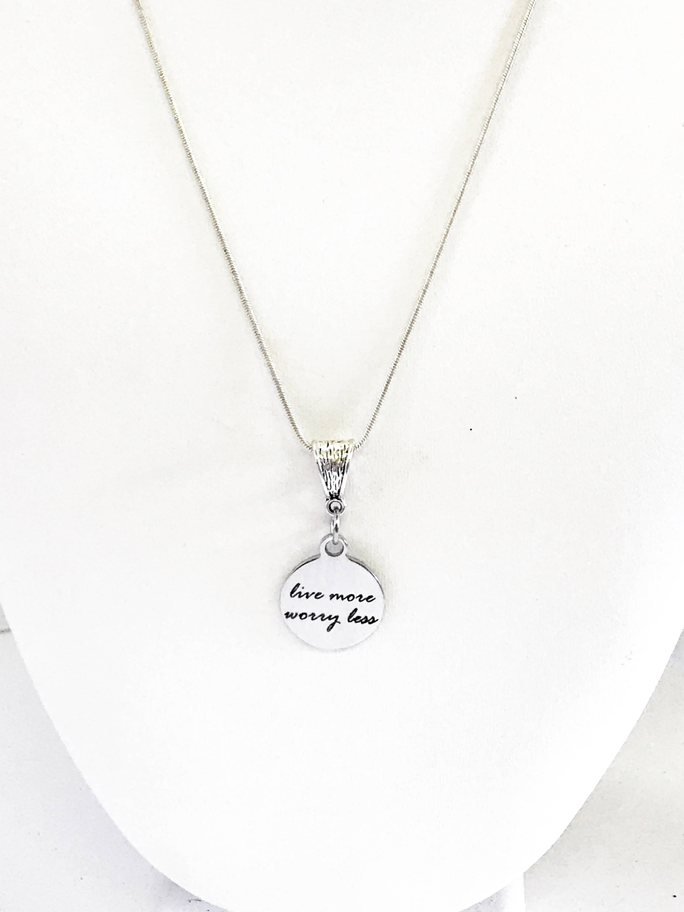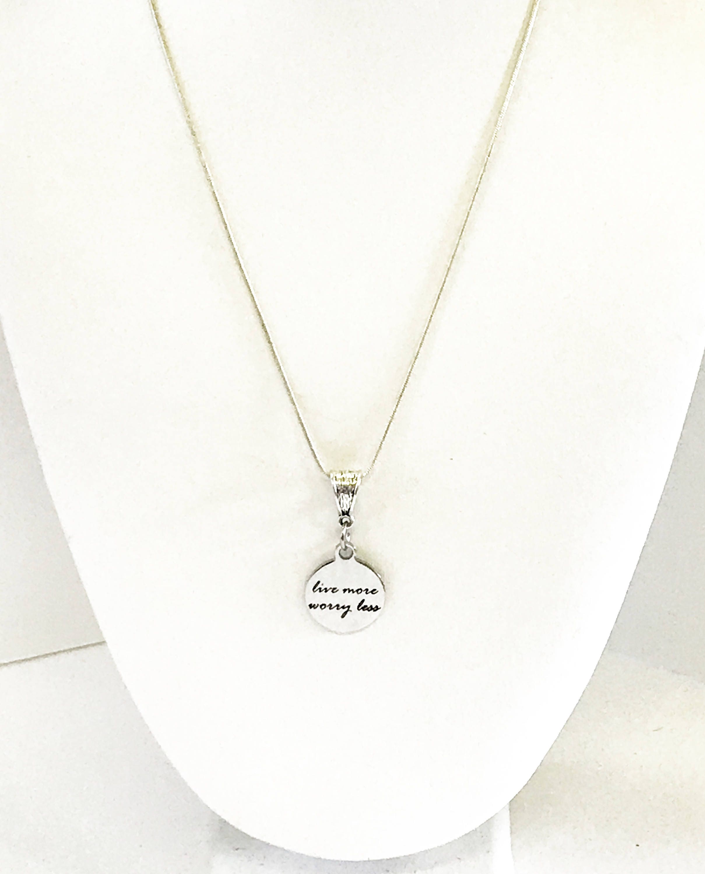 This is a stainless steel laser engraved pendant on a sterling silver plated chain. The pendant has "live more worry less" on it. This pendant is available on your choice of 16, 18, 20, 22, 24, 26, 28 or 30 inch chain. The pendant is also available for individual purchase if you have another chain on which you would like to wear it.