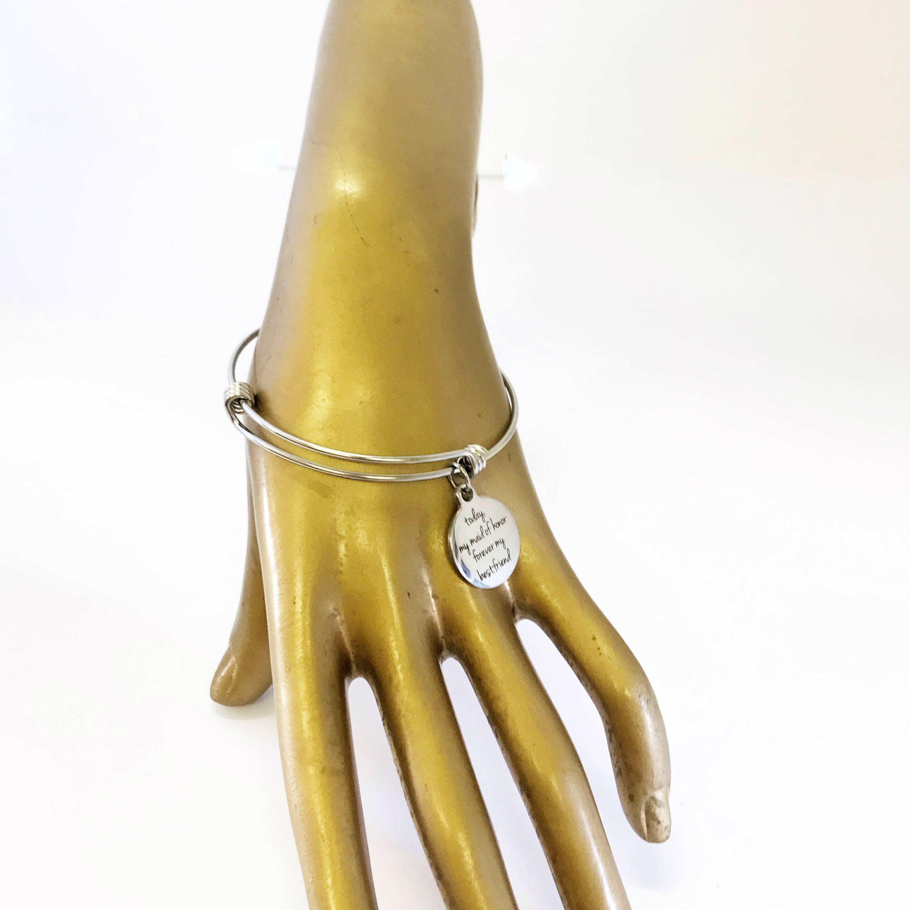 Tell your maid of honor thank you for standing beside your and being your best friend. This beautiful sentimental stacking bracelet is an expanding bangle and has a stainless steel laser engraved charm that has "Today my maid of honor forever my best friend" on it. The bracelet is also made of stainless steel and expands to fit over your hand easily and returns to its shape after put on or taken off.