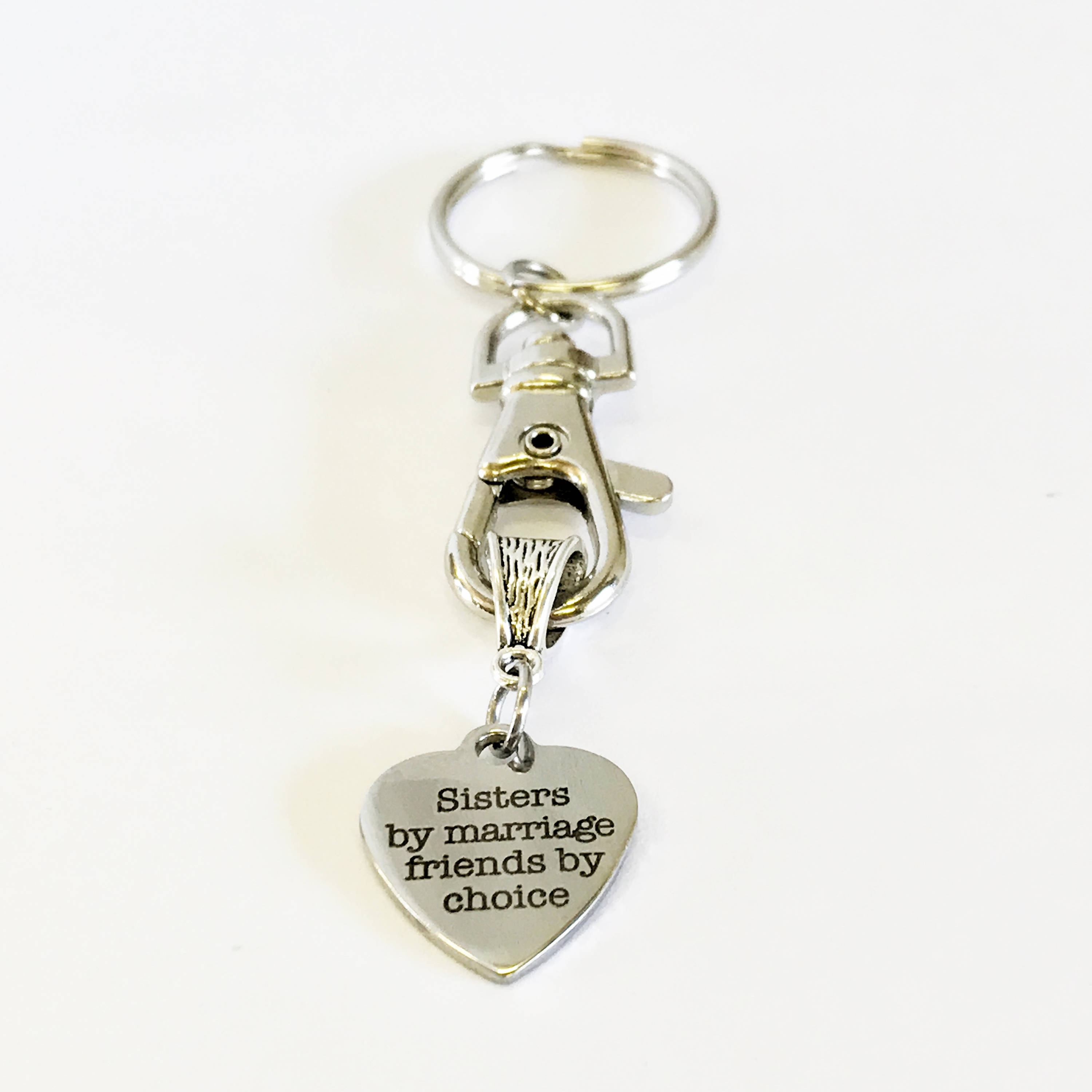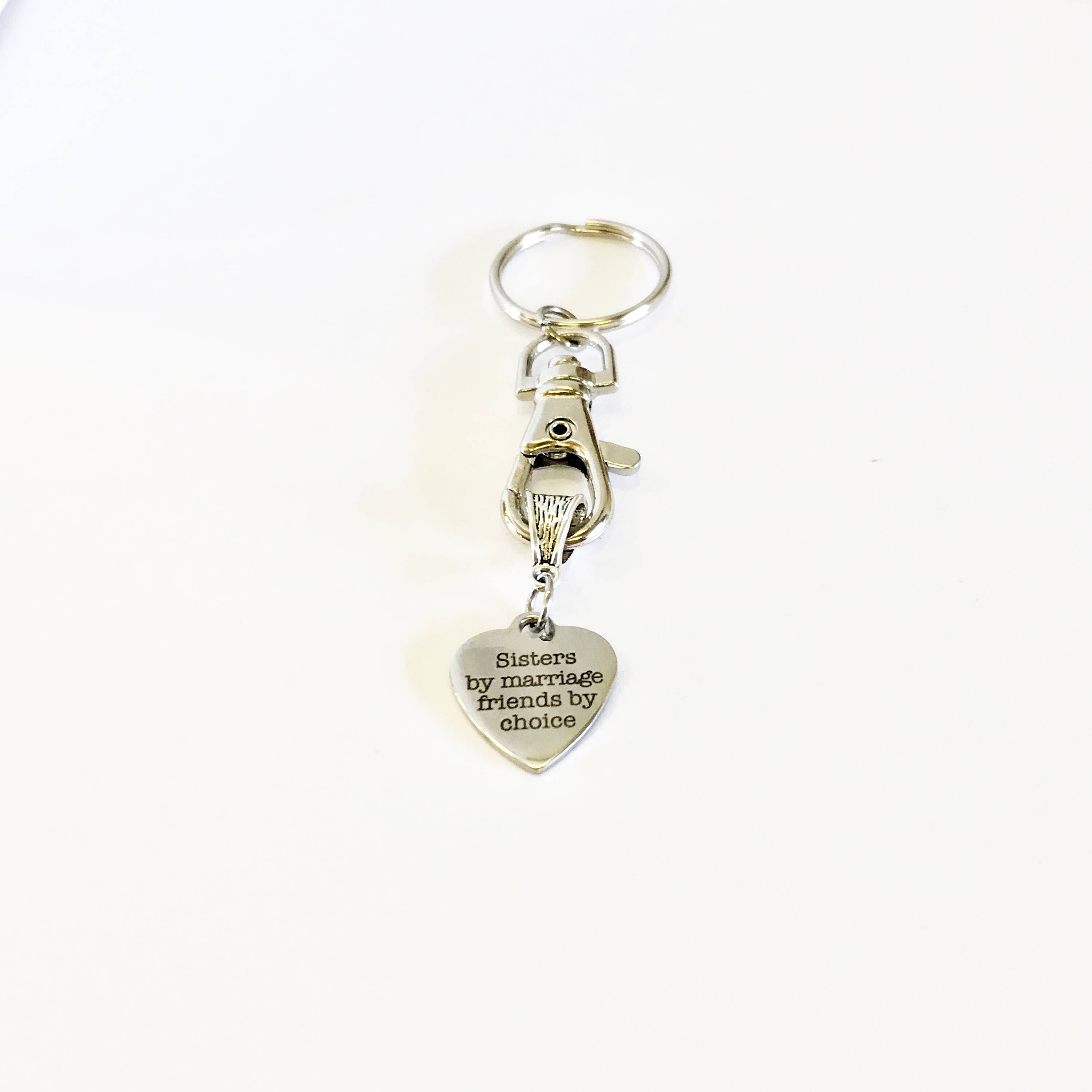 Looking for sentimental gift to give to your Sister In Law on your wedding day? This keychain includes a stainless steel laser engraved charm with "sisters by marriage friends by choice" on it. This item is a multi-purpose convertible piece and the pendant piece of this keychain can be "un-clipped" to wear on a chain or necklace if desired.