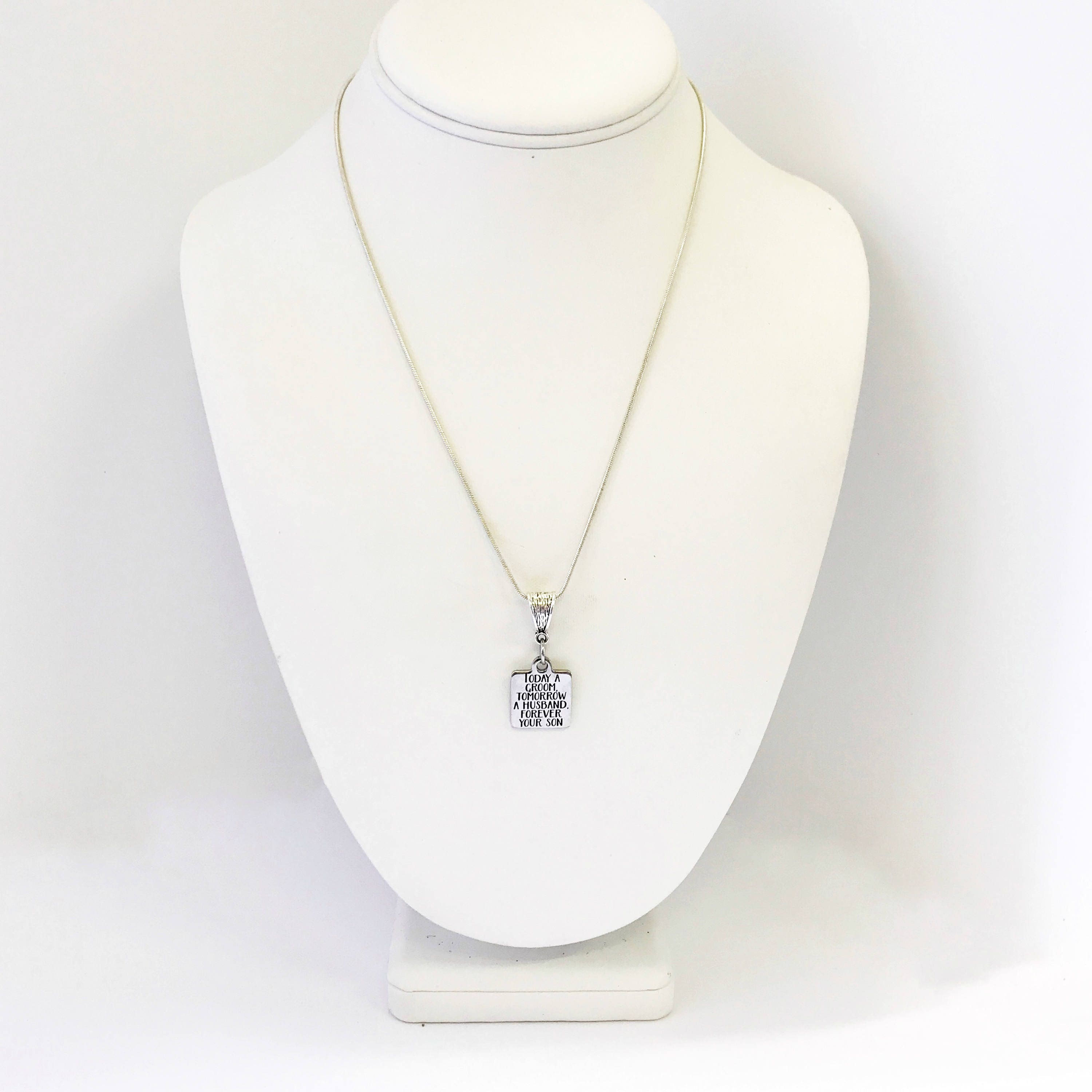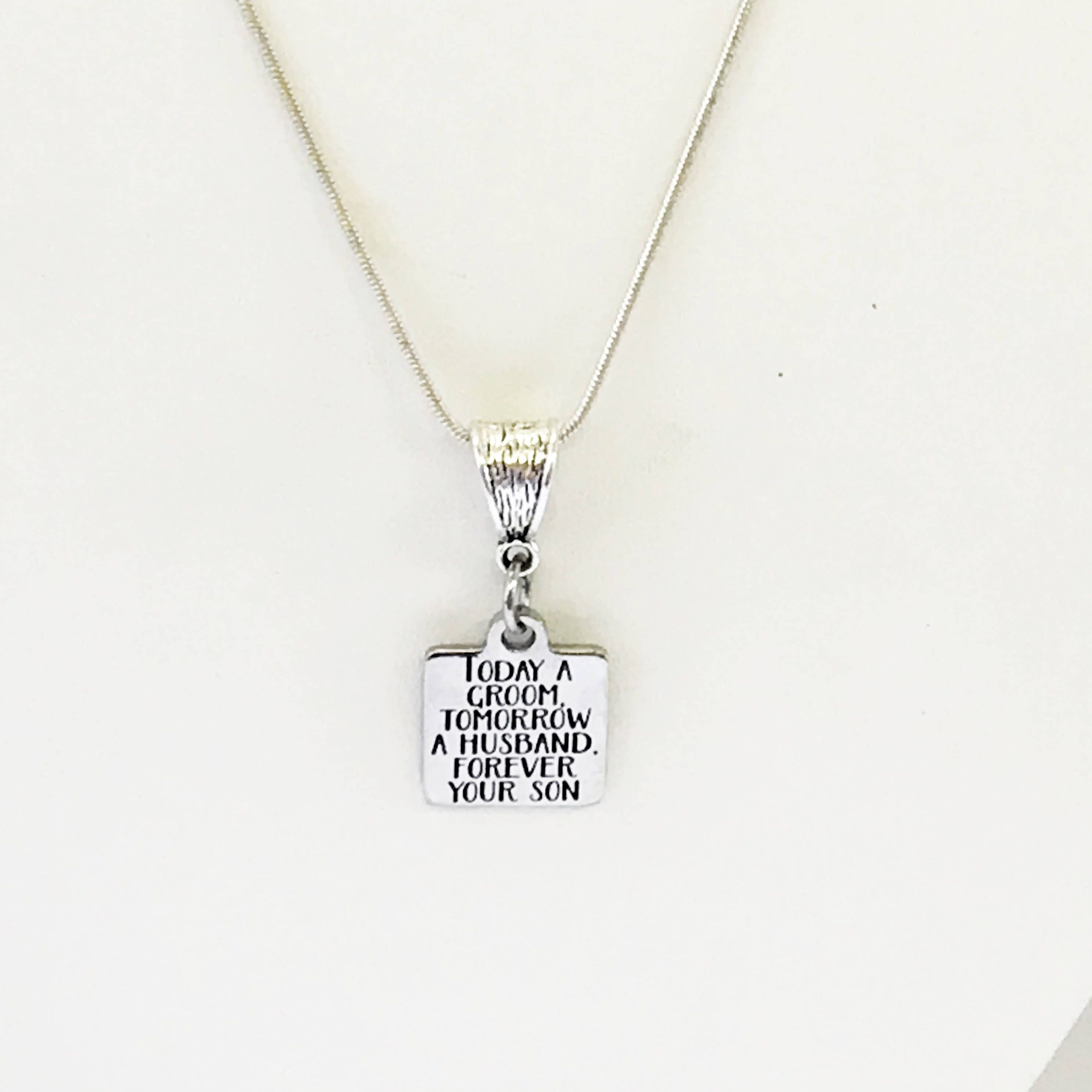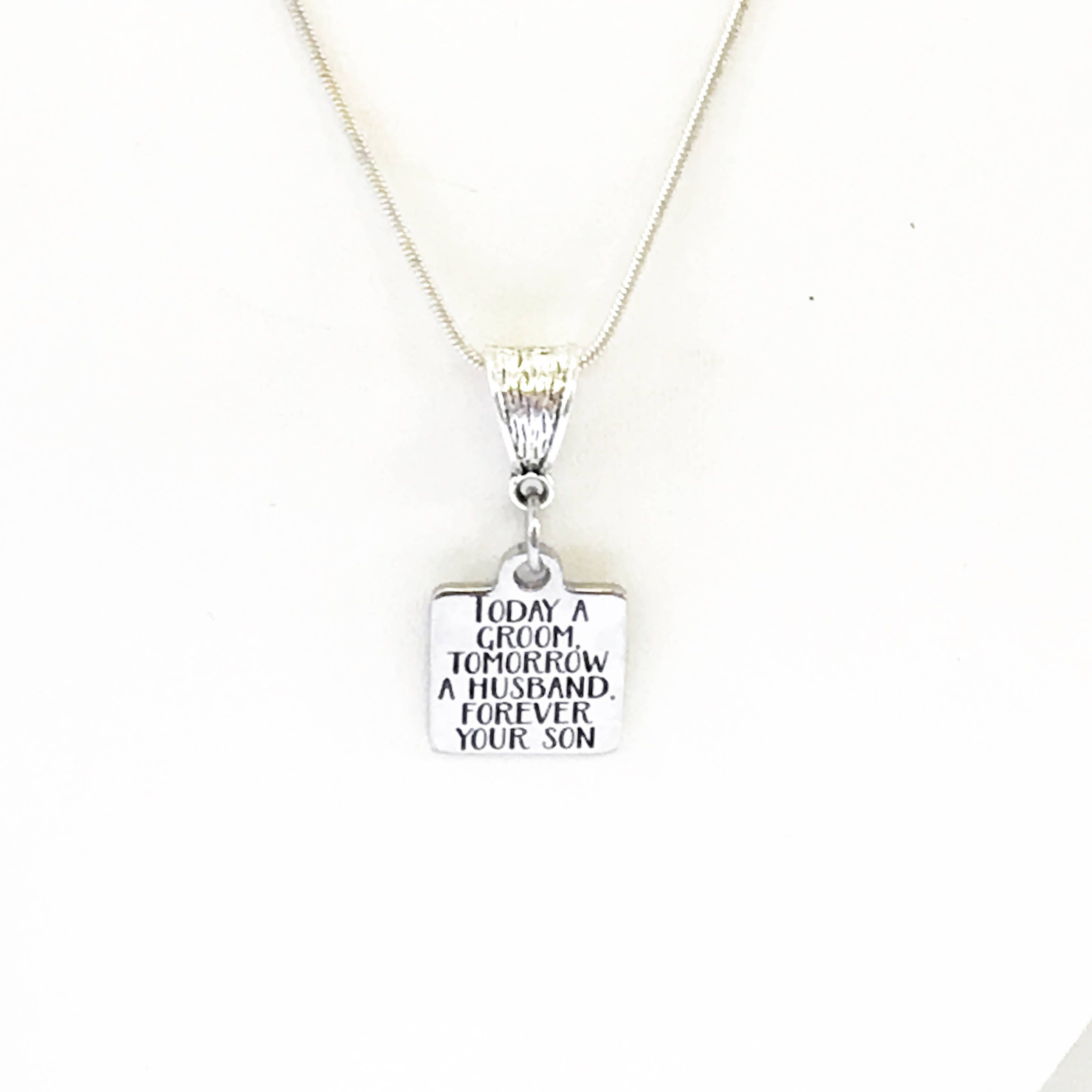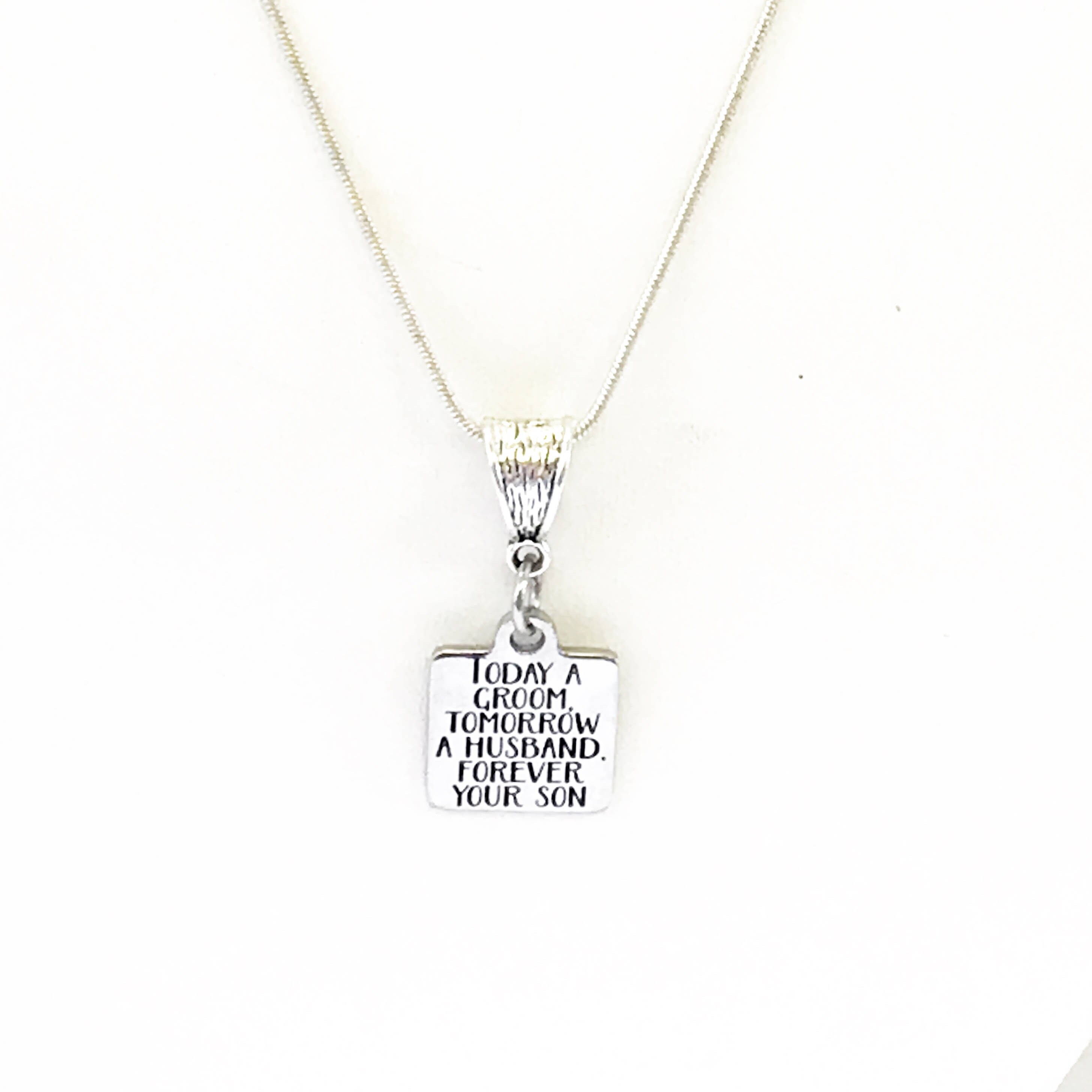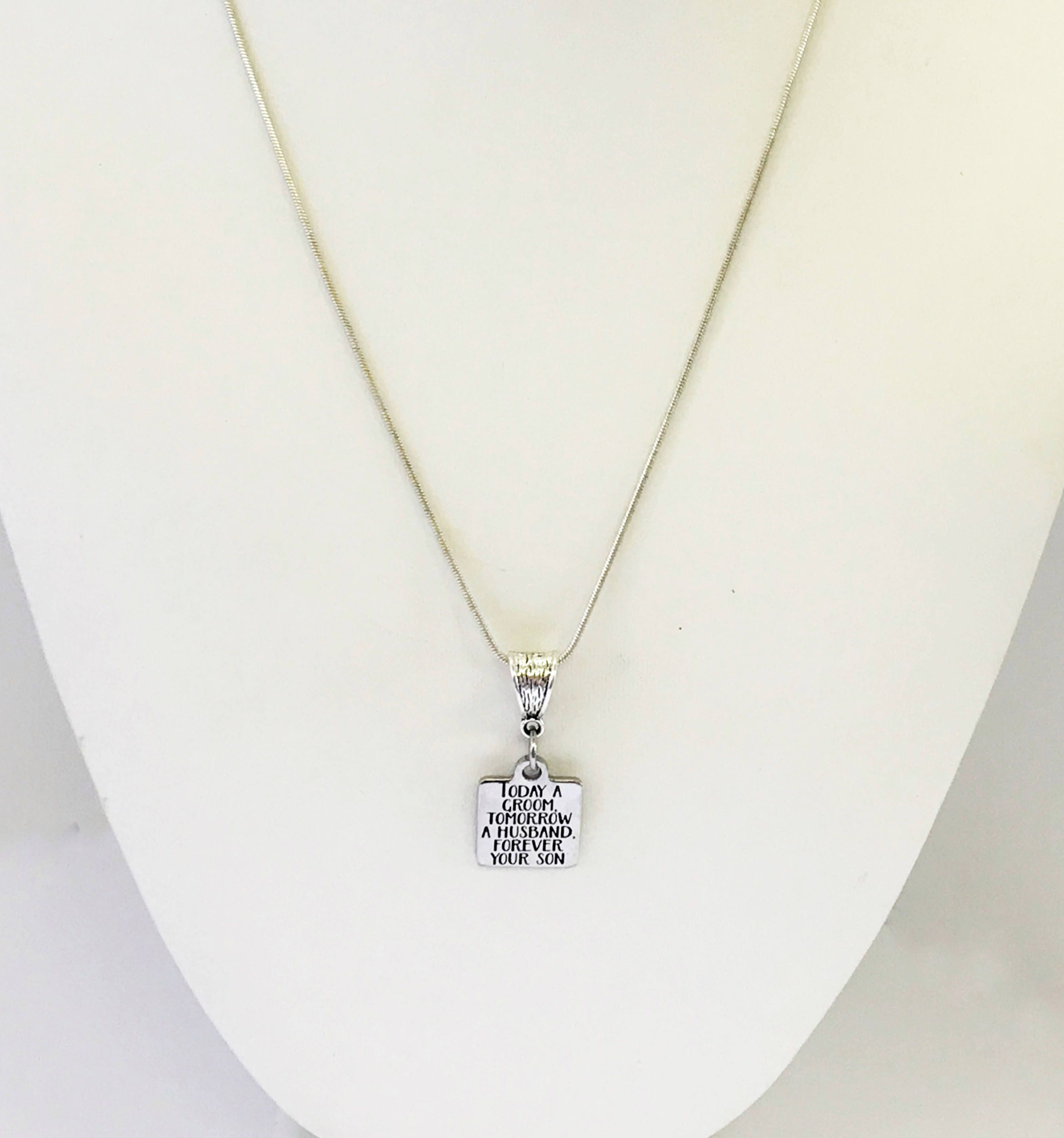 This is a beautiful stainless steel laser engraved pendant with "Today a groom tomorrow a husband forever your son" on your choice of a 16, 18, 20, 22, 24, 26, 28 or 30 inch sterling silver plated snake chain. This would make a beautiful gift to give your mom on your wedding day.