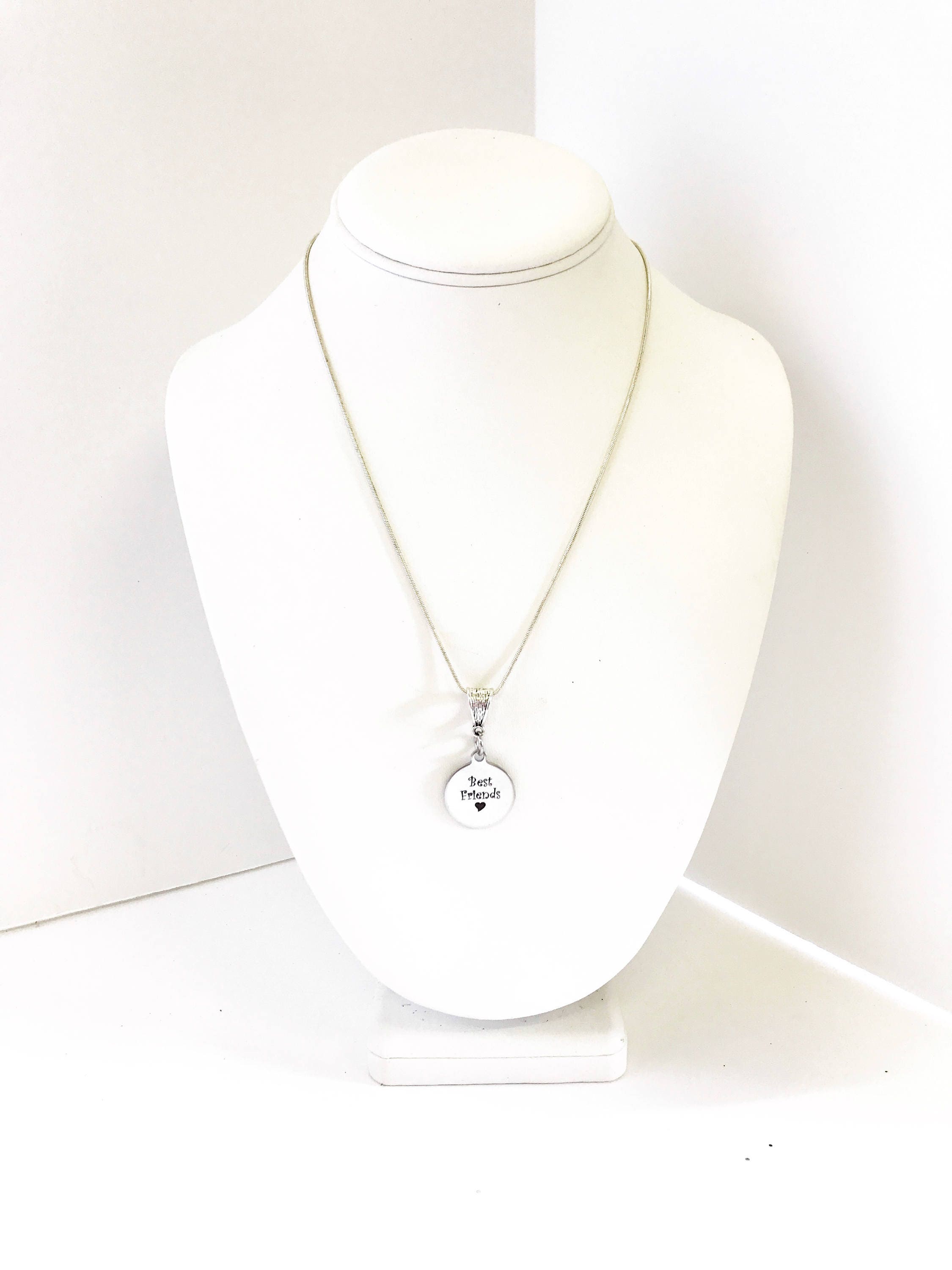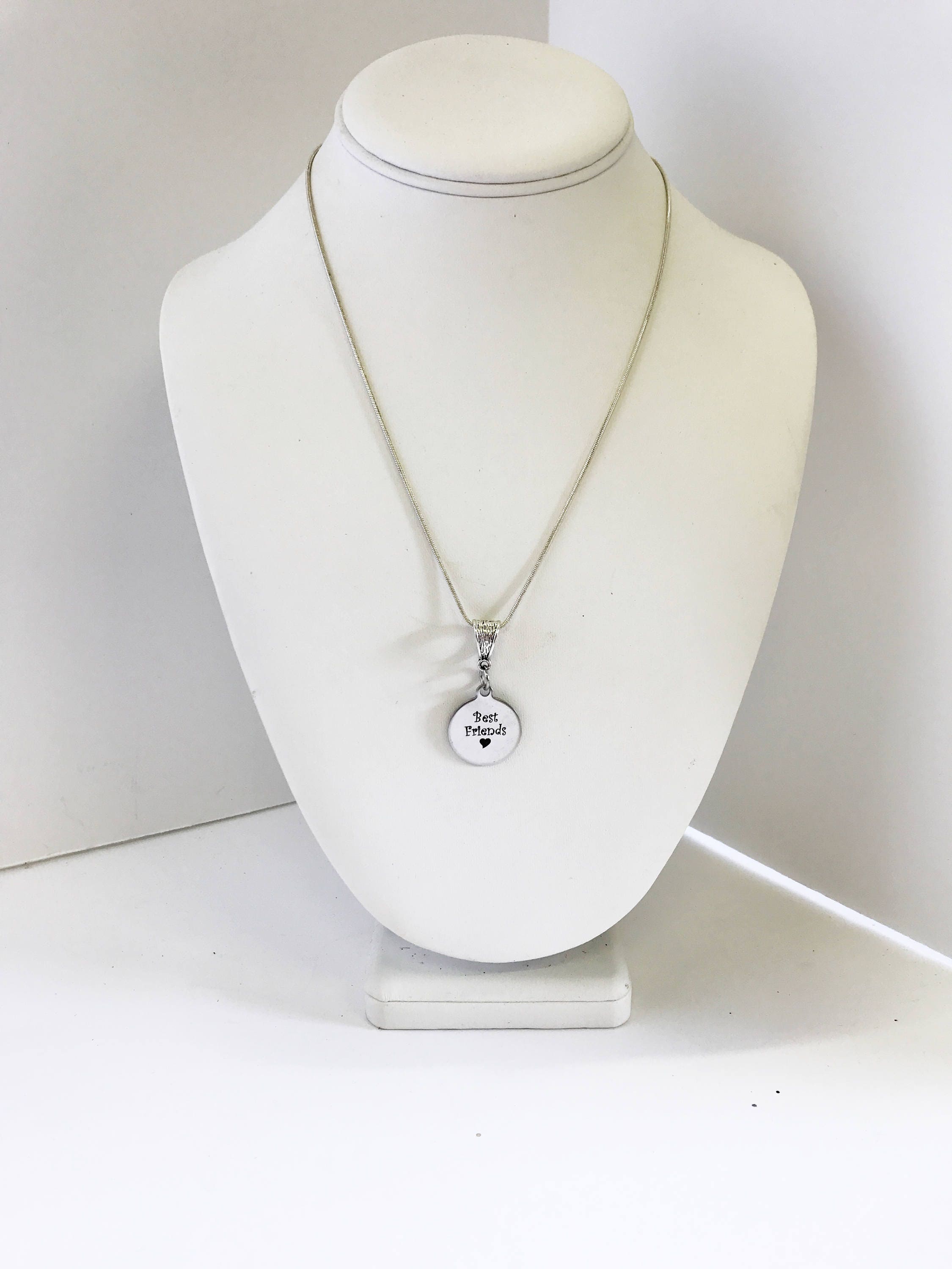 This is a beautiful stainless steel laser engraved pendant with "Best Friends" on your choice of a 16, 18, 20, 22, 24, 26, 28 or 30 inch sterling silver plated snake chain.