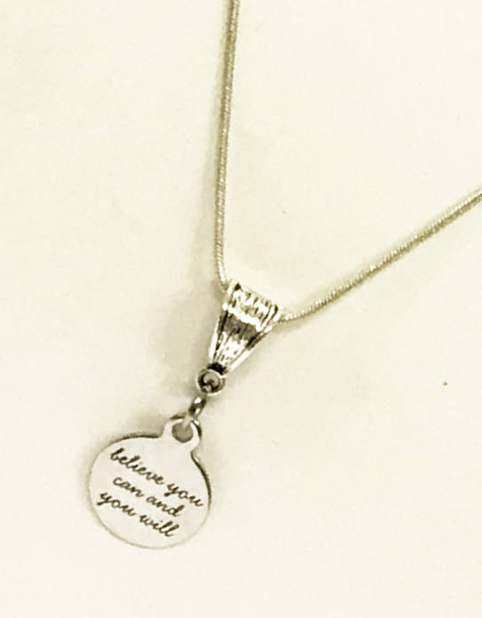 This simple but beautiful silver necklace has a laser engraved pendant that says "believe you can and you will". It would be a wonderful way to remind yourself that you can do what you put your mind to!