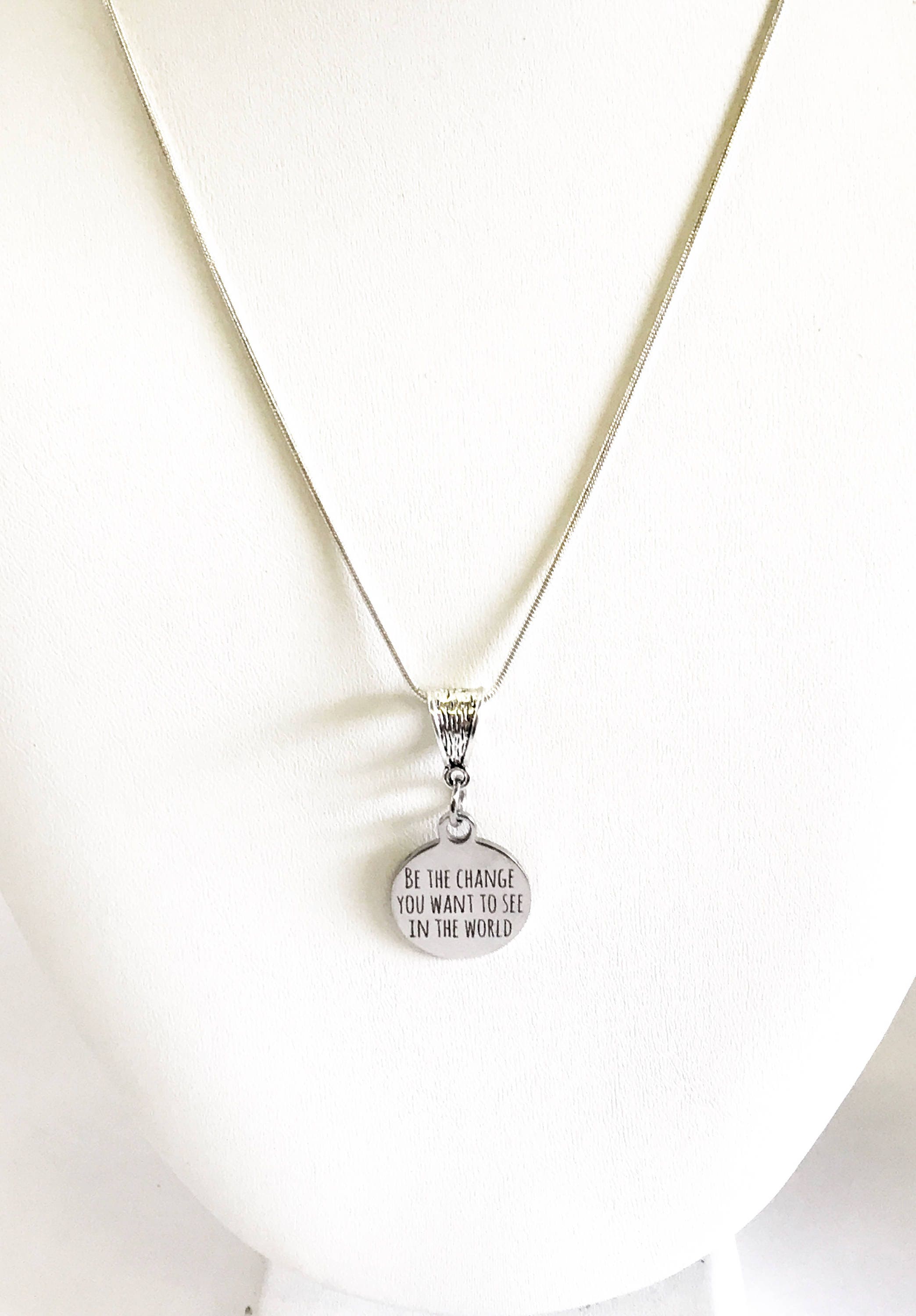 This is a stainlses steel laser engraved pendant on a sterling silver plated chain. The pendant has "Be the change you want to see in the world" on it. This pendant is available on your choice of 16, 18, 20, 22, 24, 26, 28 or 30 inch sterling silver chain. The pendant is also available for individual purchase if you have another chain on which you would like to wear it.
