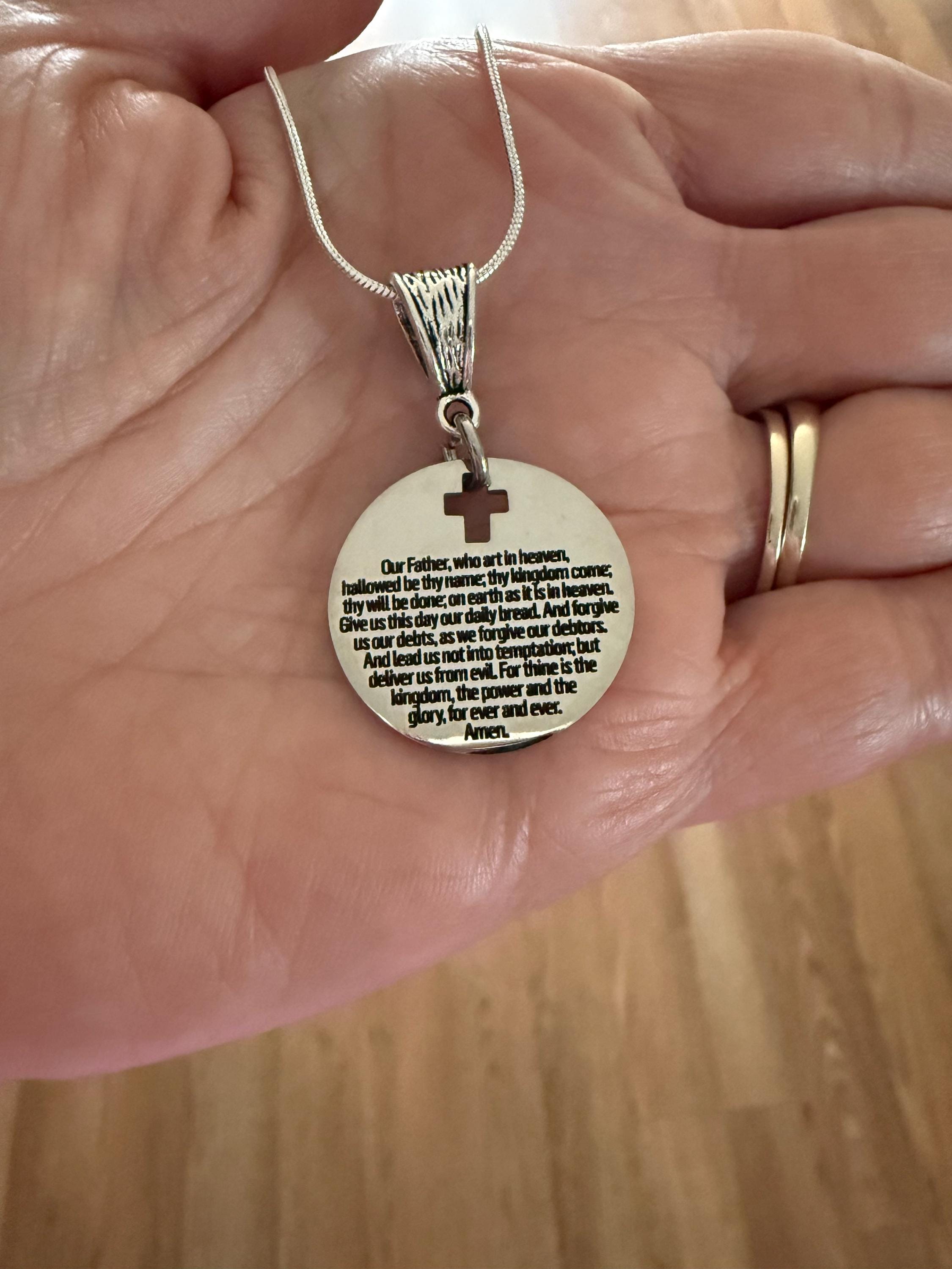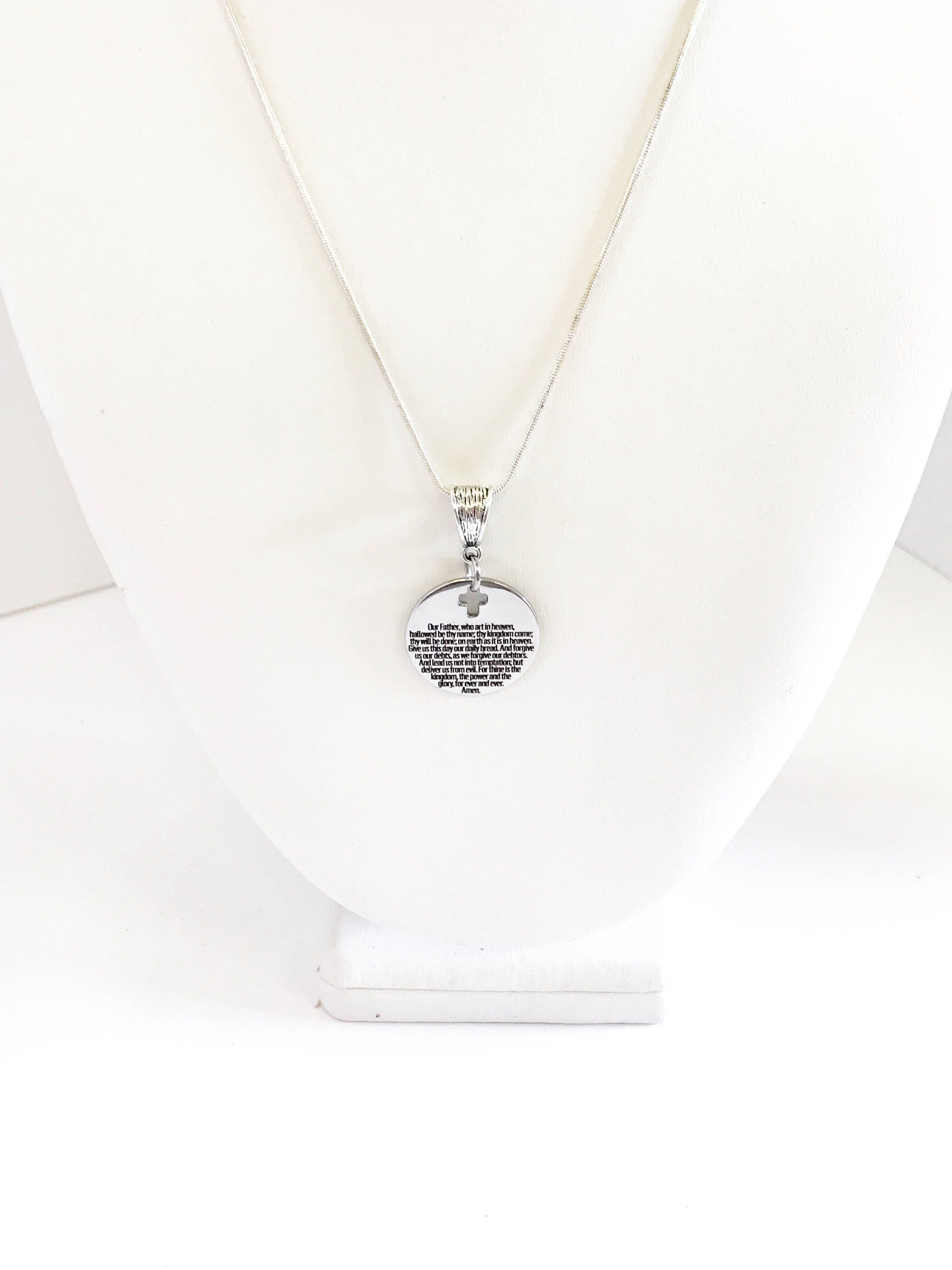 This is a stainlses steel laser engraved pendant on a sterling silver plated chain. The pendant has The Lord's Prayer on it. This pendant is available on your choice of 16, 18, 20, 22, 24, 26, 28 or 30 inch sterling silver chain. The pendant is also available for individual purchase if you have another chain on which you would like to wear it.