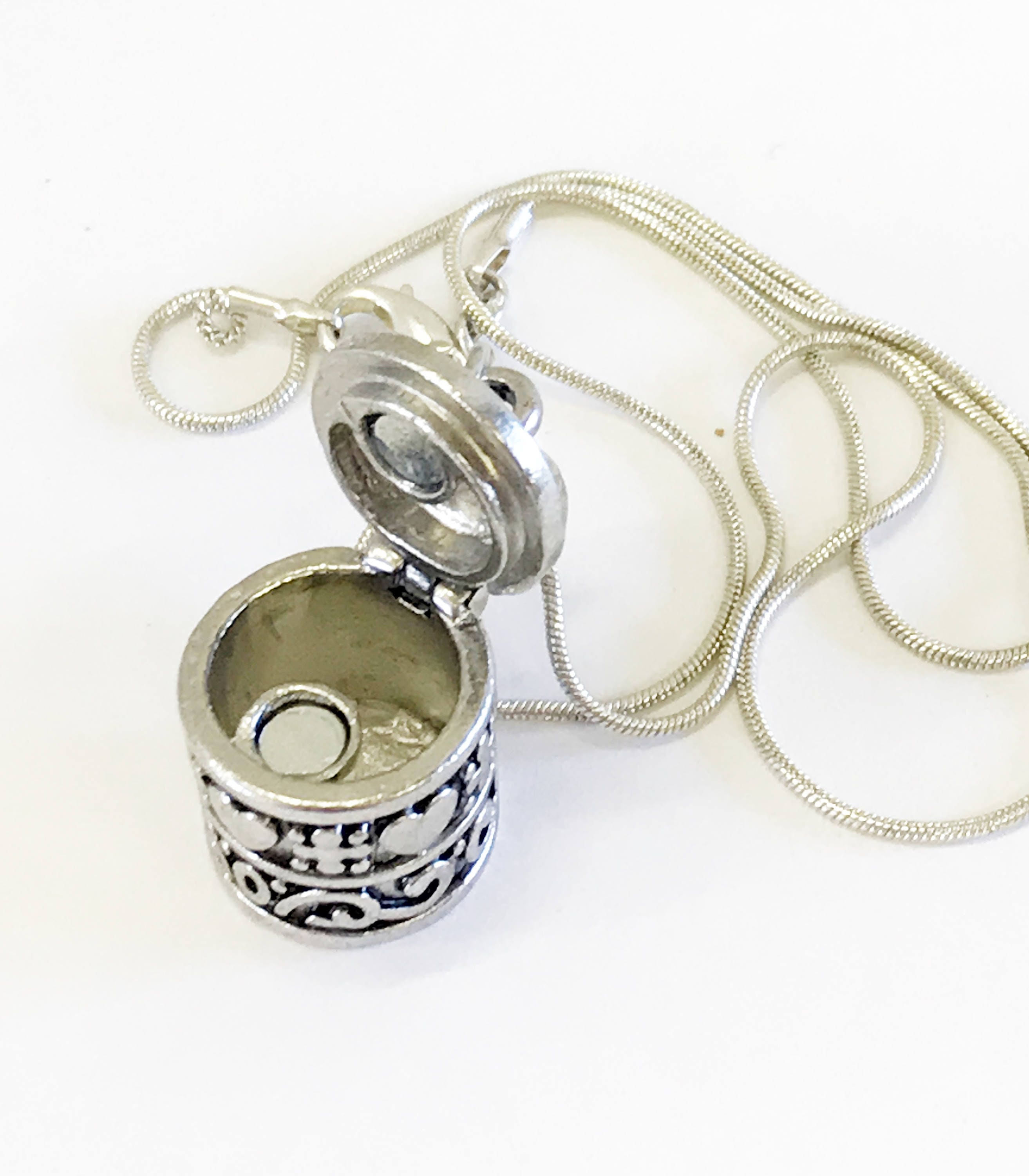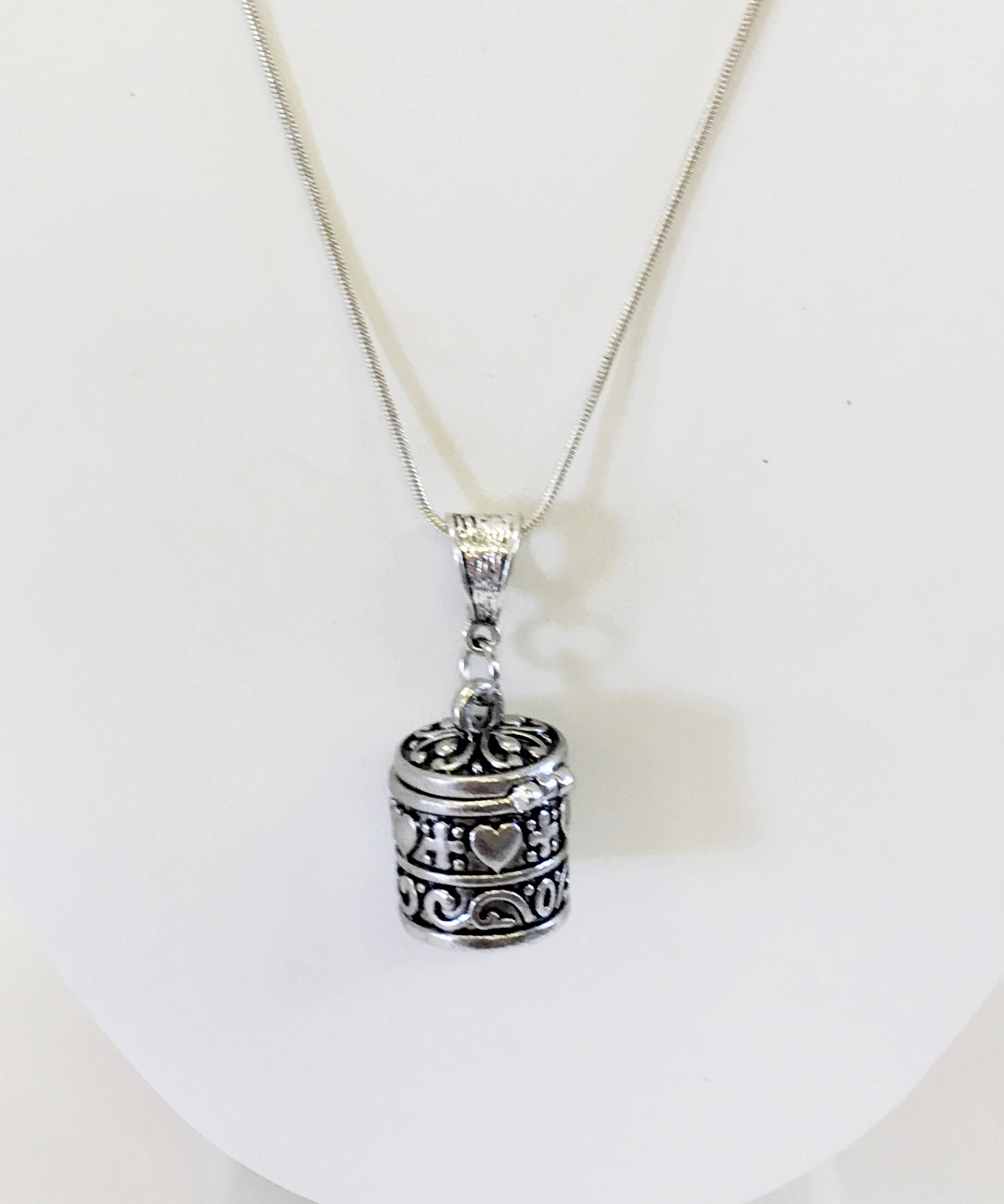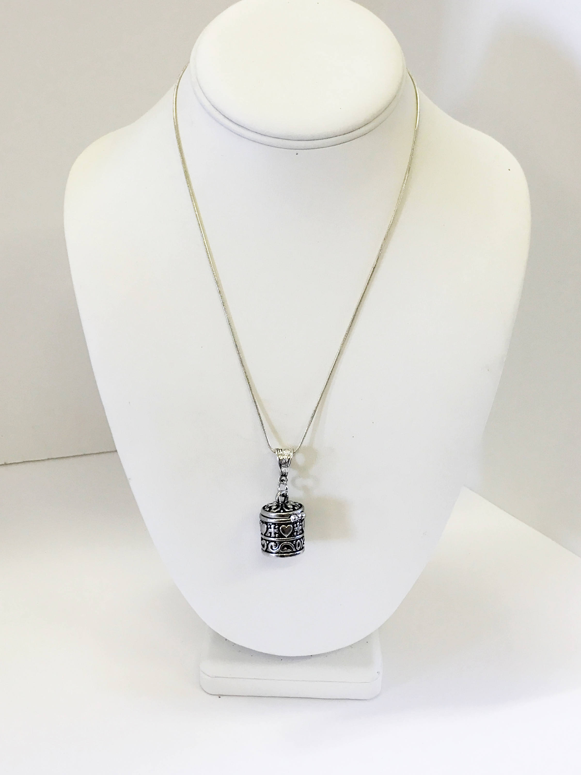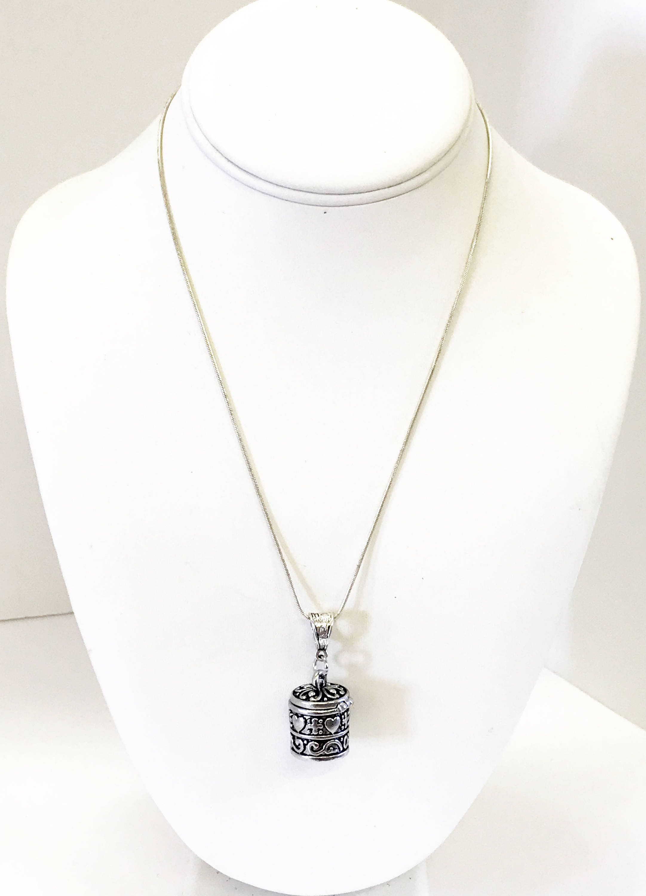 This is a silver prayer box pendant necklace. The prayer box is adorned with heart and cross markings and is worn to focus the wearer's mind on prayerful thoughts or secret wishes.