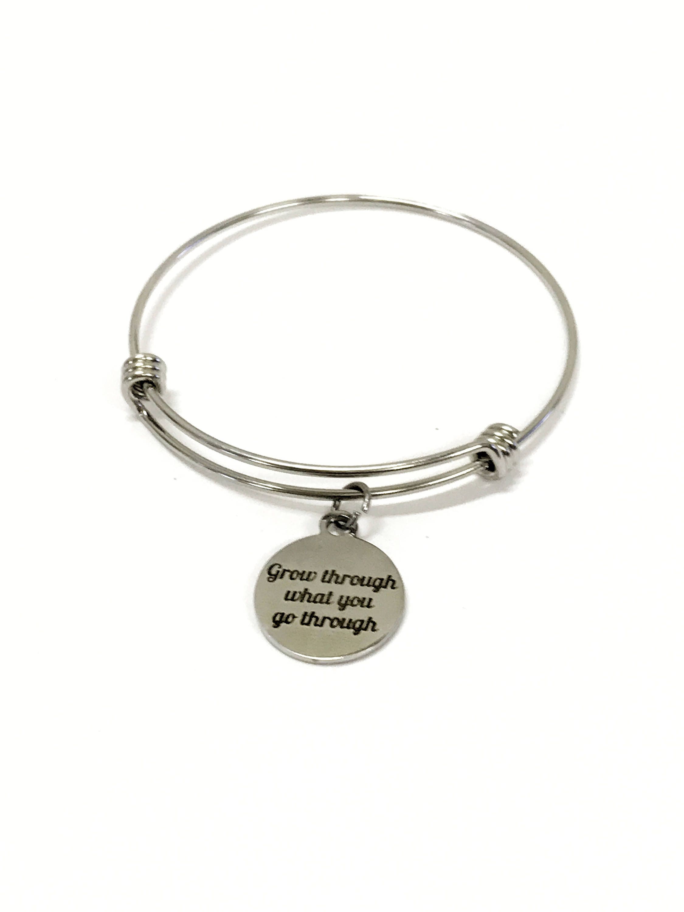 This bracelet is a beautiful reminder to "Grow through what you go through". The charm is a laser engraved stainless steel charm and this bracelet is made of stainless steel and will not tarnish or turn and will withstand regular wear and tear. The bracelet easily expands to fit on any wrist size.