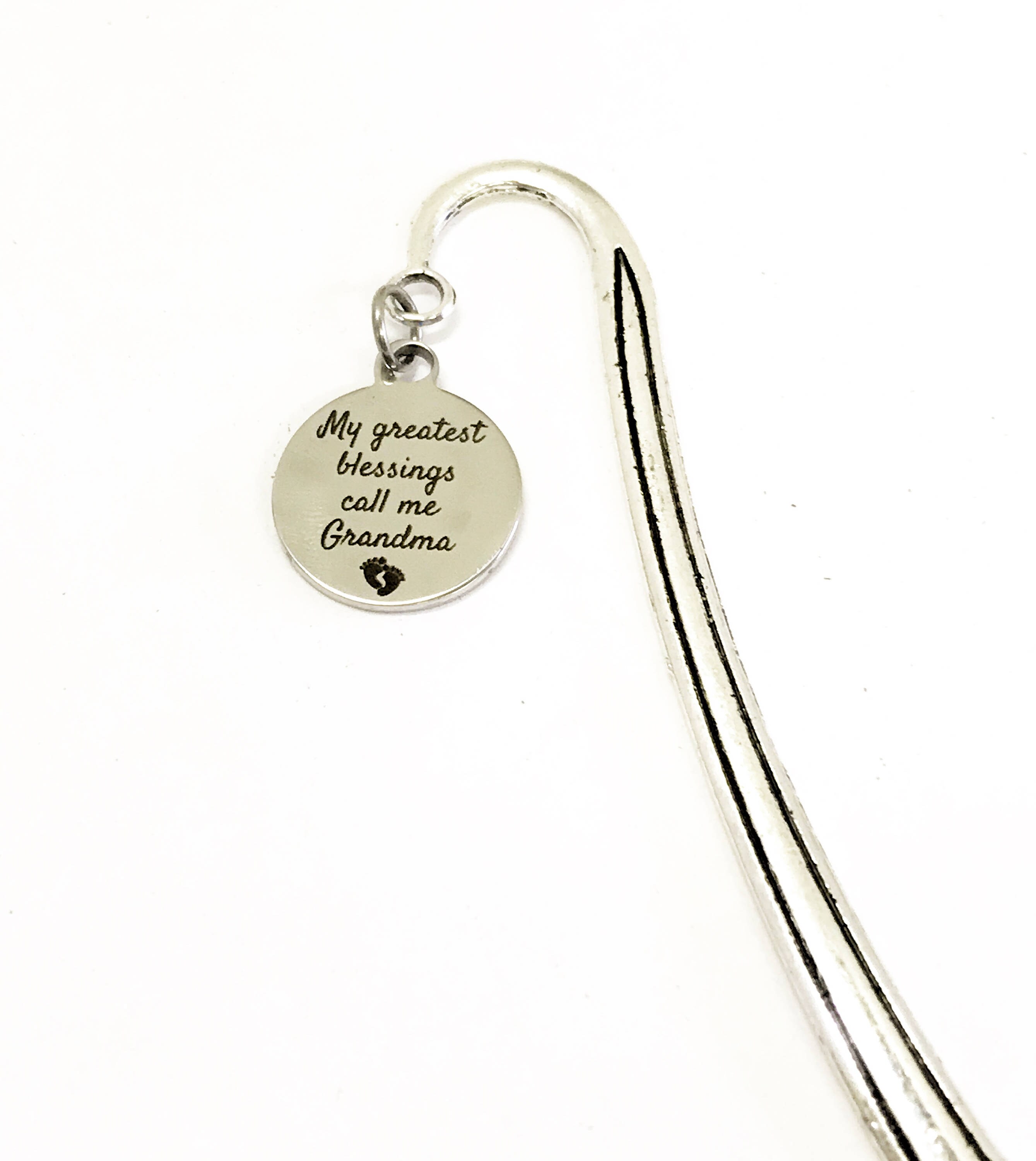 This is a great grandma gift! It is a metal bookmark that has a stainless steel laser engraved charm that has "My greatest blessings call me Grandma" on it. The bookmark measures approx. 4.9 Inches in length.