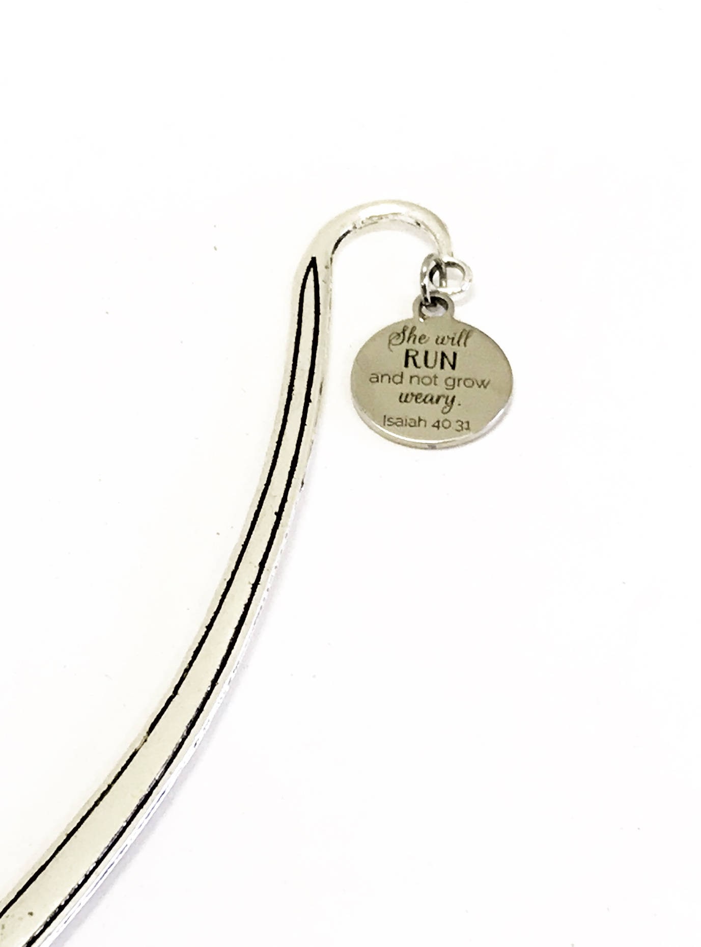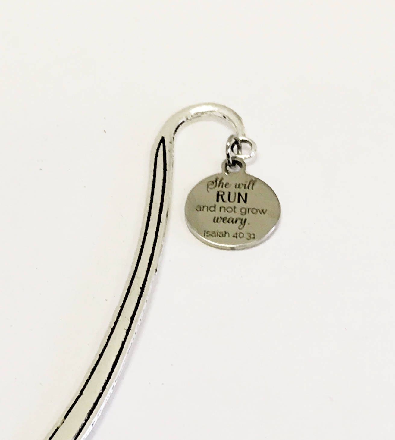 This is a great reader gift! It is a metal bookmark that has a stainless steel laser engraved charm that has "She will run and not grow weary" on it. The bookmark measures approx. 4.9 Inches in length.