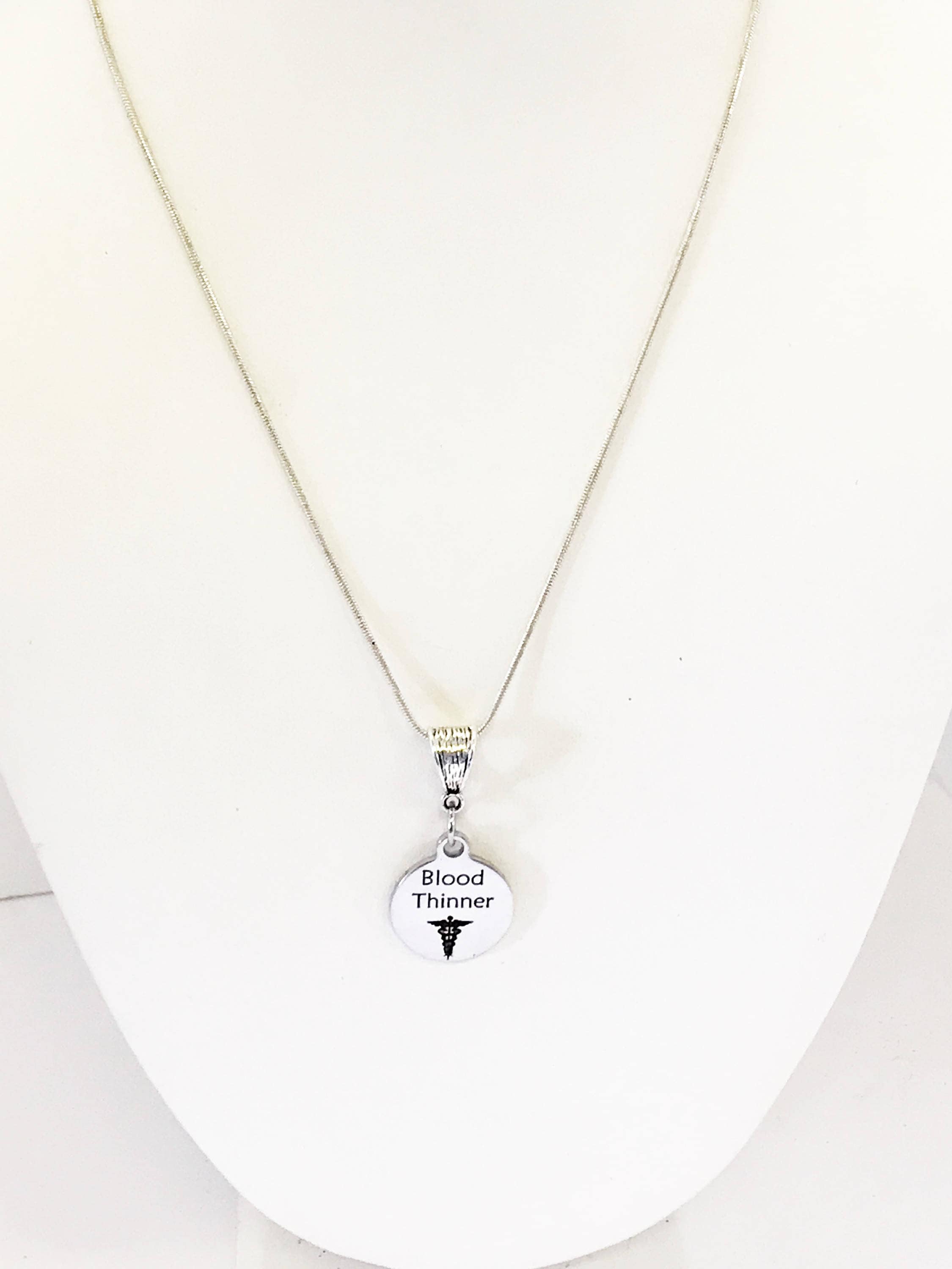 This is a stainless steel laser engraved pendant on a sterling silver plated chain. The pendant has a Blood Thinner medical condition symbol on it. This pendant is available on your choice of 16, 18, 20, 22, 24, 26, 28 or 30 inch sterling silver plated snake chain. The pendant is also available for individual purchase if you have another chain on which you would like to wear it.