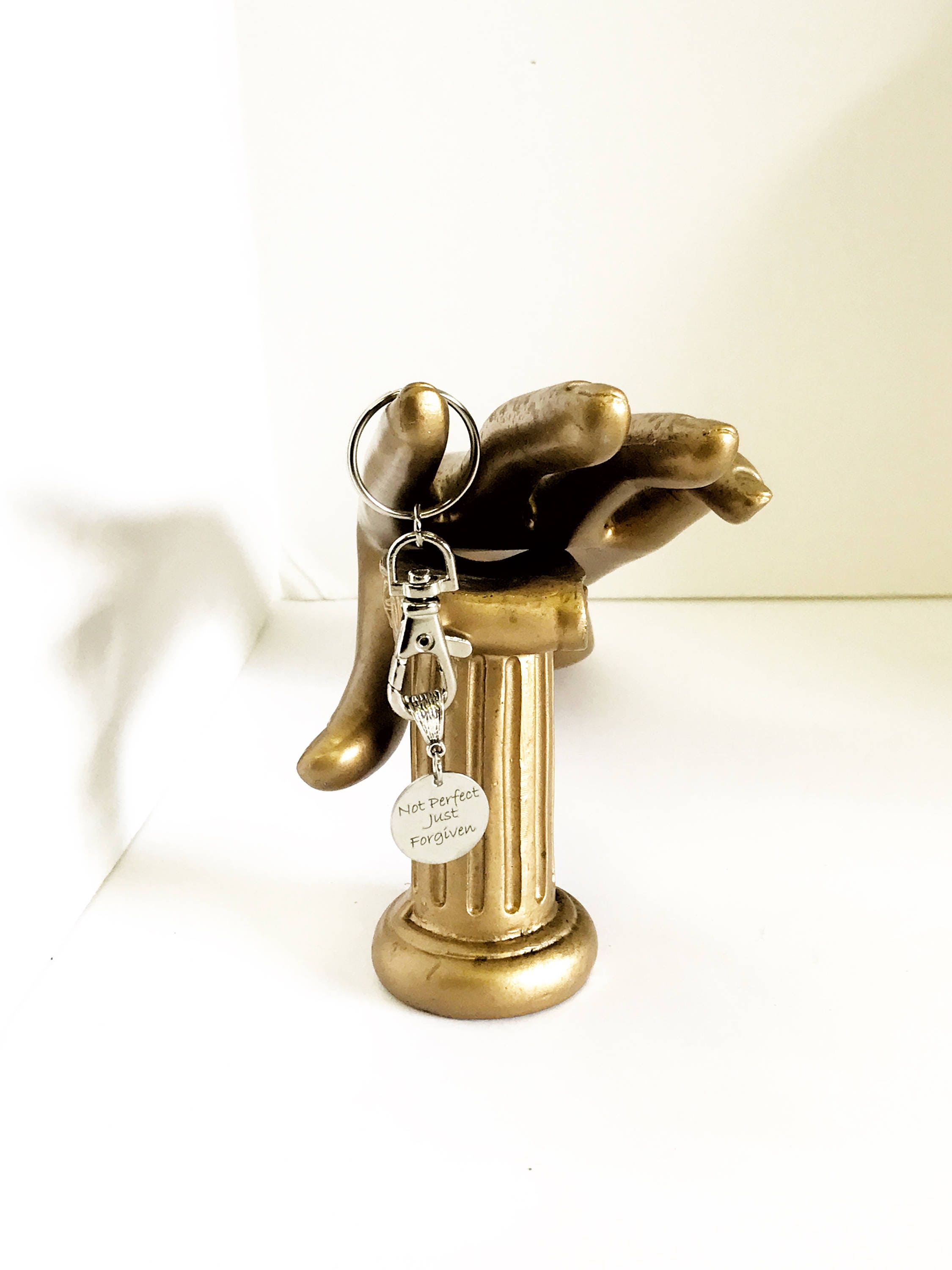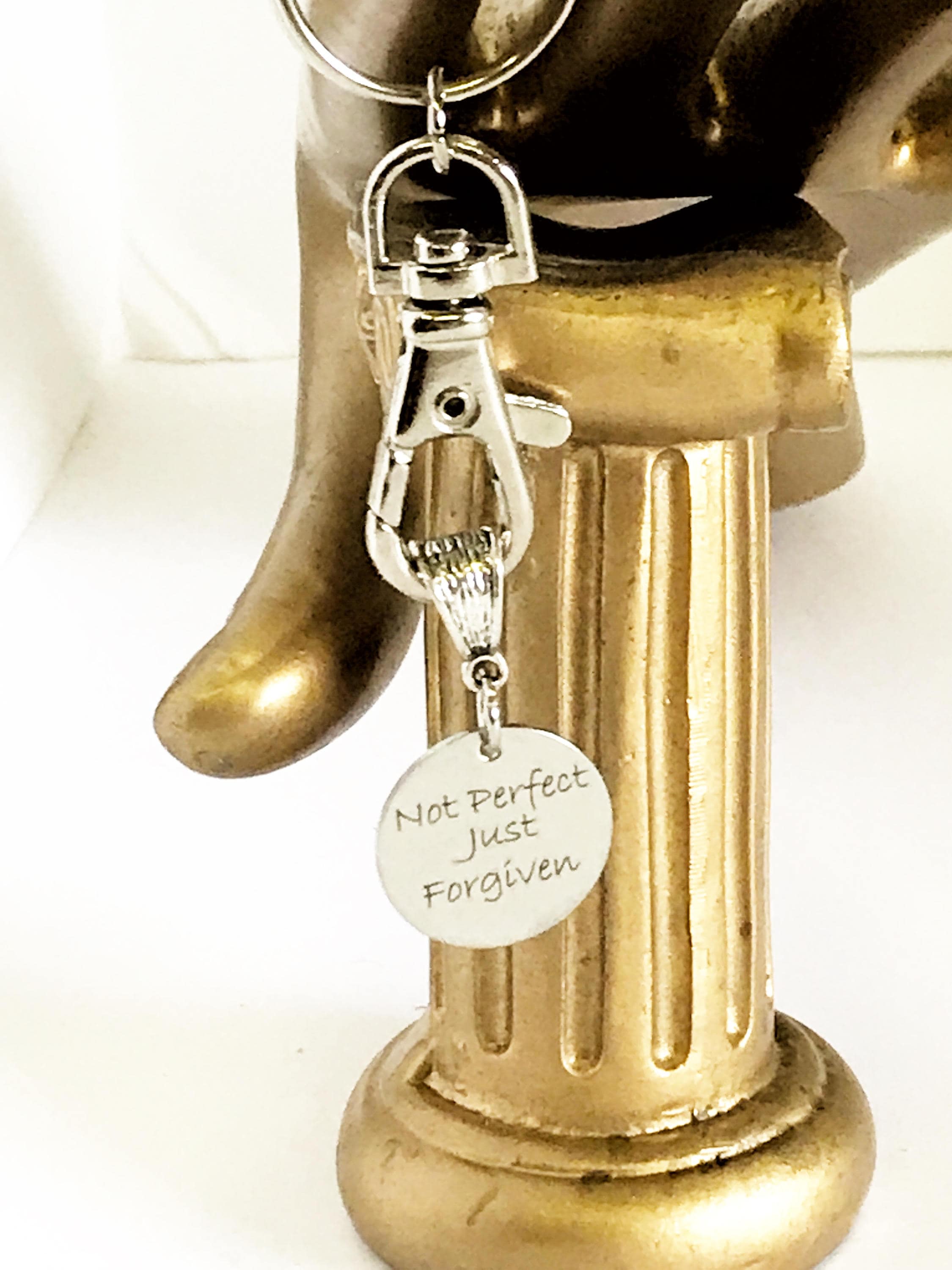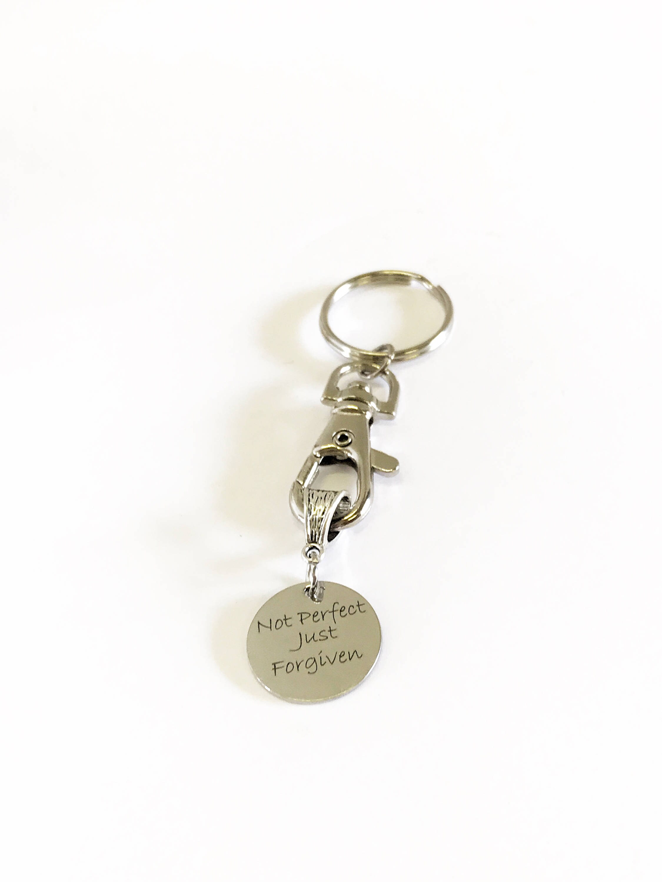 This keychain includes a stainless steel laser engraved charm that has "Not Perfect Just Forgiven" on it.