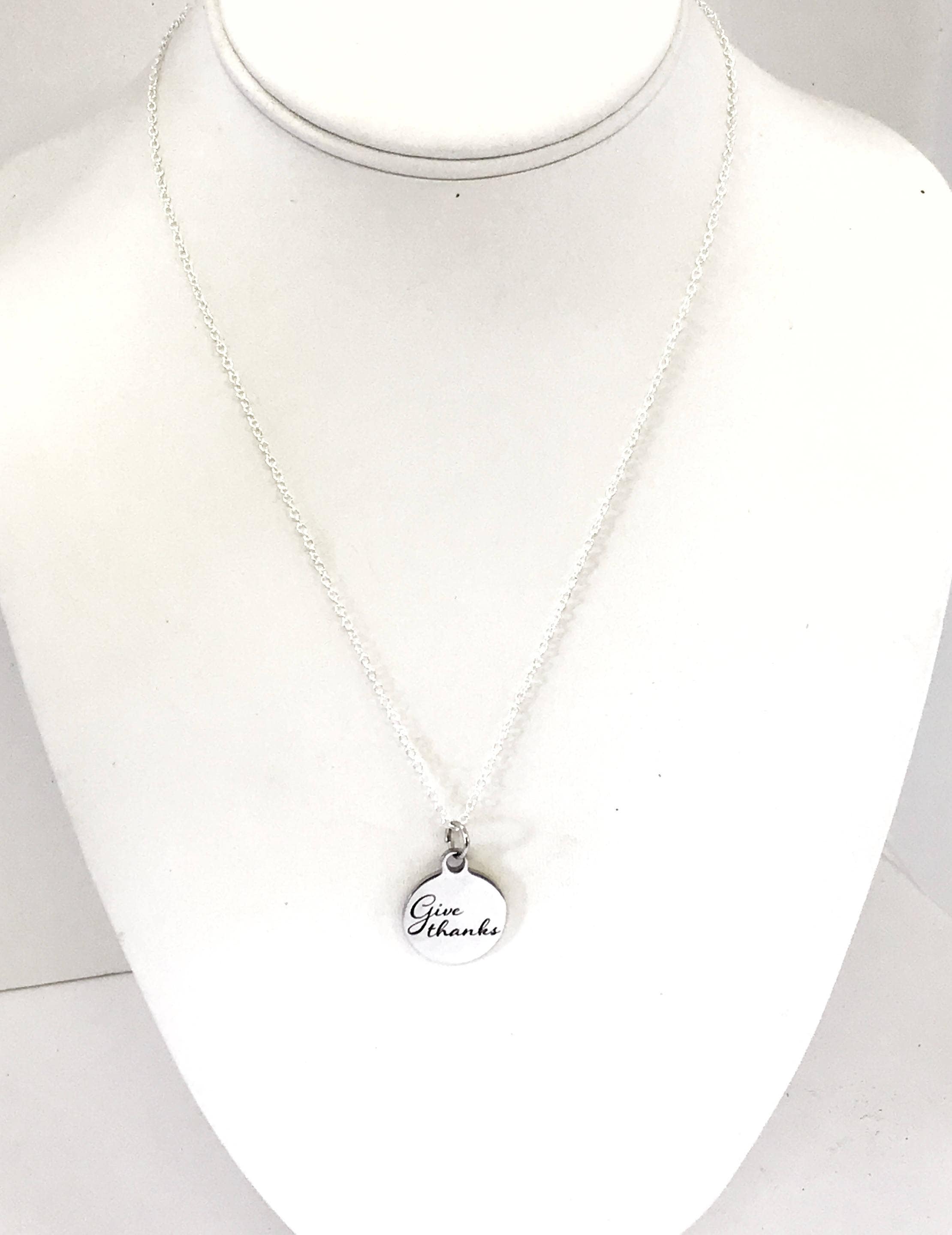 This is a stainless steel laser engraved pendant on a sterling silver plated chain. The pendant has "Give Thanks" on it. This pendant is available on your choice of 16, 18, 20, 22, 24, 26, 28 or 30 inch sterling silver plated link chain. The pendant is also available for individual purchase if you have another chain on which you would like to wear it.