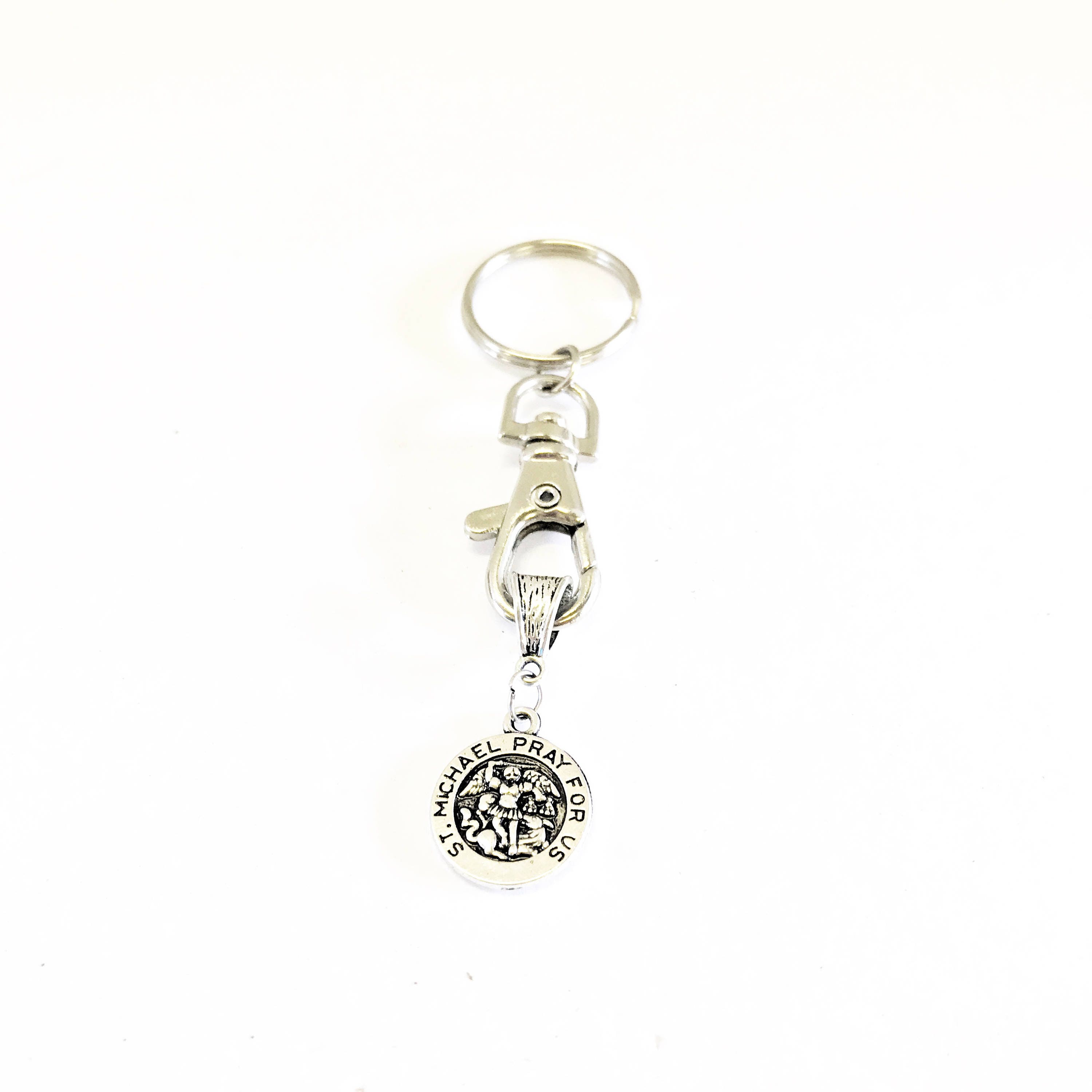 This is a great keychain with a silver tone pendant that says "St. Michael Pray For Us" on it.