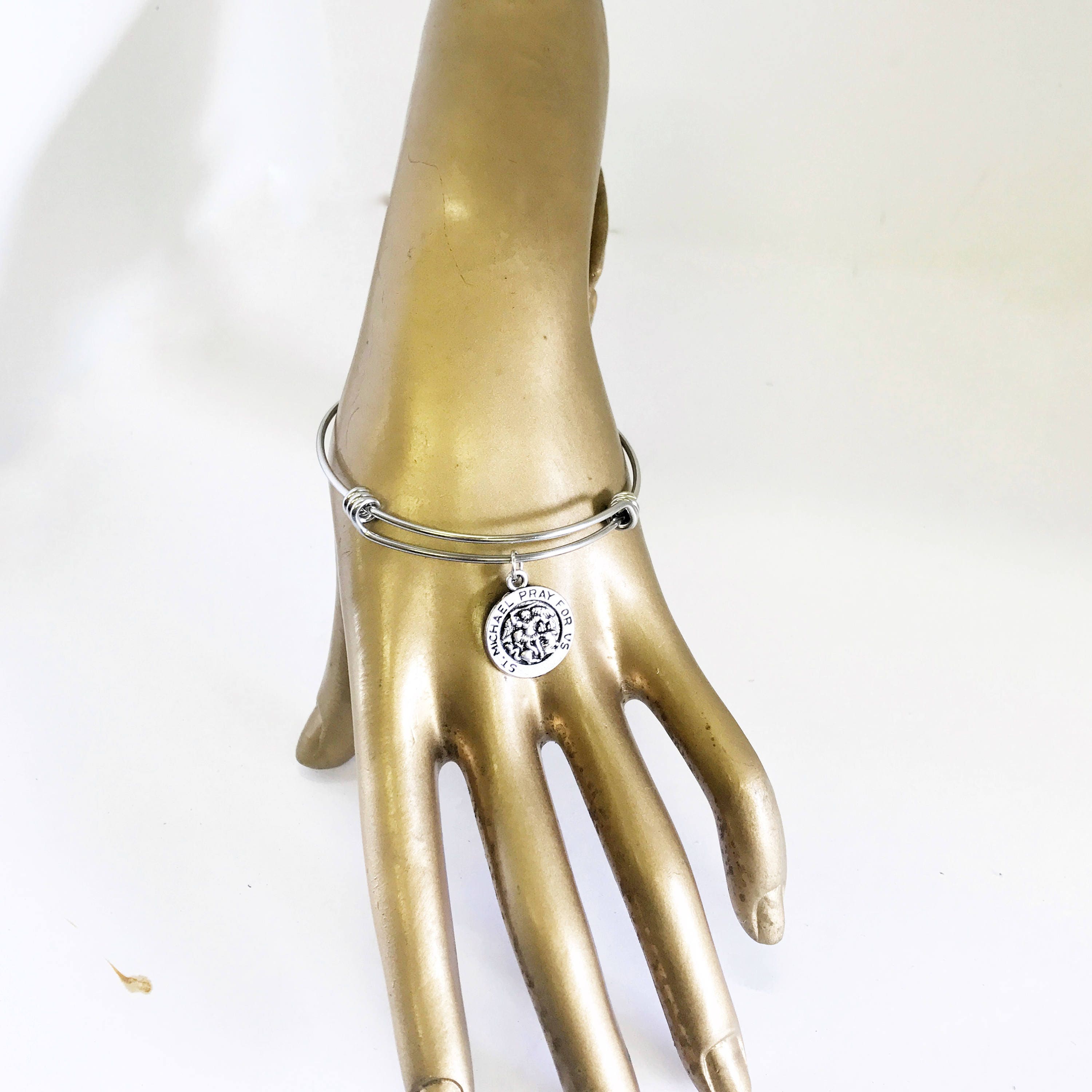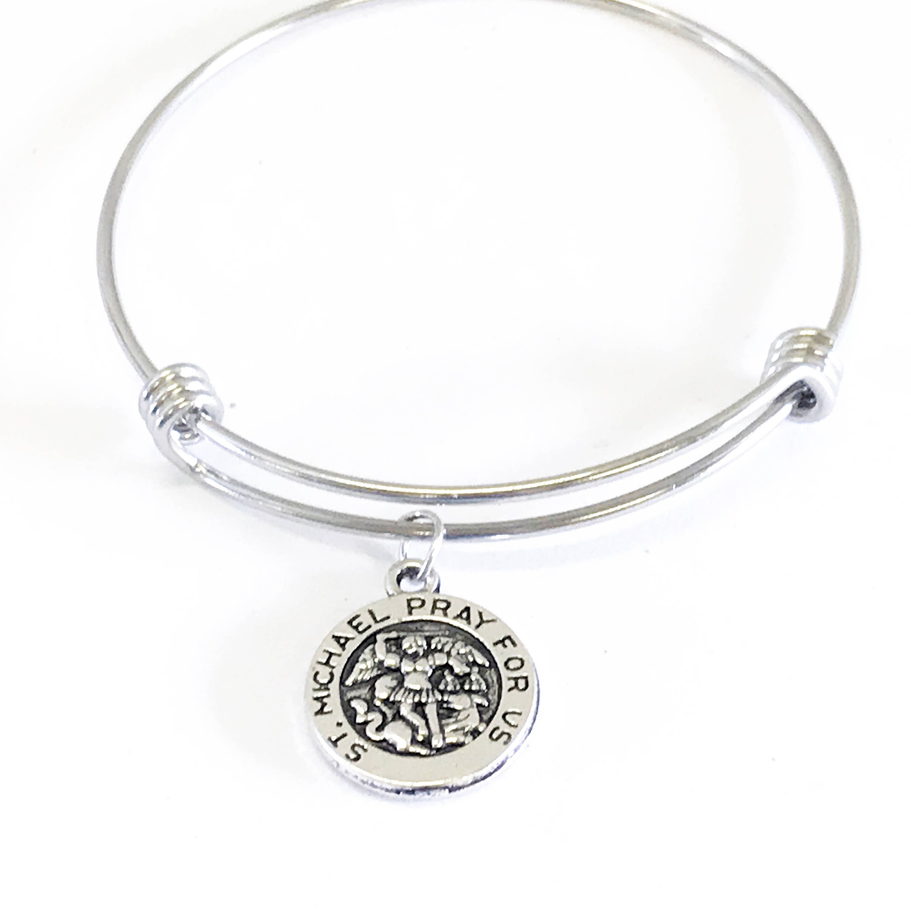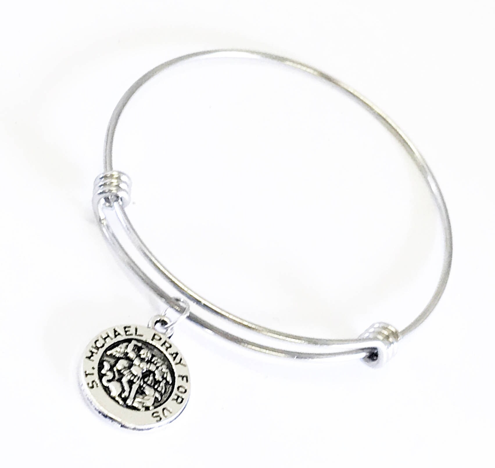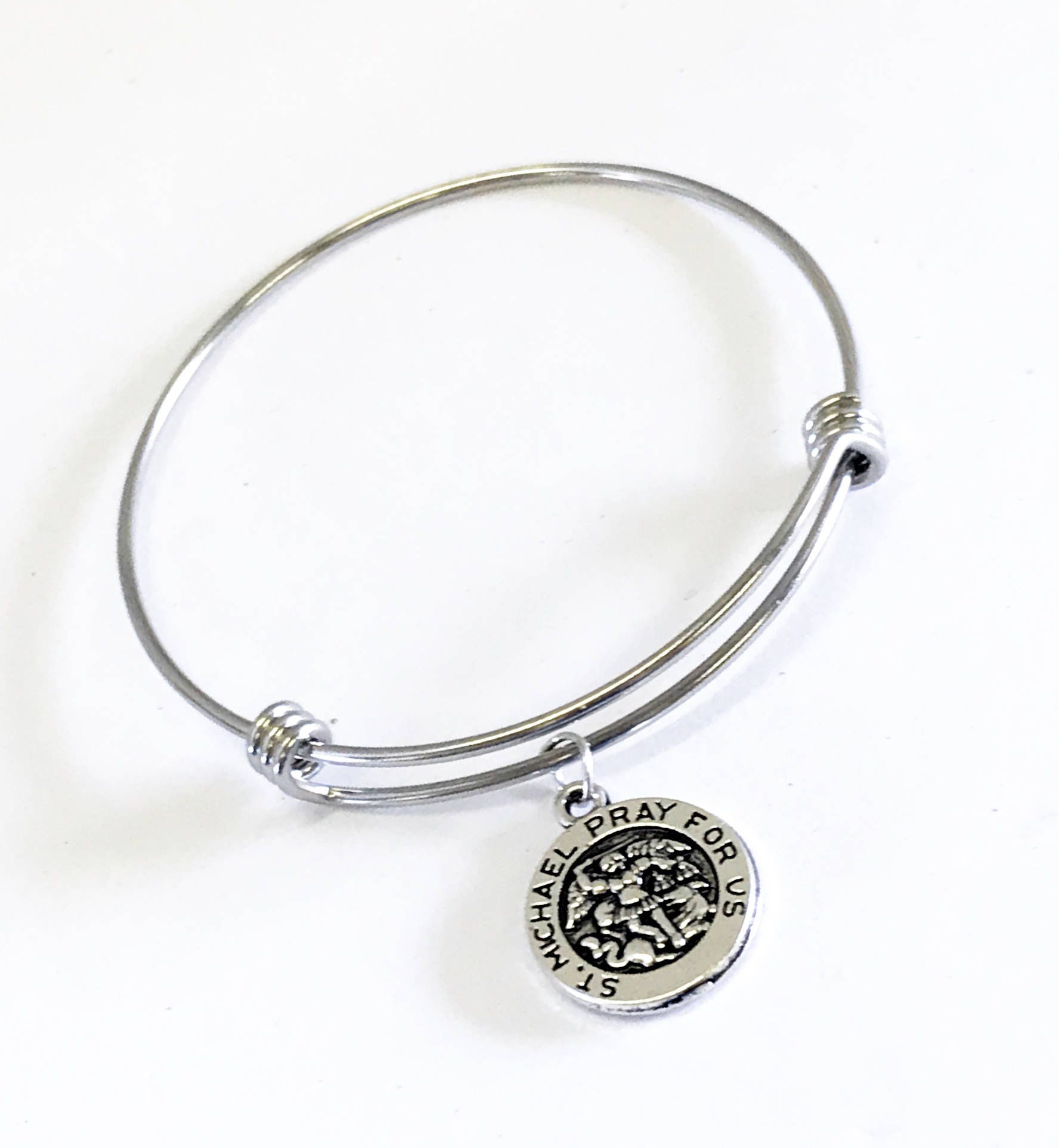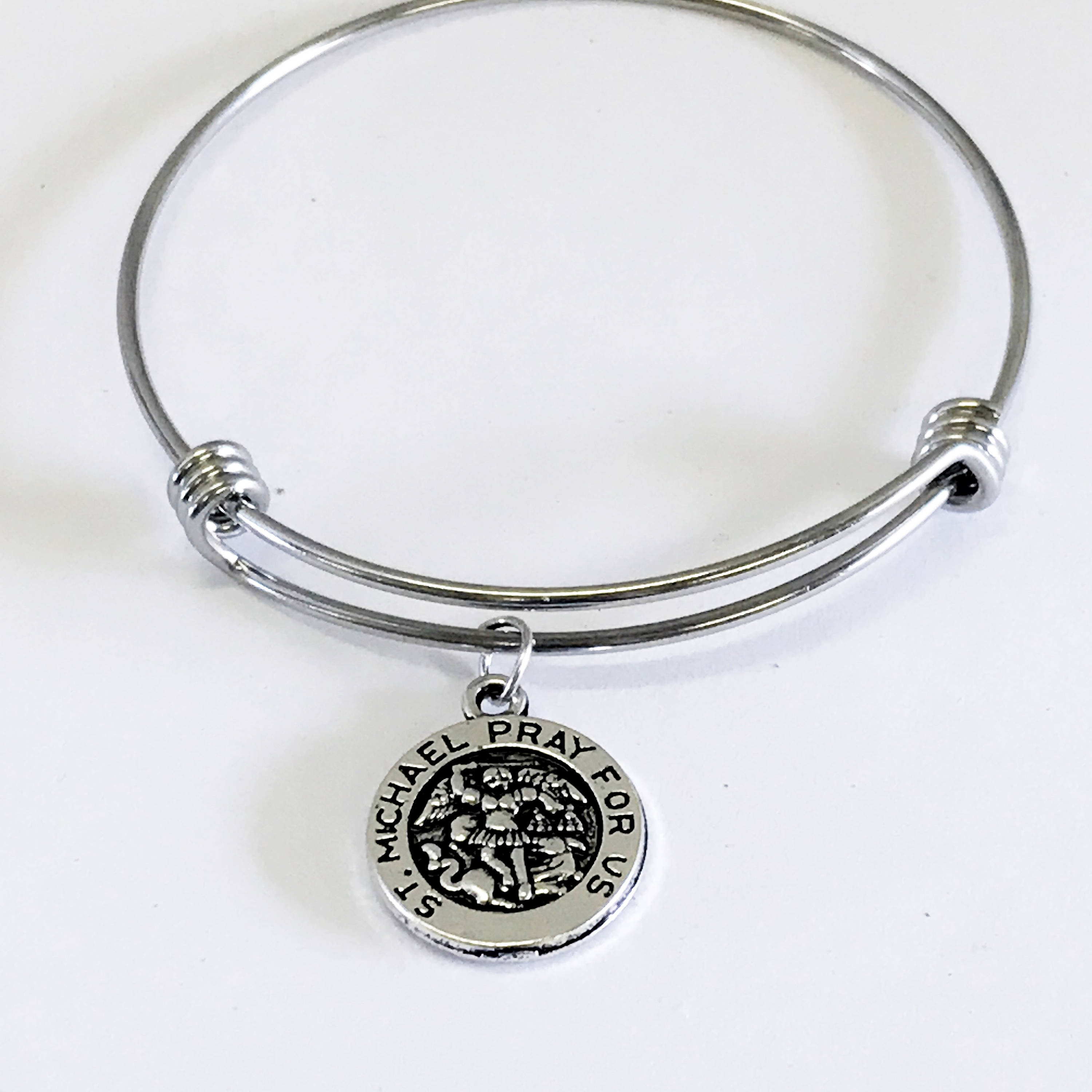 This beautiful bracelet has a silvertone charm that says "St Michael Pray For Us".