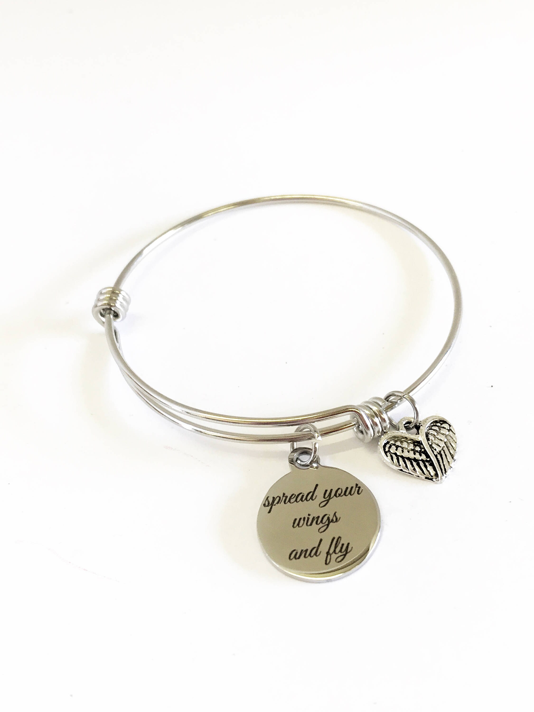This is a beautiful bangle bracelet with a laser engraved stainless steel charm that has "Spread Your Wings And Fly" on it. It is available in your choice of either silver tone metal or stainless steel (shown) and expands to easily fit on any wrist size. This would be a great gift of encouragement for someone you love.