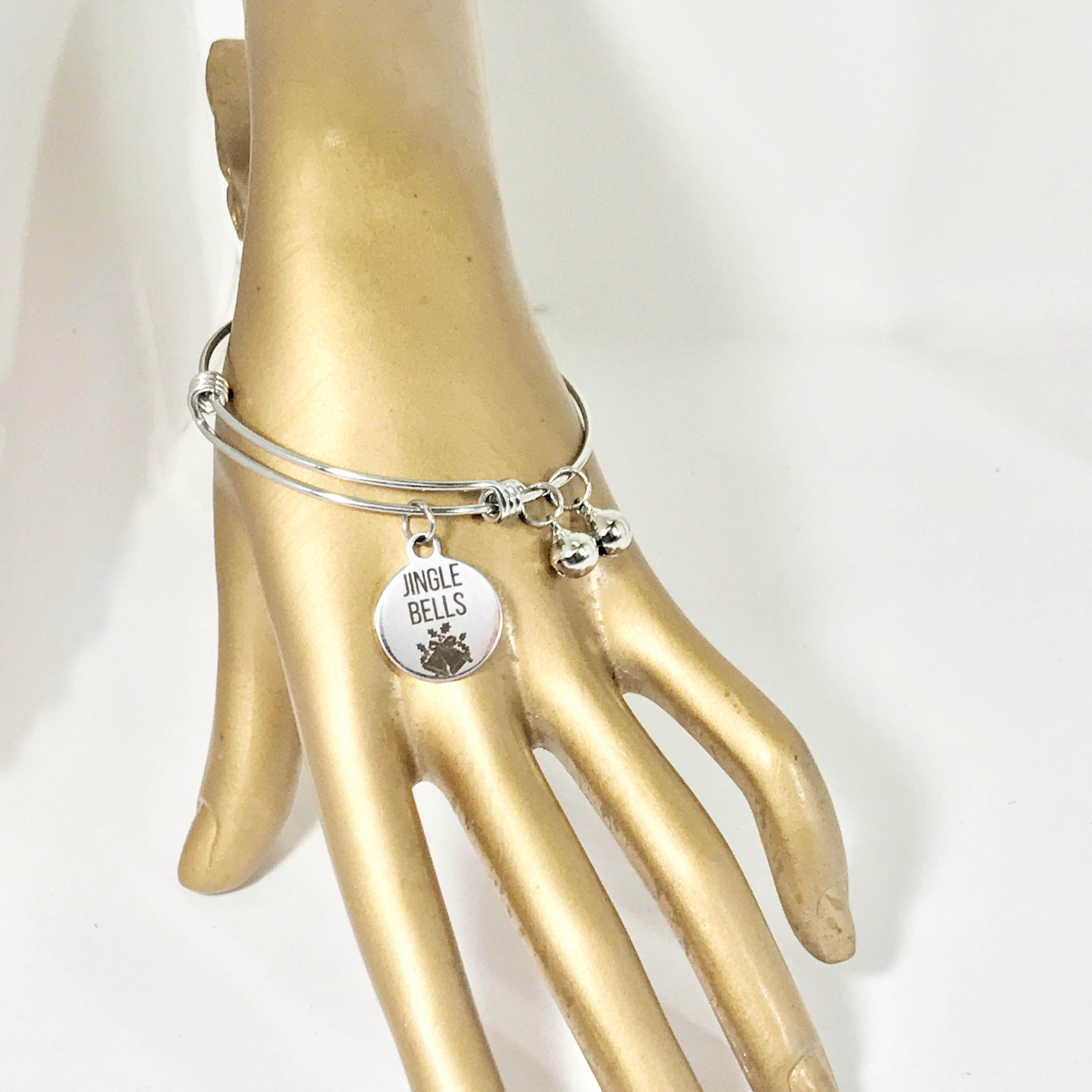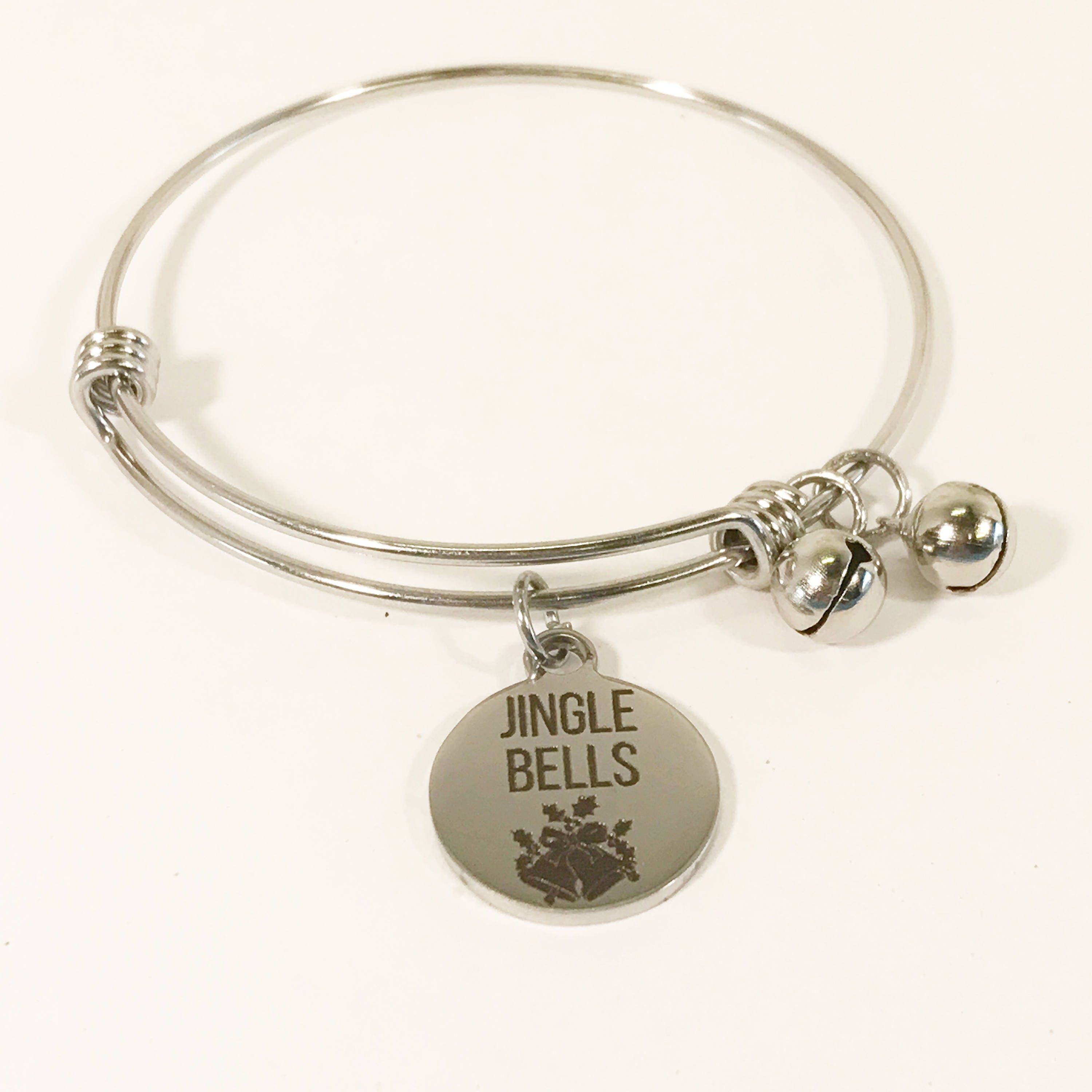 This bracelet has a stainless steel laser engraved charm that has "Jingle Bells" and two small bells on it.