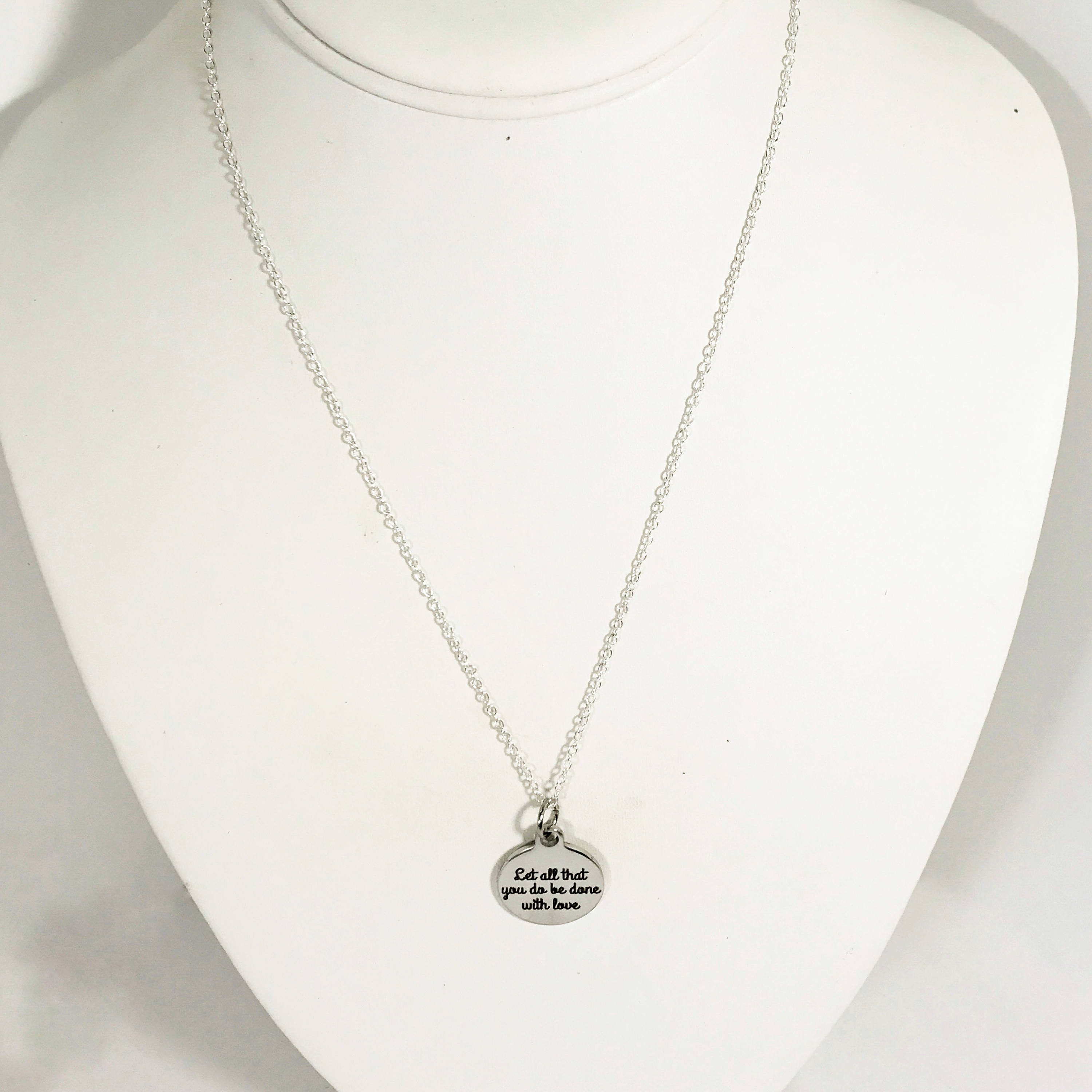 This is a beautiful stainless steel laser engraved charm with "Let all that you do be done with love" from 1 Cor. 16:14 on it.