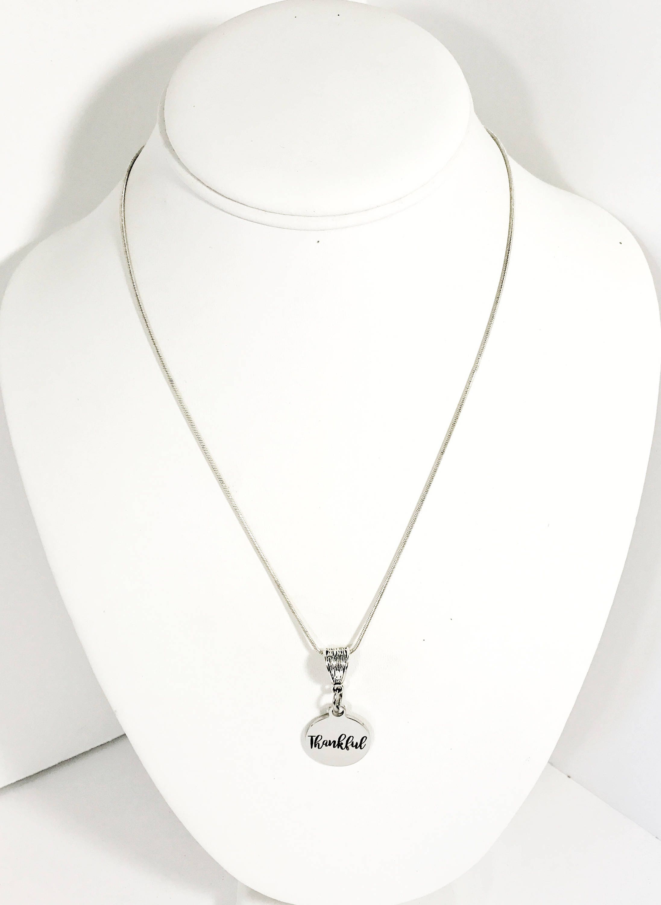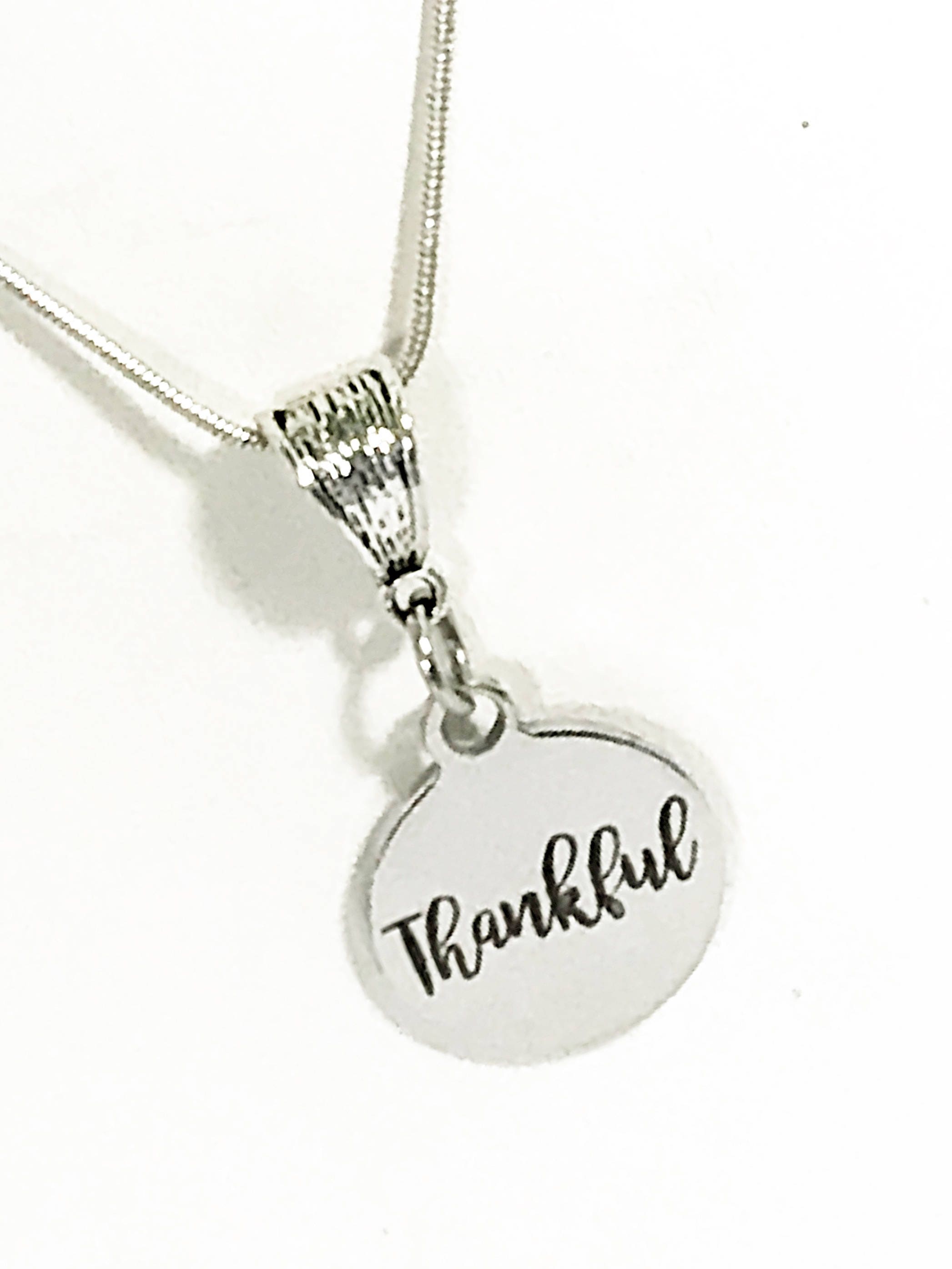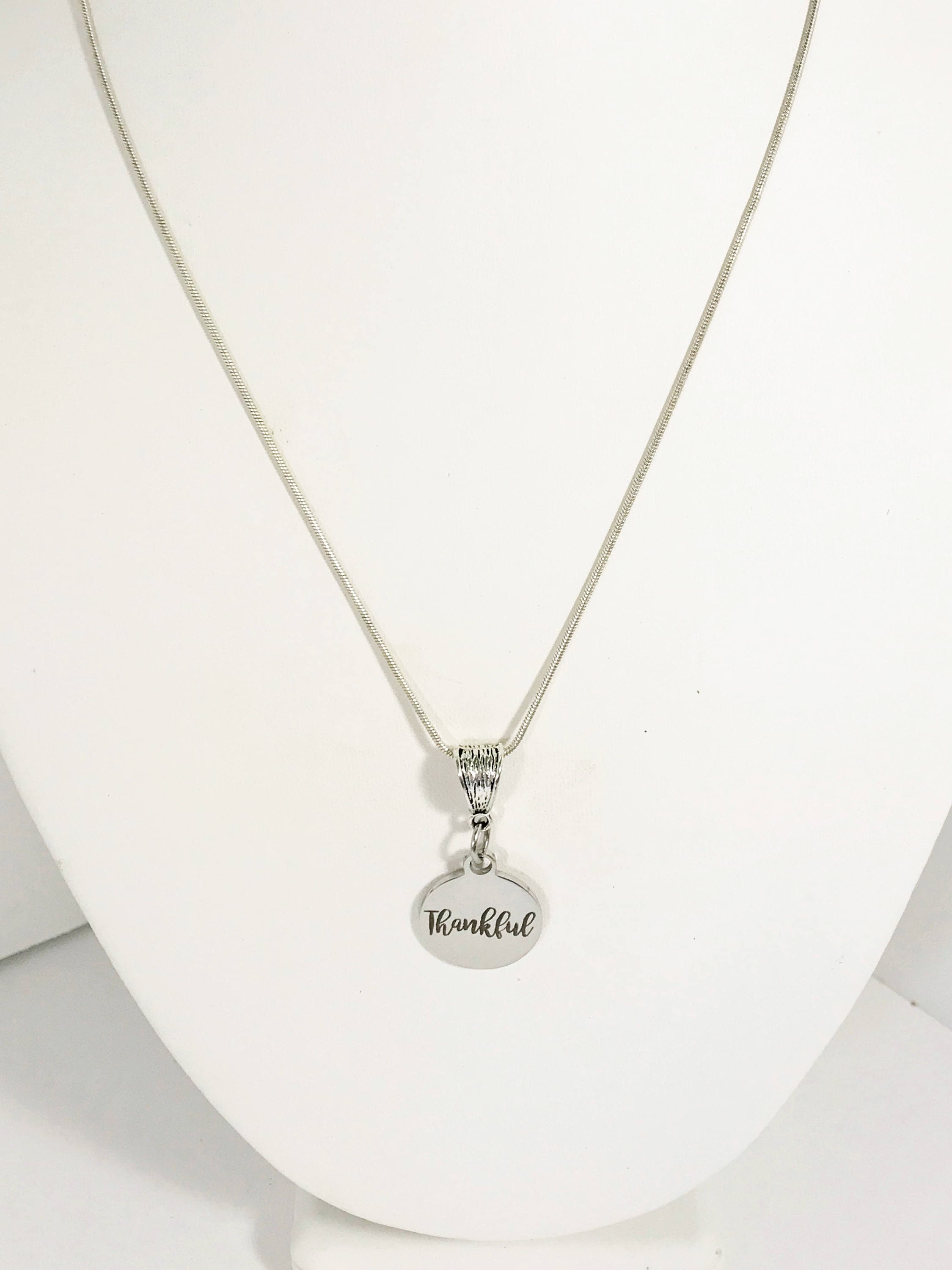 This silver necklace is a simple but beautiful gift for a loved one in your life. It is a stainless steel laser engraved charm that says "Thankful" on a silver plated snake chain.