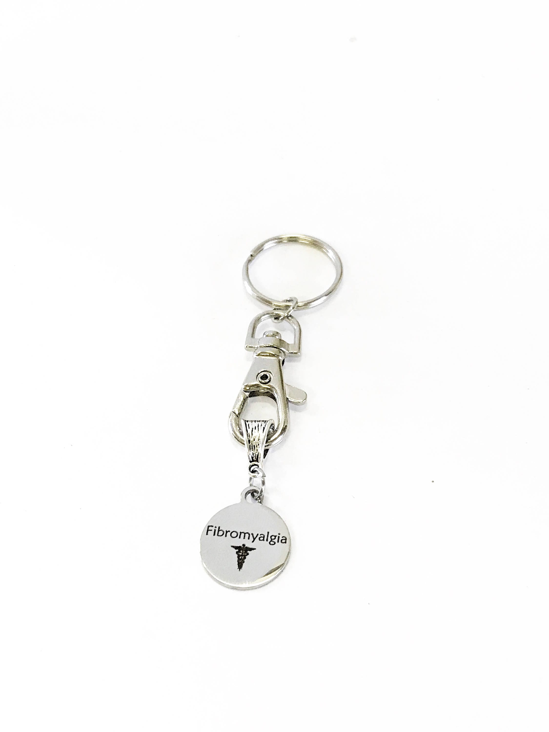 This keychain includes a stainless steel laser engraved Fibromyalgia medical ID or medical awareness charm.