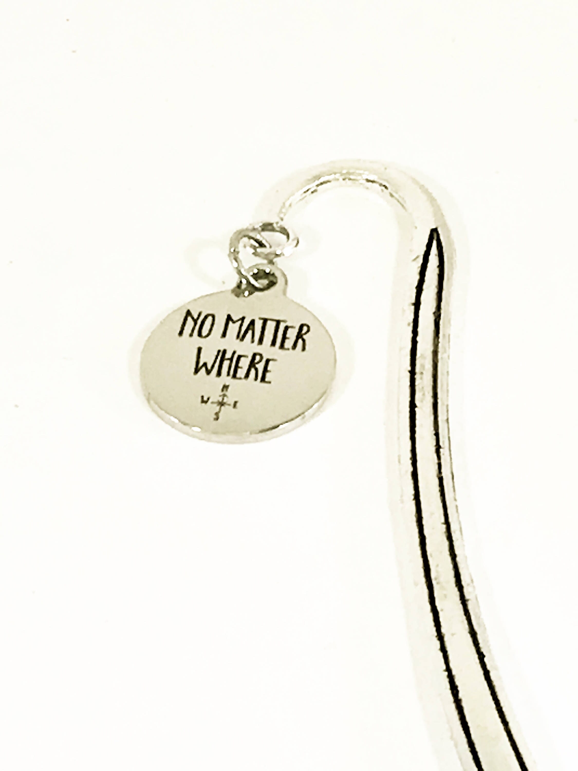 This is a great reader gift or Bible bookmark. It is a metal bookmark with a stainless steel laser engraved charm that says "No Matter Where" with a compass on it. The bookmark measures approx. 4.9 Inches in length.