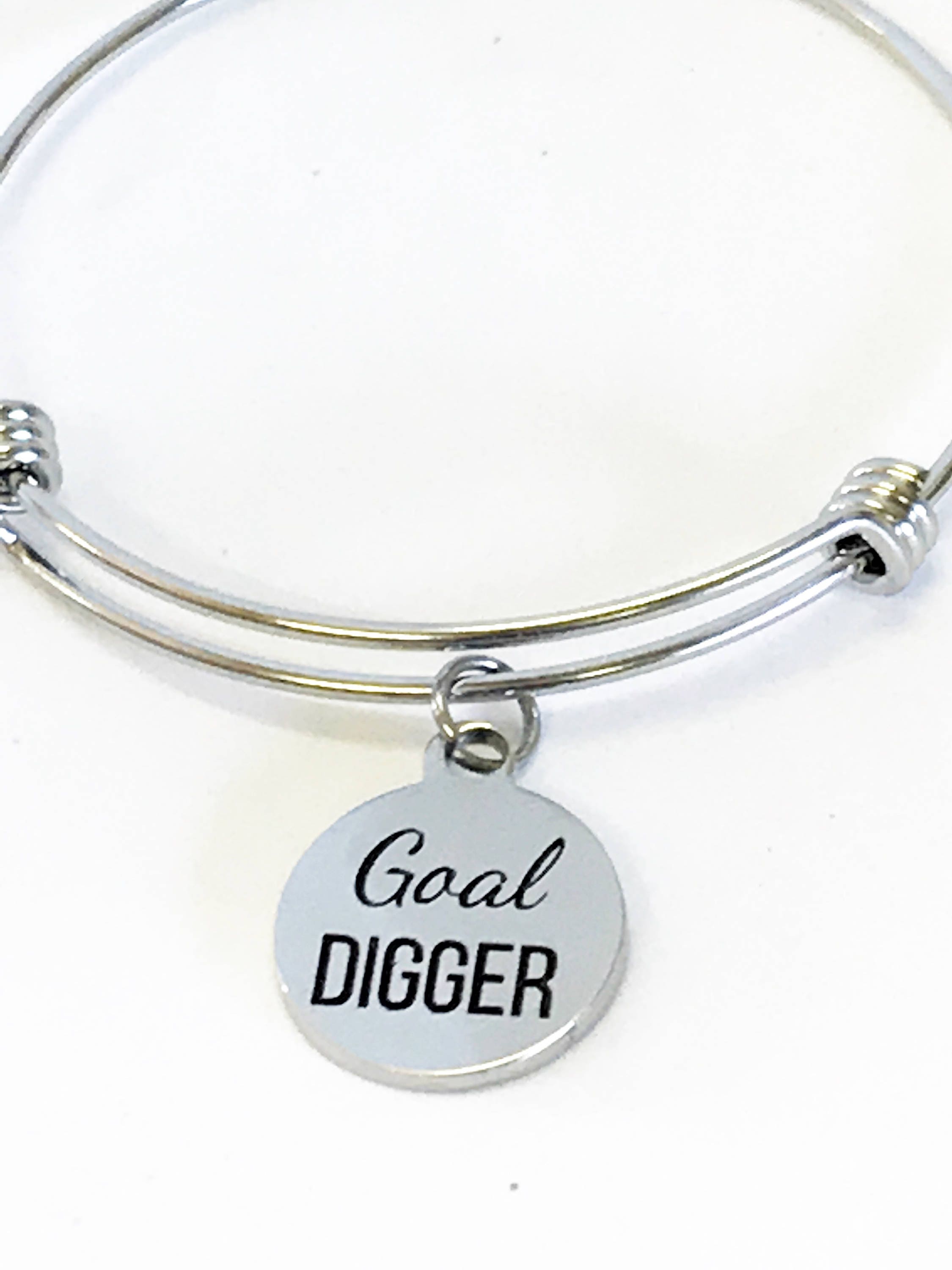 Want to celebrate the success of completing a Goal that you have set for yourself? This is a beautiful bangle bracelet with a laser engraved stainless steel charm that has "Goal Digger" on it. It is available in your choice of either silver tone metal or stainless steel (shown) and expands to easily fit on any wrist size.