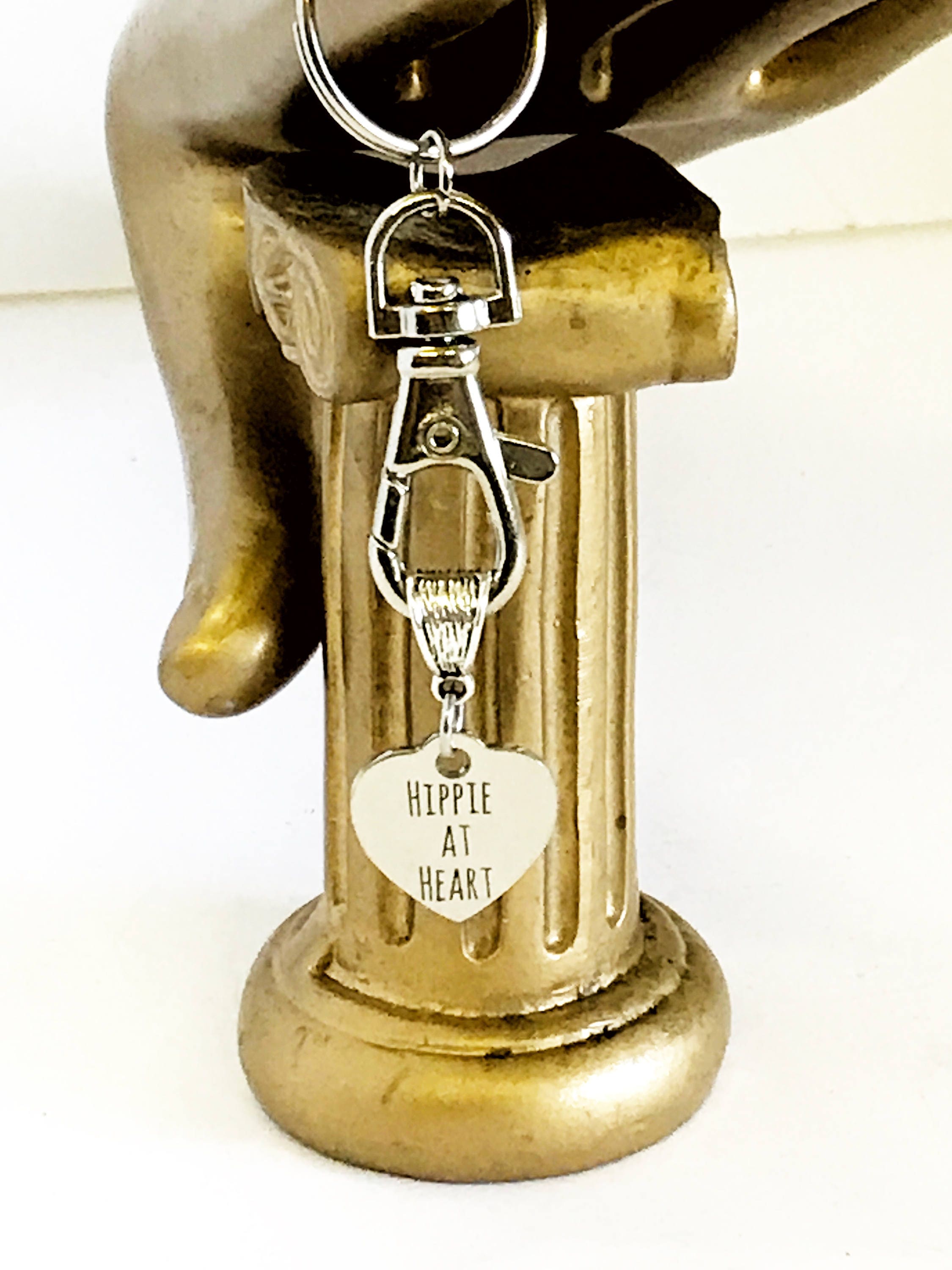 This keychain includes a stainless steel laser engraved heart charm with "Hippie At Heart" on it.