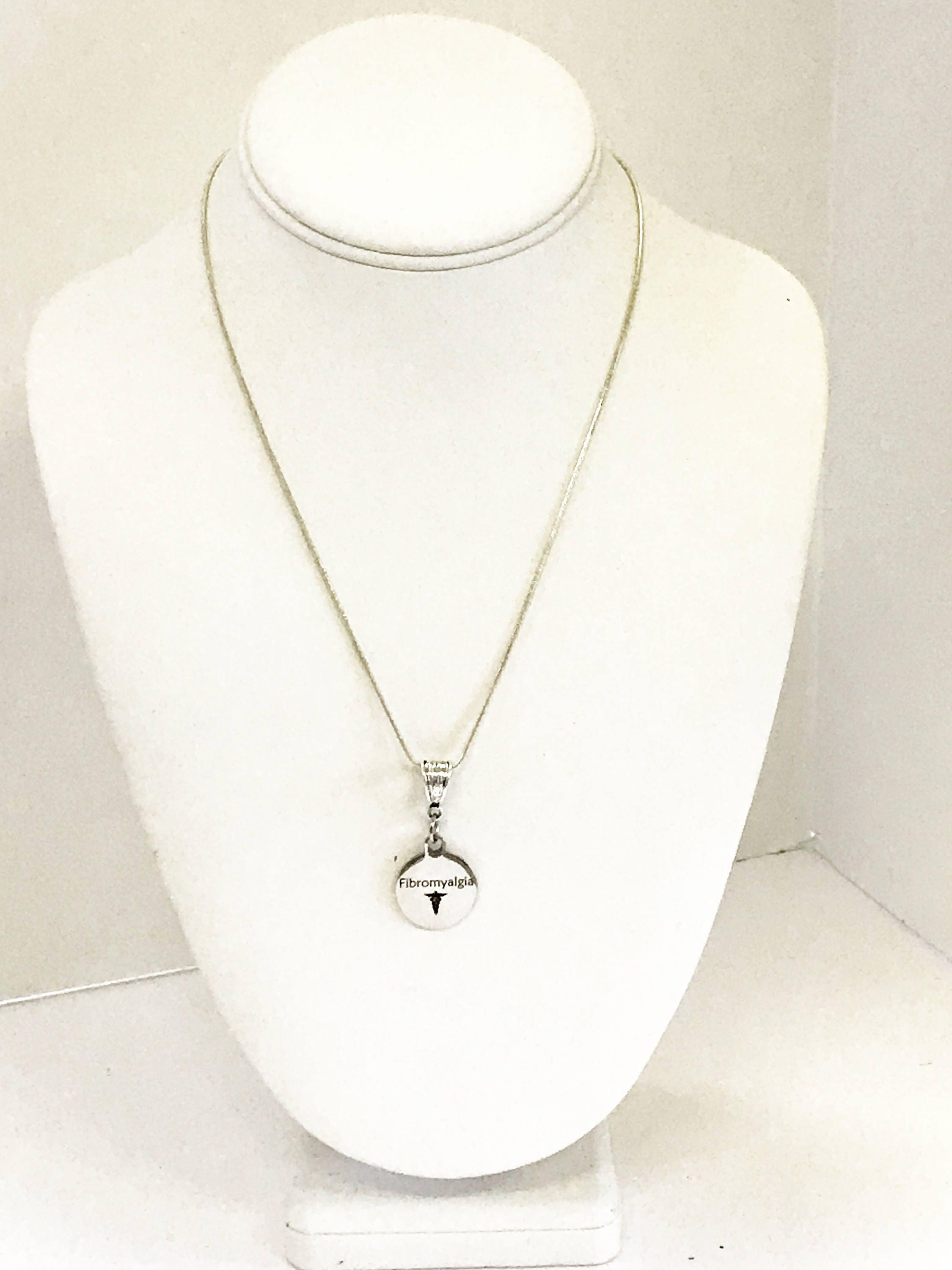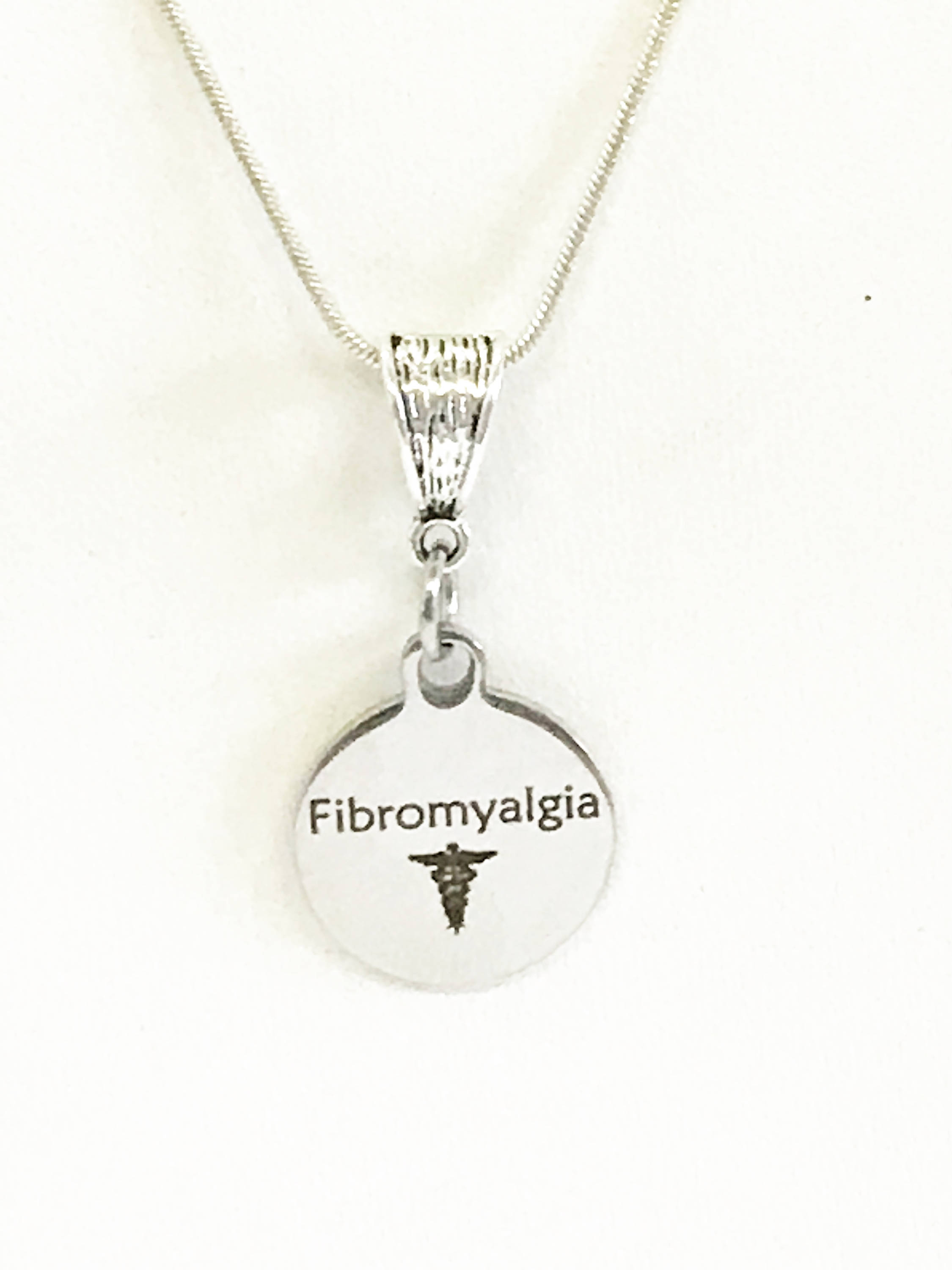 Necklace as shown with hand-stamped Aicha name charm behind the Fibromyalgia charm on an 18 inch silver plated snake chain necklace.