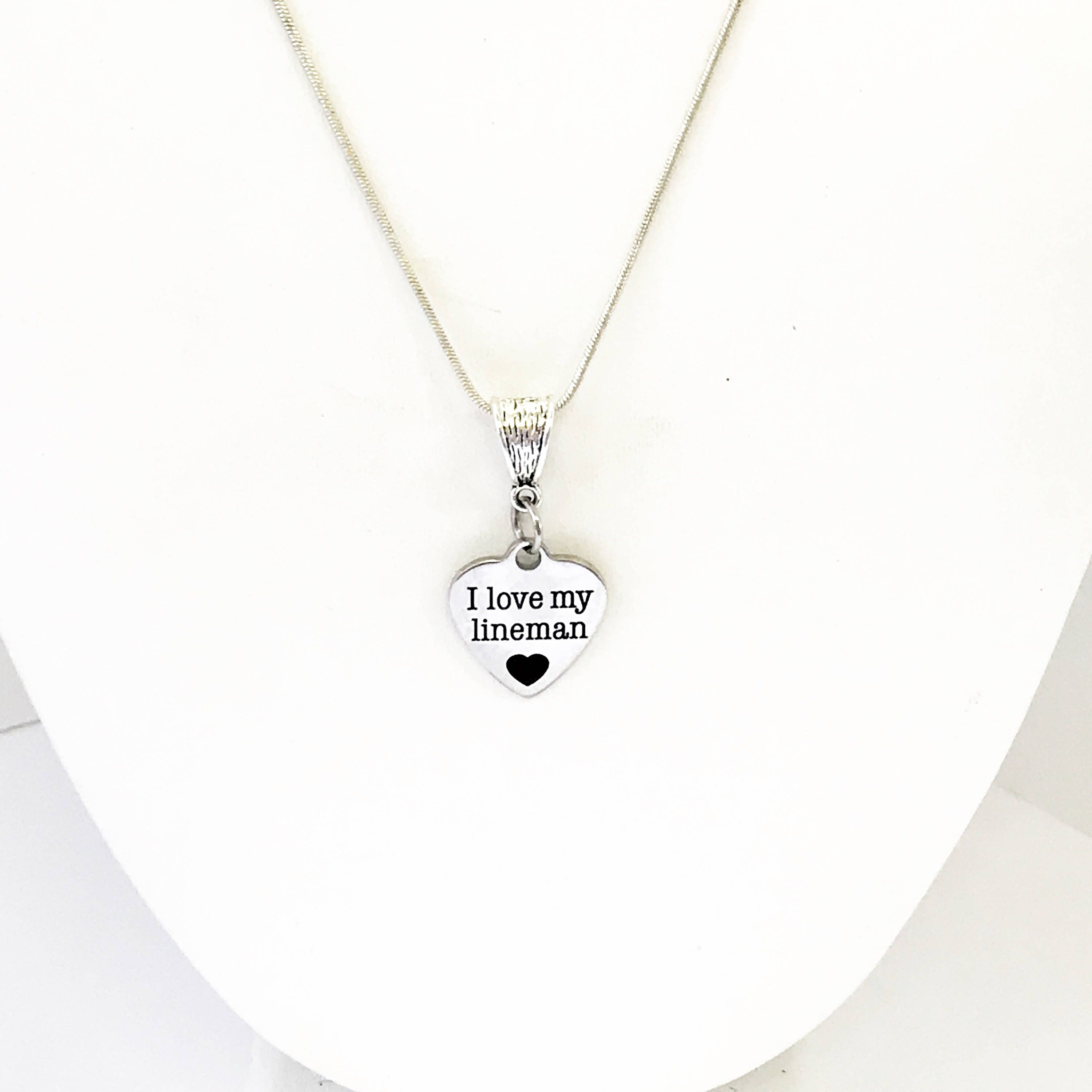 This is a beautiful stainless steel laser engraved pendant with "I love my lineman" on your choice of a 16, 18, 20, 22, 24, 26, 28 or 30 inch sterling silver plated snake chain. This would make a great way to support and celebrate your lineman!