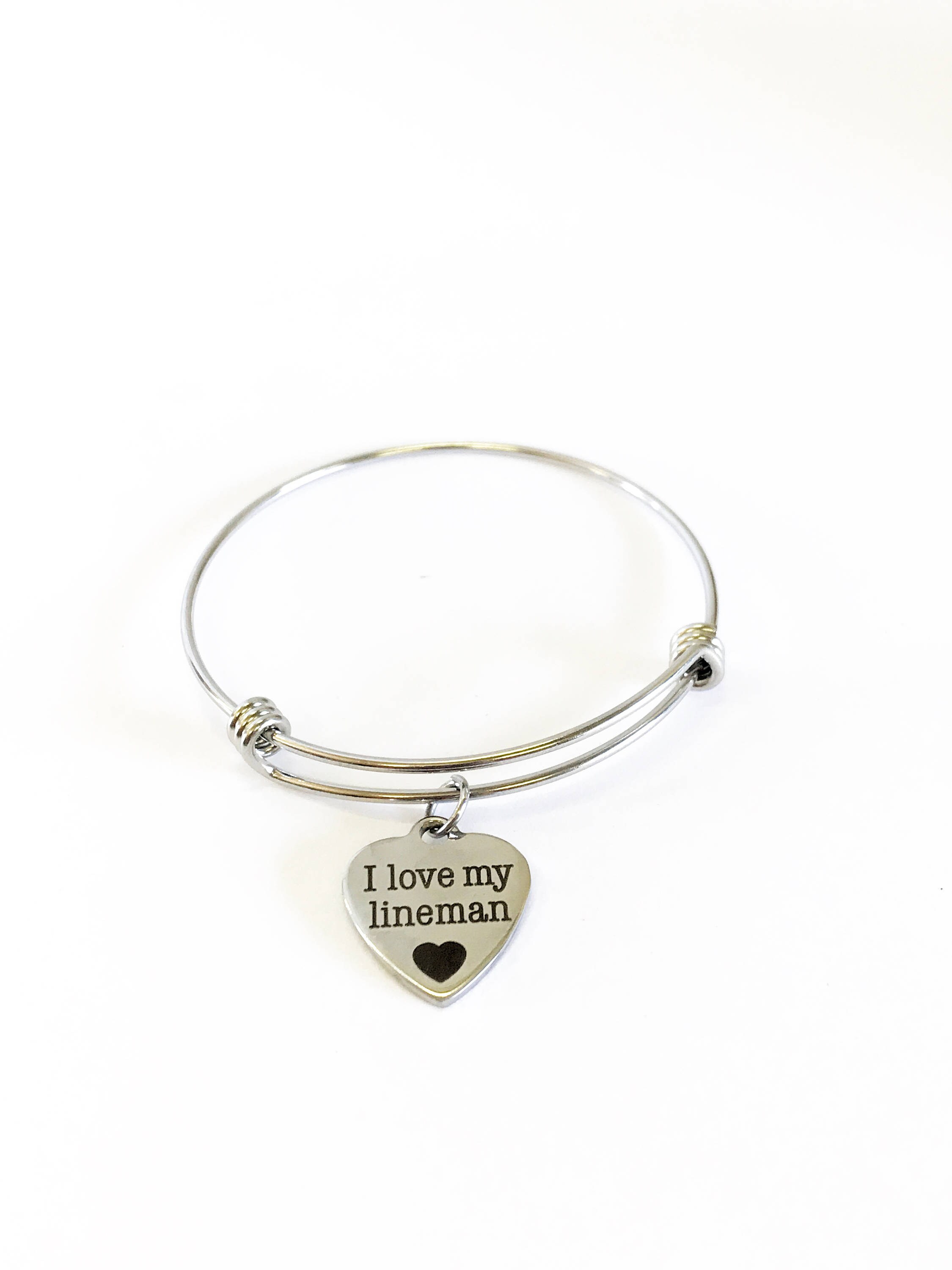 This is a beautiful bangle bracelet with a laser engraved stainless steel charm that has "I love my lineman" on it. All components are made of high quality stainless steel so there is no worry of tarnish or color changing.