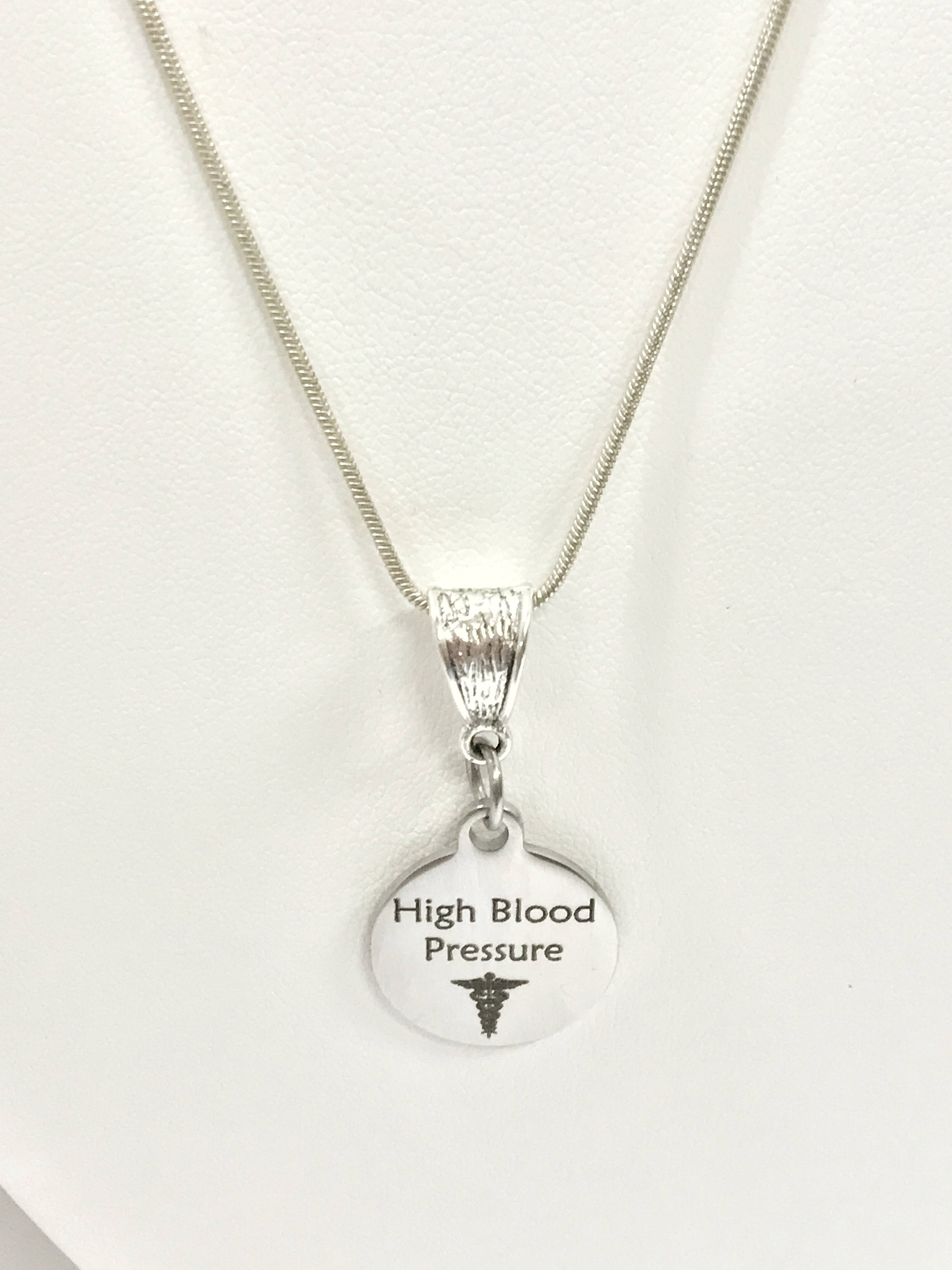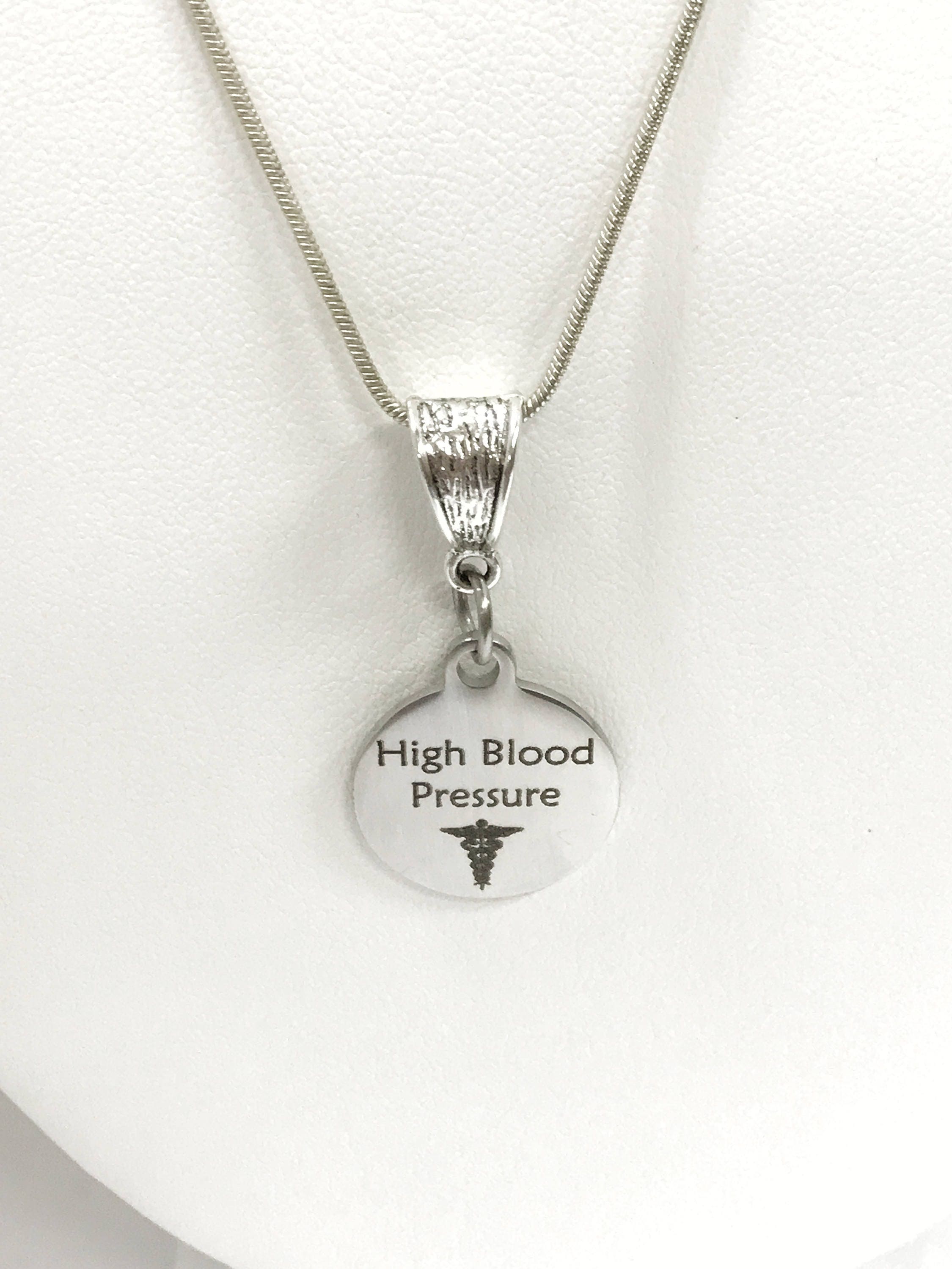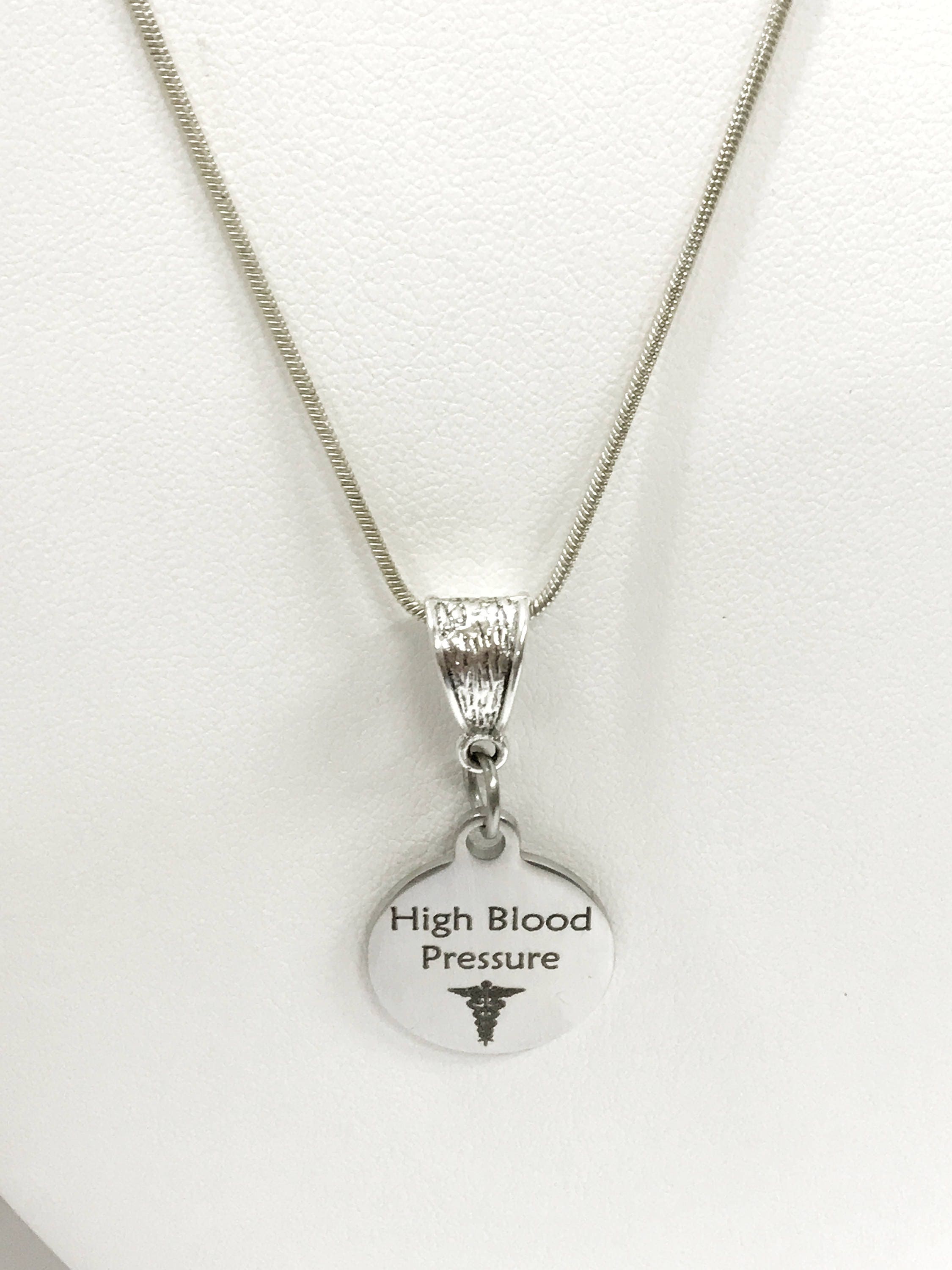 This is a stainlses steel laser engraved pendant on a silver plated chain. The pendant has a High Blood Pressure medical condition symbol on it. This pendant is available on your choice of 16, 18, 20, 22, 24, 26, 28 or 30 inch sterling silver plated chain. The pendant is also available for individual purchase if you have another chain on which you would like to wear it.