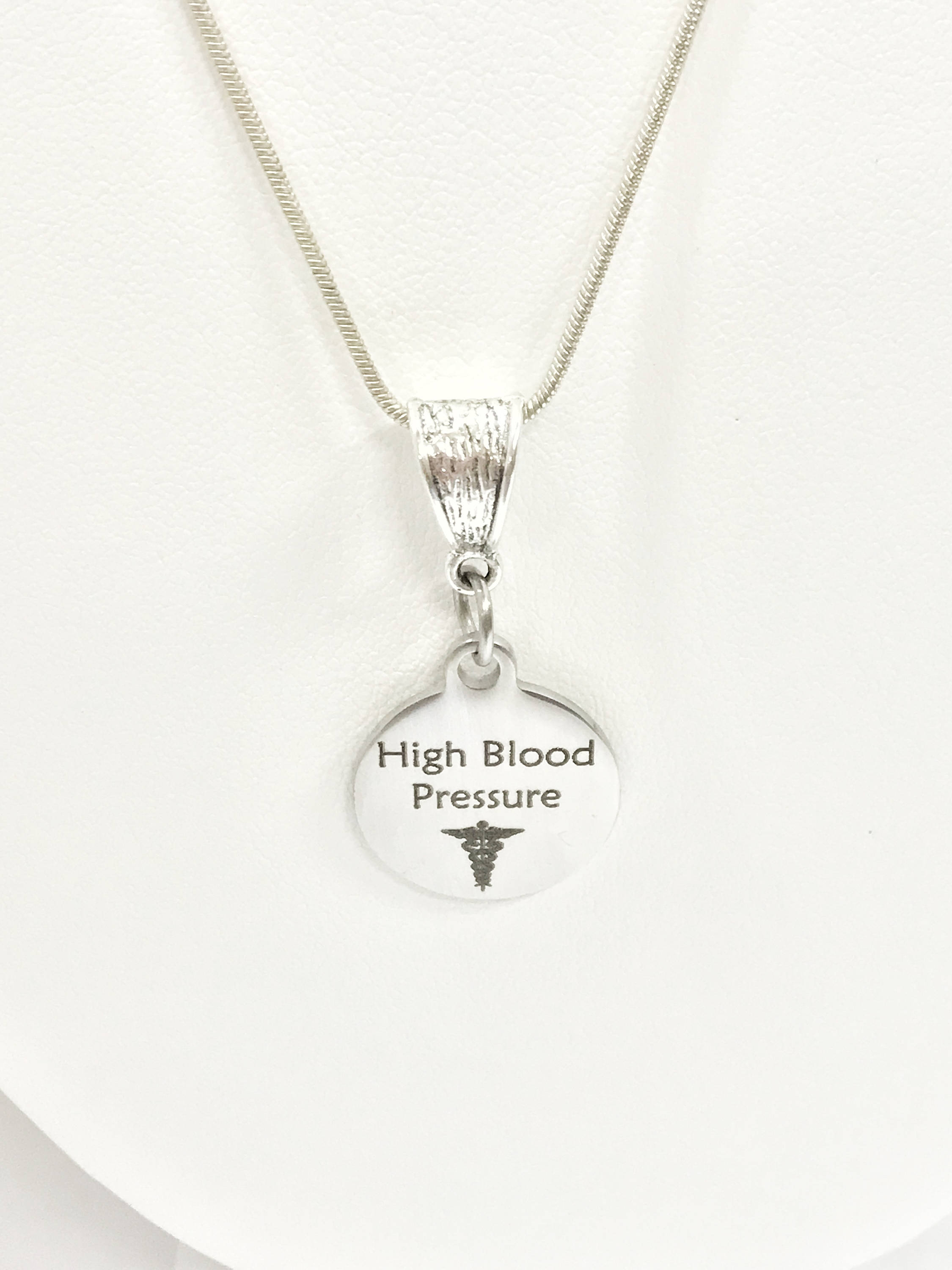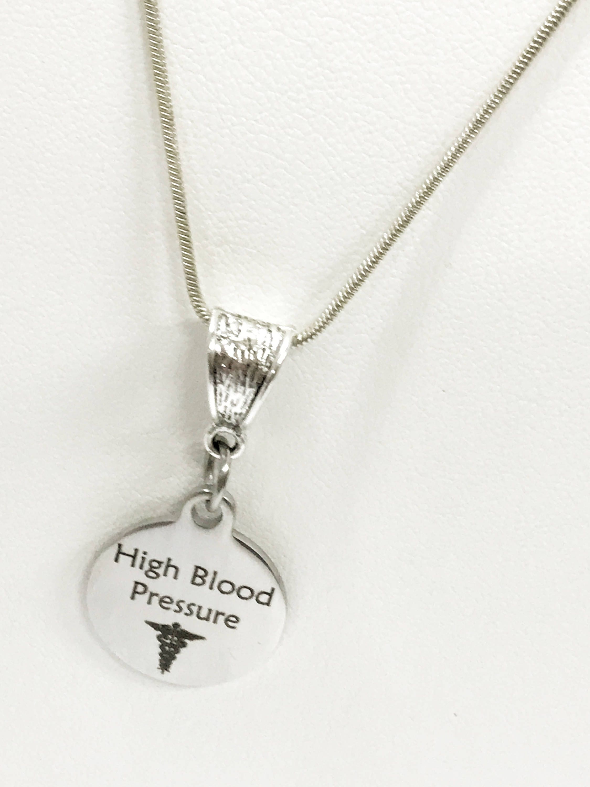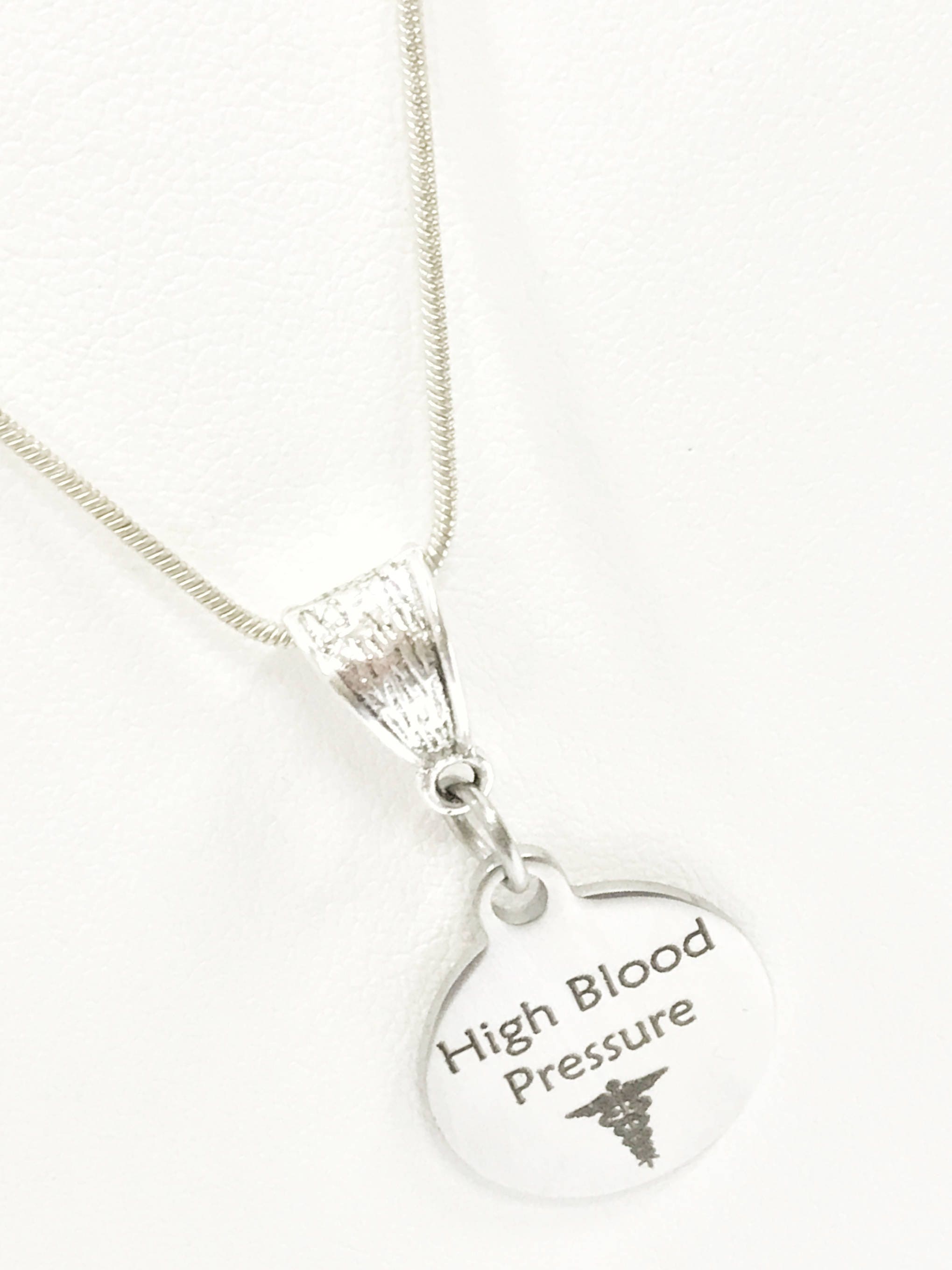 This is a stainlses steel laser engraved pendant on a silver plated chain. The pendant has a High Blood Pressure medical condition symbol on it. This pendant is available on your choice of 16, 18, 20, 22, 24, 26, 28 or 30 inch sterling silver plated chain. The pendant is also available for individual purchase if you have another chain on which you would like to wear it.